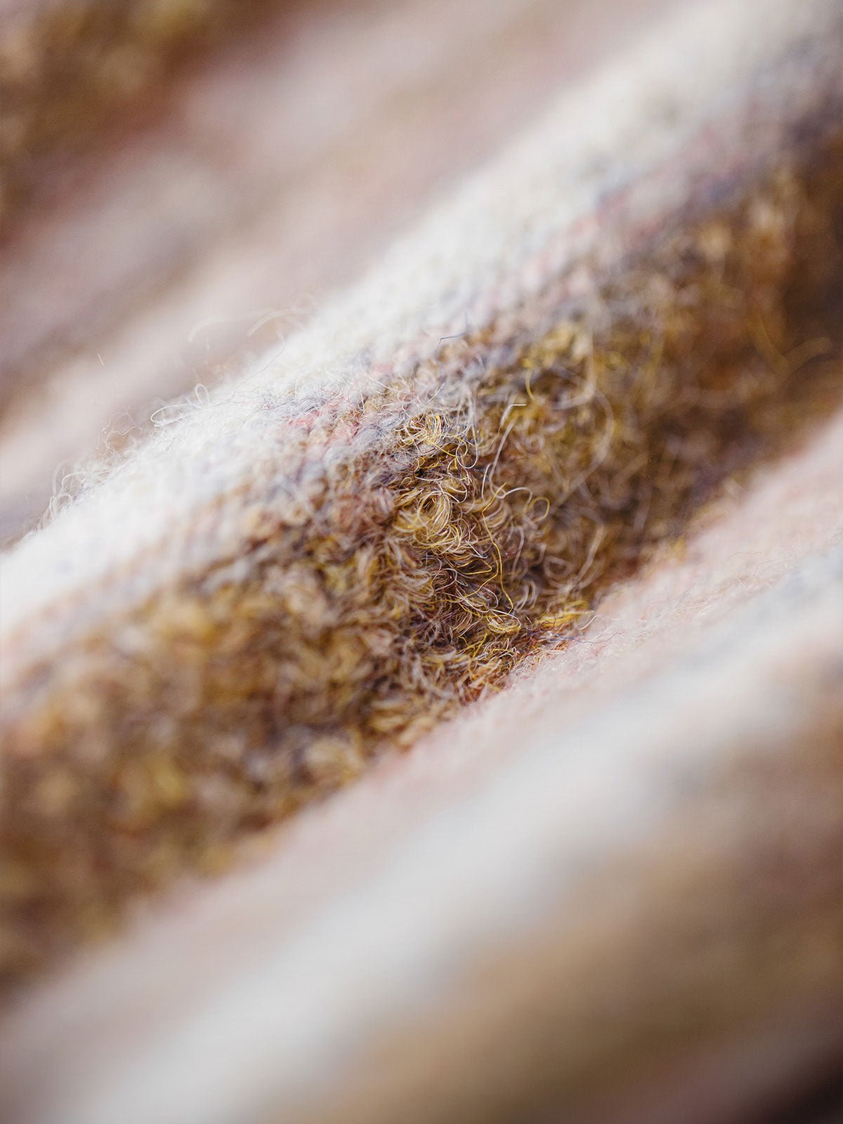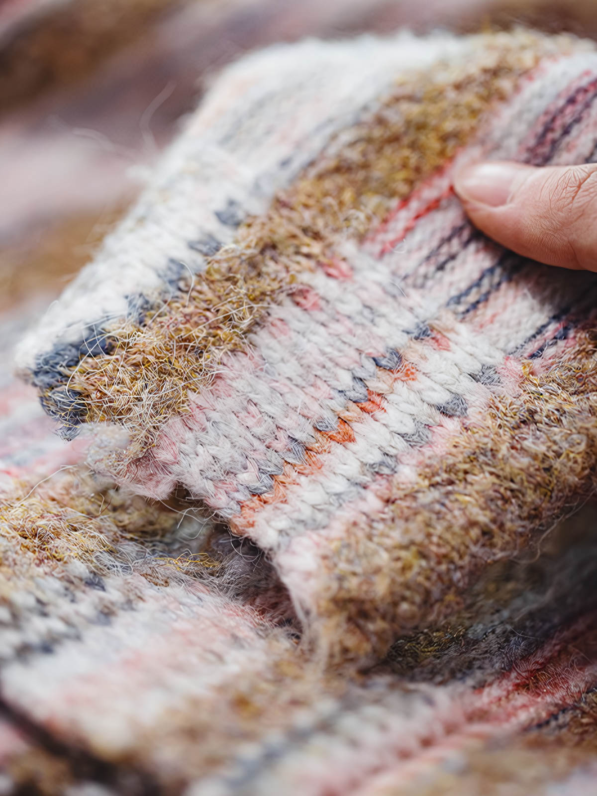カーディガンは柔らかくて保温性の高い毛糸を選んでおり、暖かさを提供しつつお手入れも容易です。ストライプパターンは異なる色の間で柔らかな変化を見せ、パターンの全体的な美しさを保つために高度な編み技術が必要かもしれません。