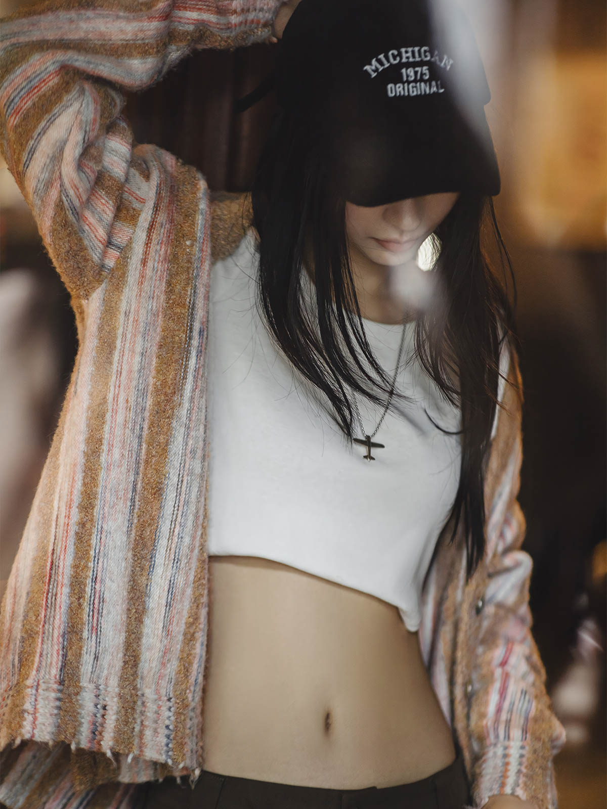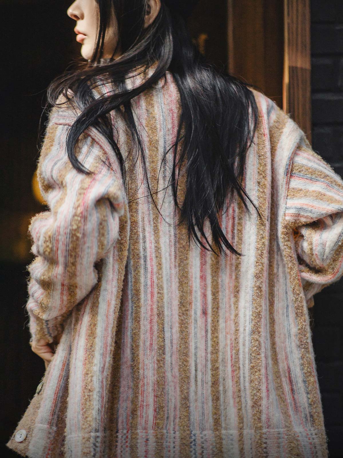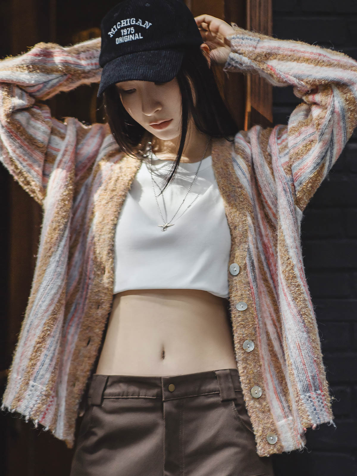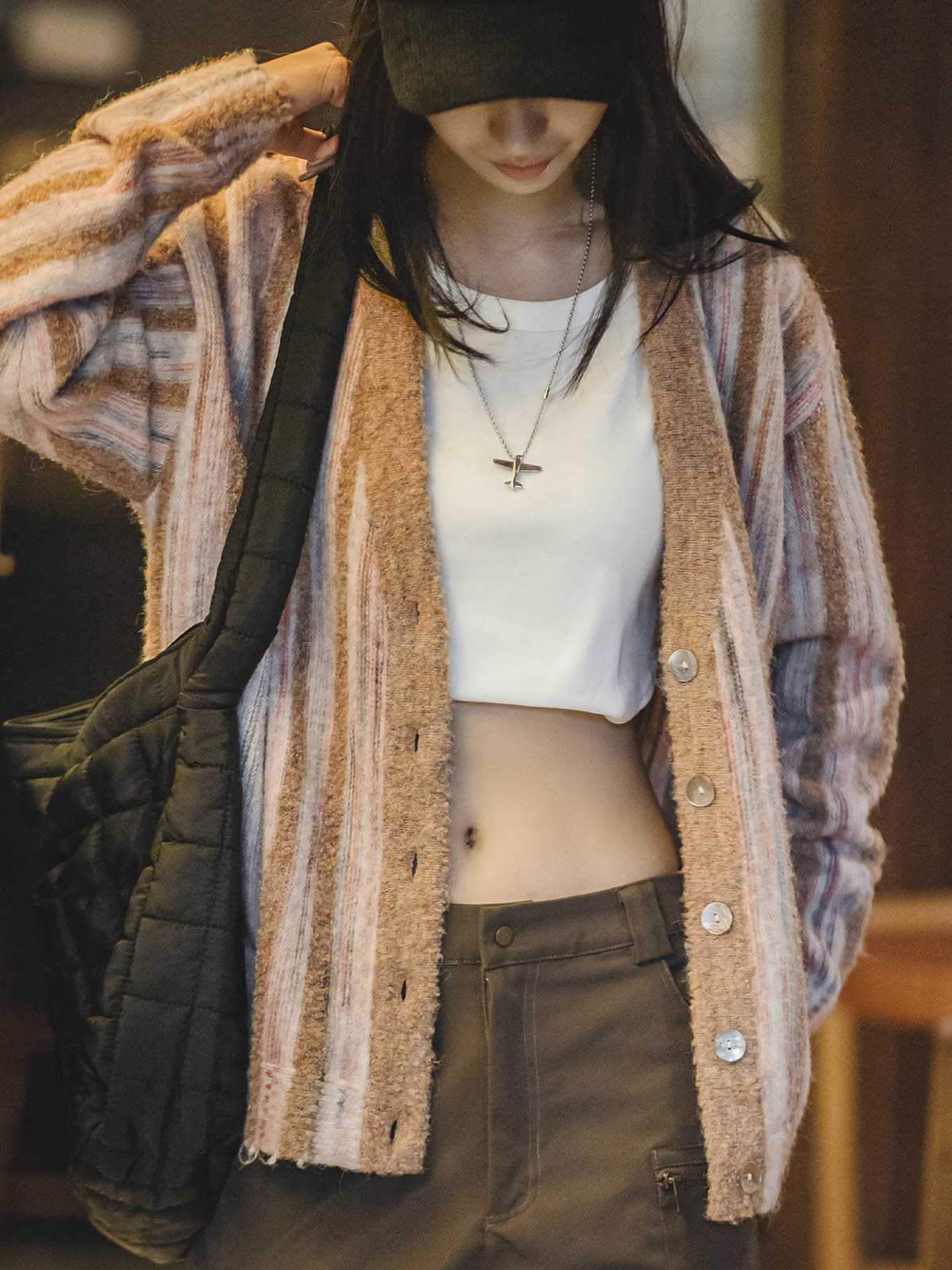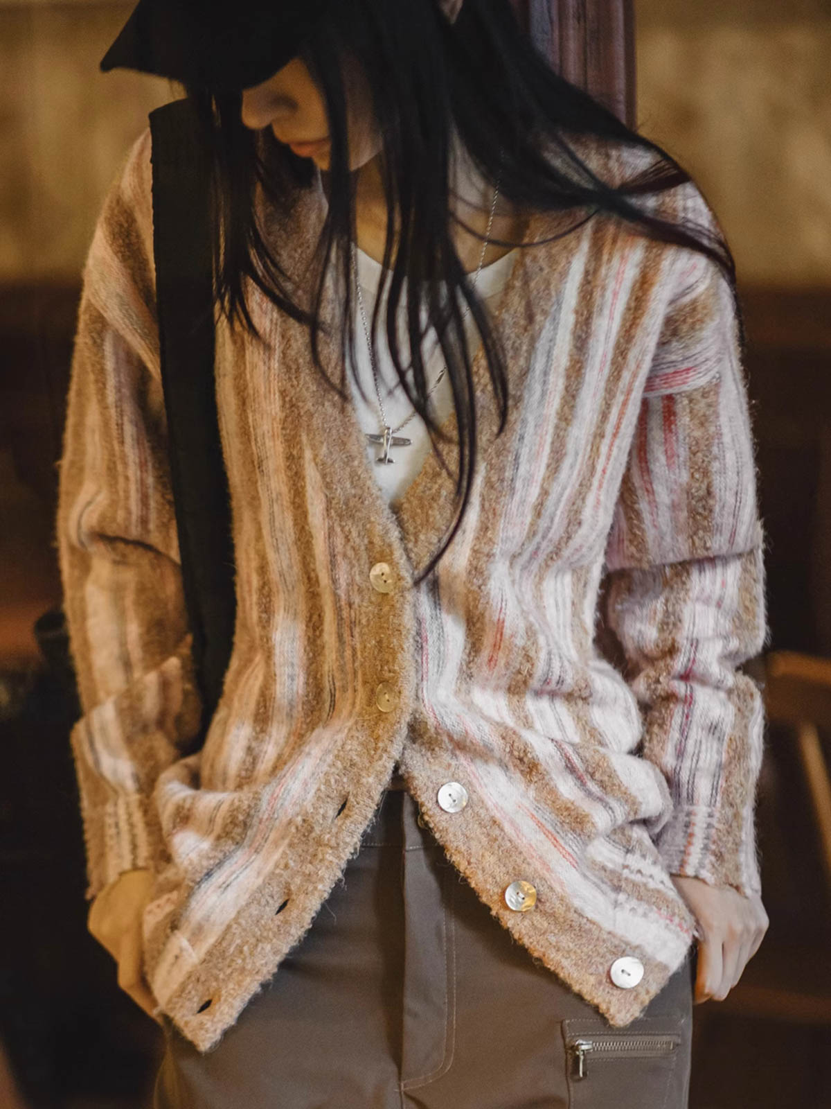 ファッションスタイルで見られます。ストライプの色合いと配置には、絵画のような芸術的な感覚があり、カジュアルでありながらもファッショナブルなデザインコンセプトを反映しています。カーディガンはアウターとしても単品としても着用可能で、着こなしの柔軟性を高めています。