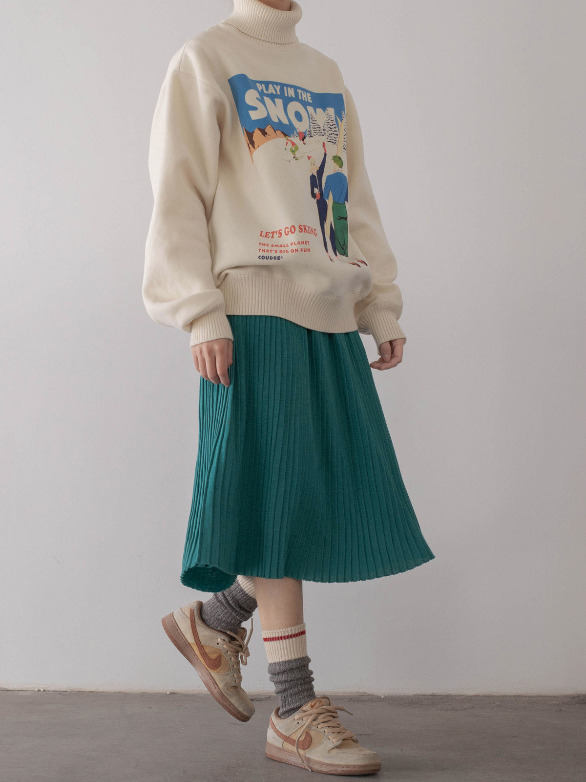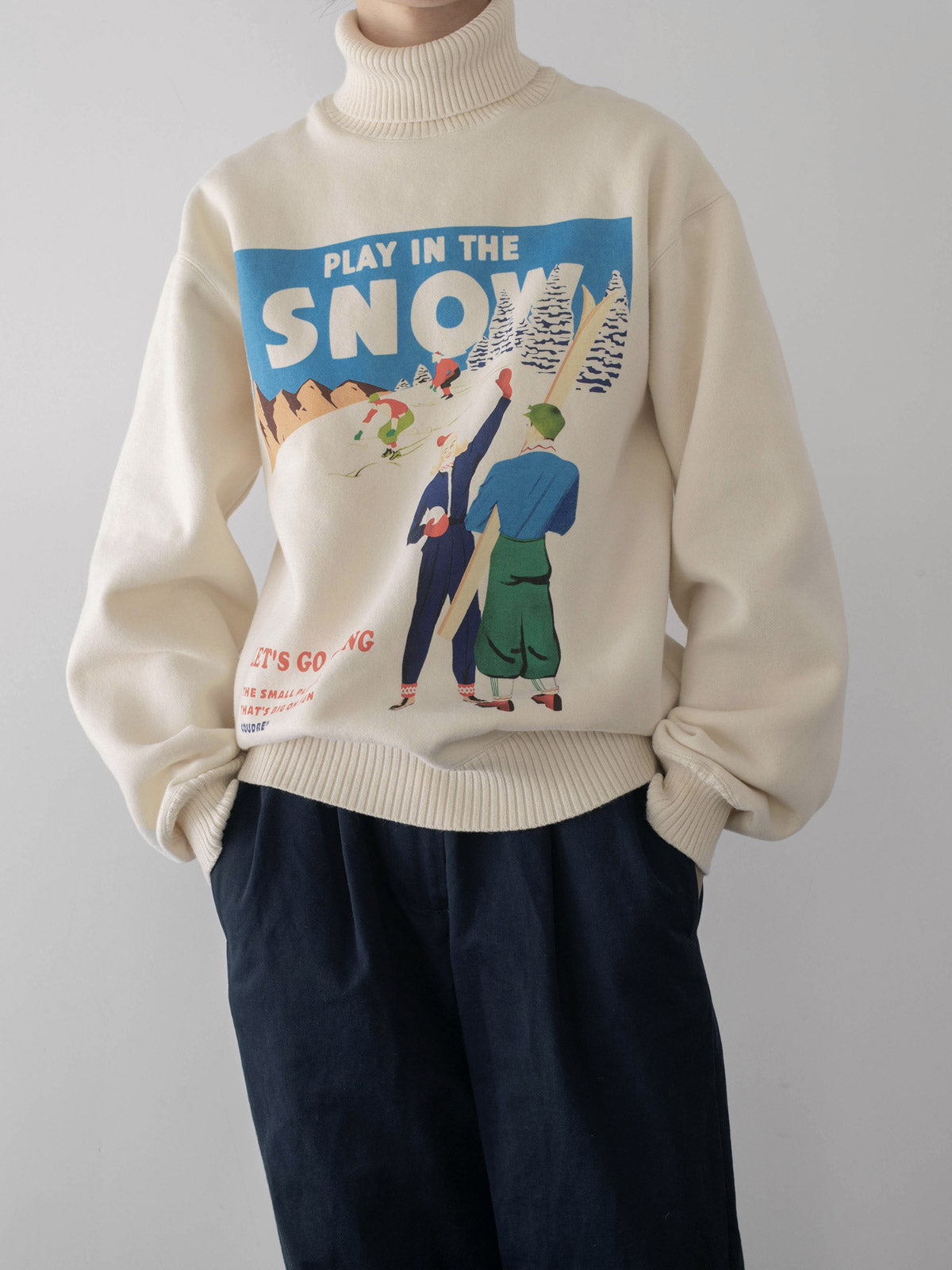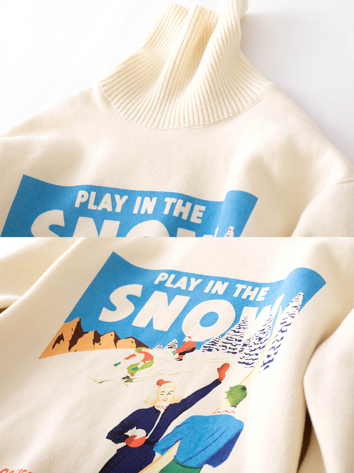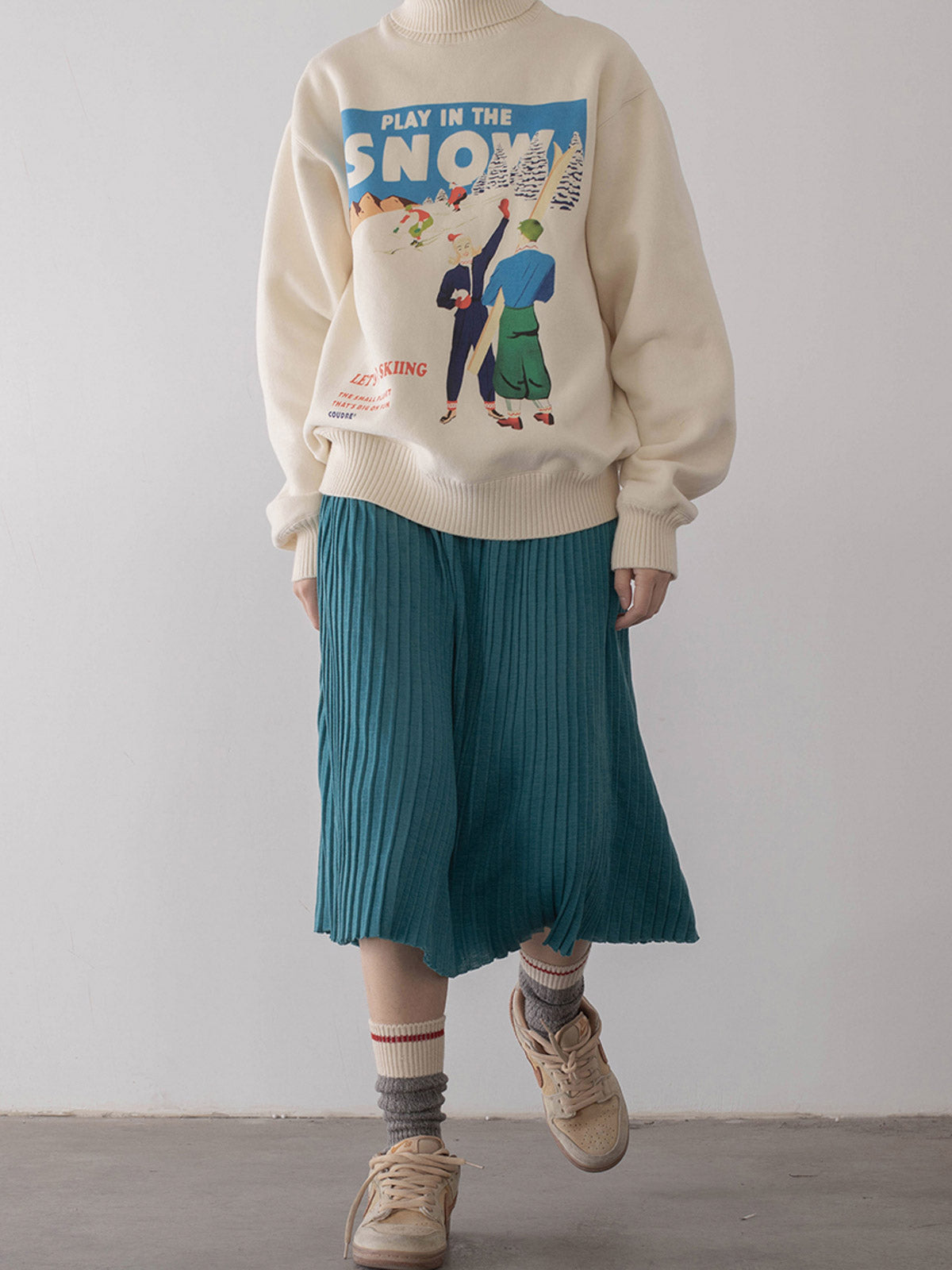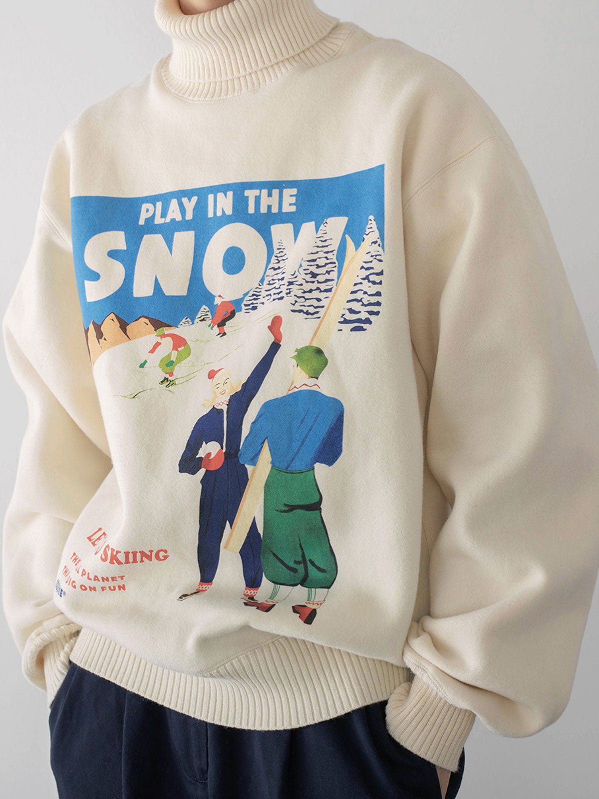 このハイネックセーターは、活力に満ちたレトロなスキーテーマのプリントを展示しています。屋外活動とノスタルジックなスキーリゾートの雰囲気を伝え、当時のカジュアルカルチャーと冬の楽しみへの追求を反映しています。