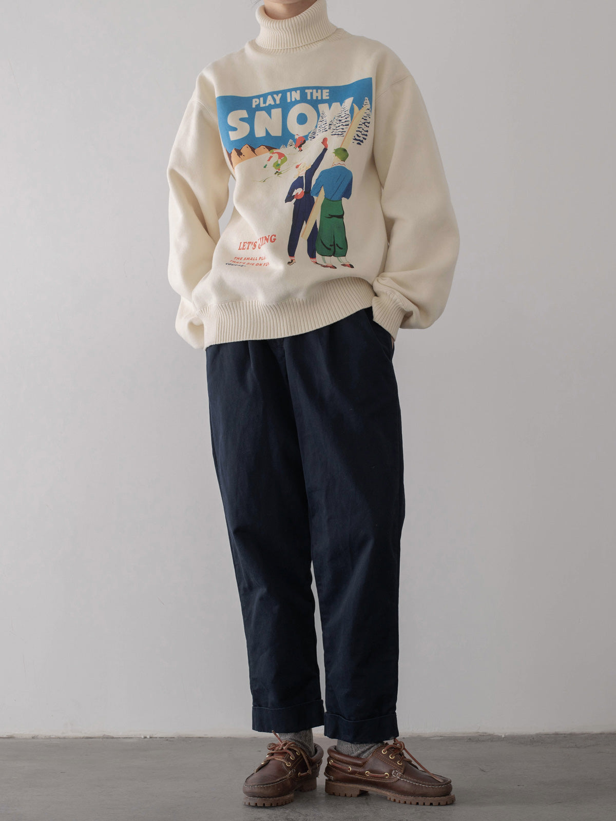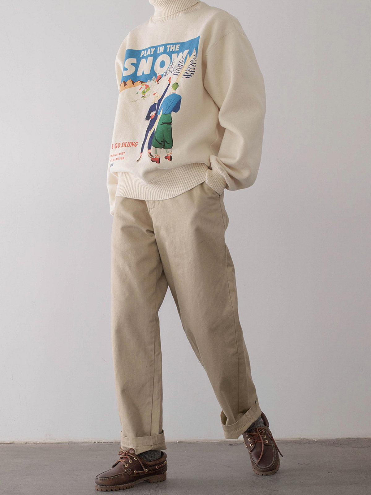 このセーターは、シンプルなジーンズやカジュアルパンツと組み合わせ、スニーカーやスキーブーツで冬のカジュアルなスタイリングを完成させます。色合いでは、上半身のプリントをバランス良くするために、中性色やダークトーンのボトムスをお勧めします。