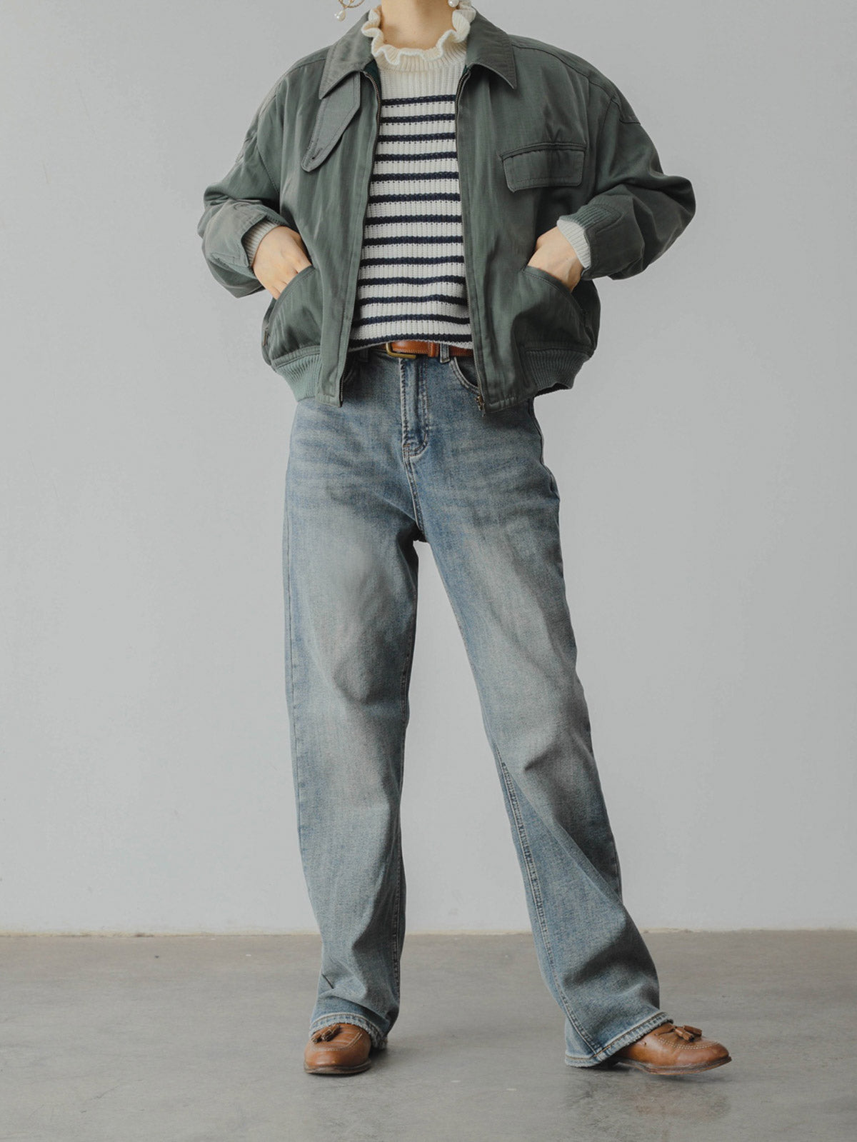 このジャケットは、ハイウエストパンツやスニーカーと合わせて、現代とレトロが融合したストリートスタイルを演出します。内側にパターンのあるTシャツやシンプルなニットを選ぶことで、ファッション性と快適さを一層強調できます。
