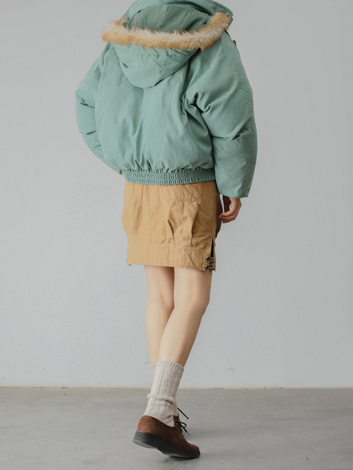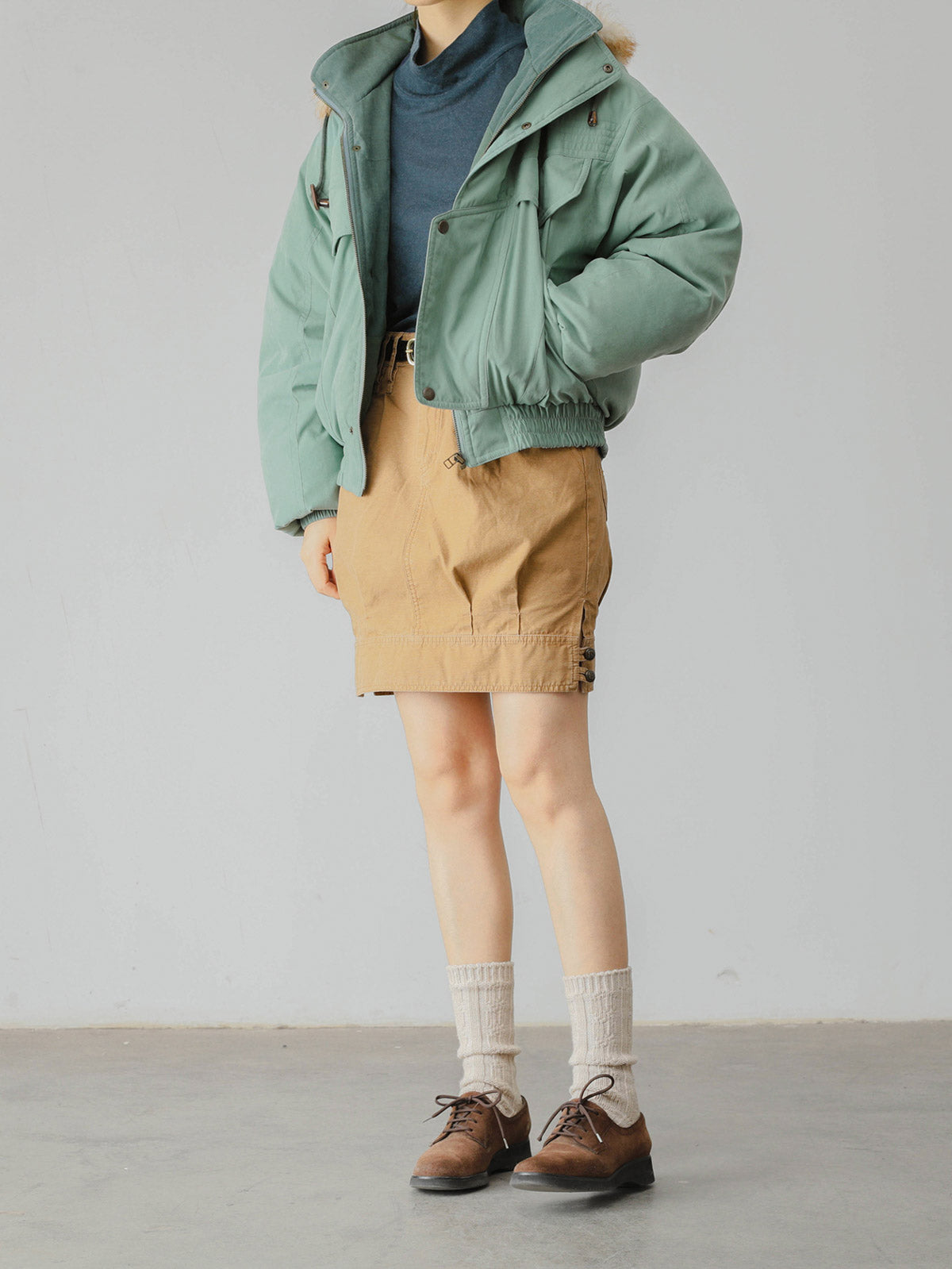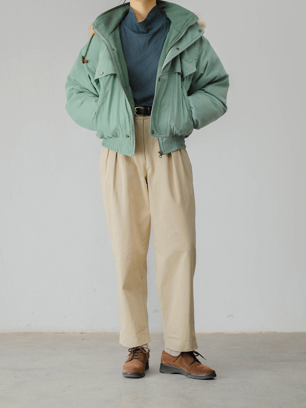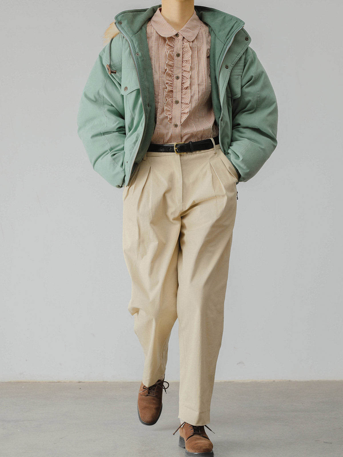 このジャケットは、モーターサイクルジャケットのクラシックなデザインと現代のダウンウェアの暖かさを組み合わせています。パリグリーンという独特の色の選択は、伝統的なモーターサイクルジャケットに新しいファッションの息吹をもたらし、同時にレトロファッションの現代的な解釈を体現しています。