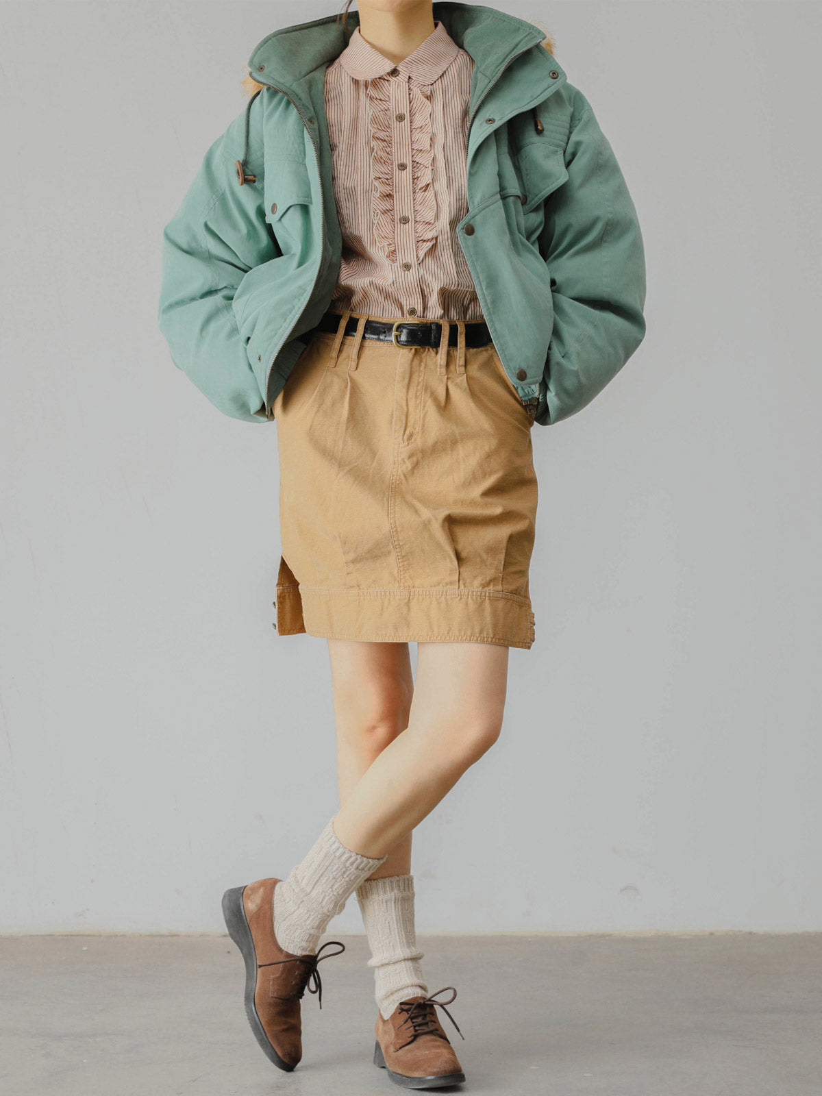 このダウンジャケットは、ジーンズやカジュアルパンツ、シンプルなTシャツやセーターと合わせると良いでしょう。靴はカジュアルなスニーカーやショートブーツを選び、リラックスしたが洗練された冬のスタイルを完成させます。