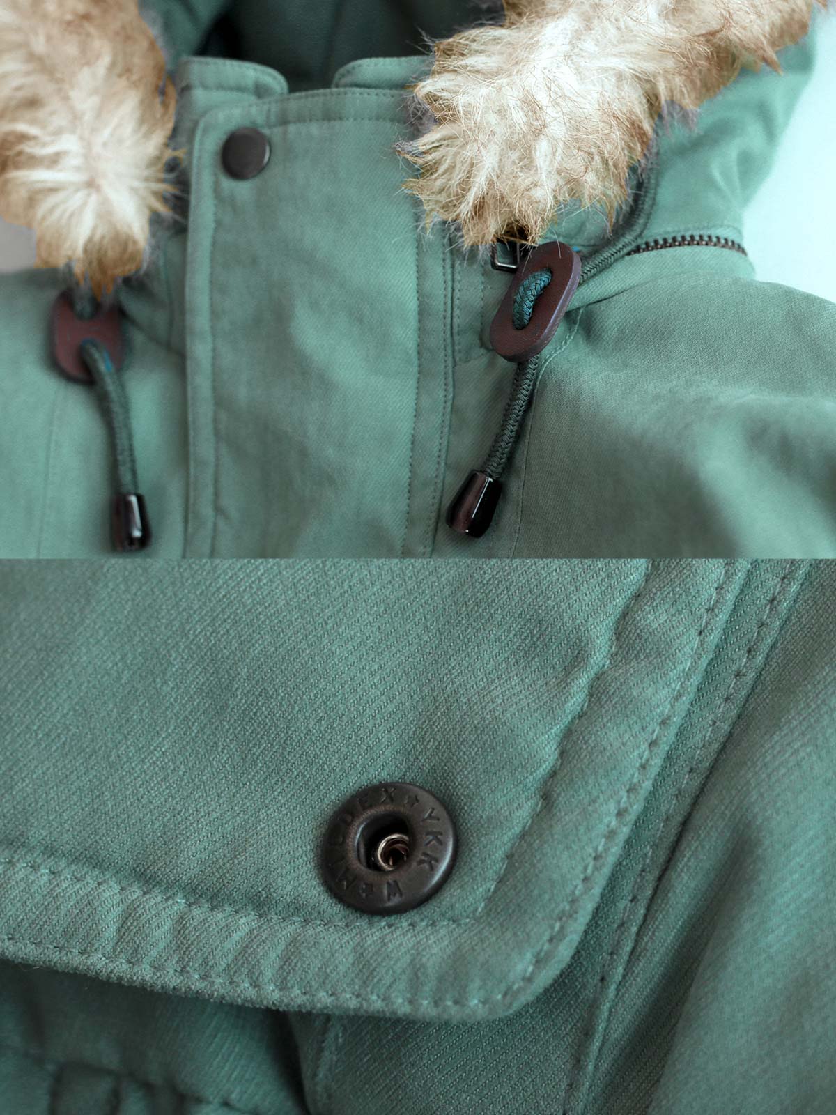 ジャケットには高品質のダウンを充填材として使用し、暖かさと軽さを両立しています。耐久性のある素材で作られた外殻は防風性に優れ、アウトドアに適しています。首元にある快適なウールの裏地が豪華さを加えています。