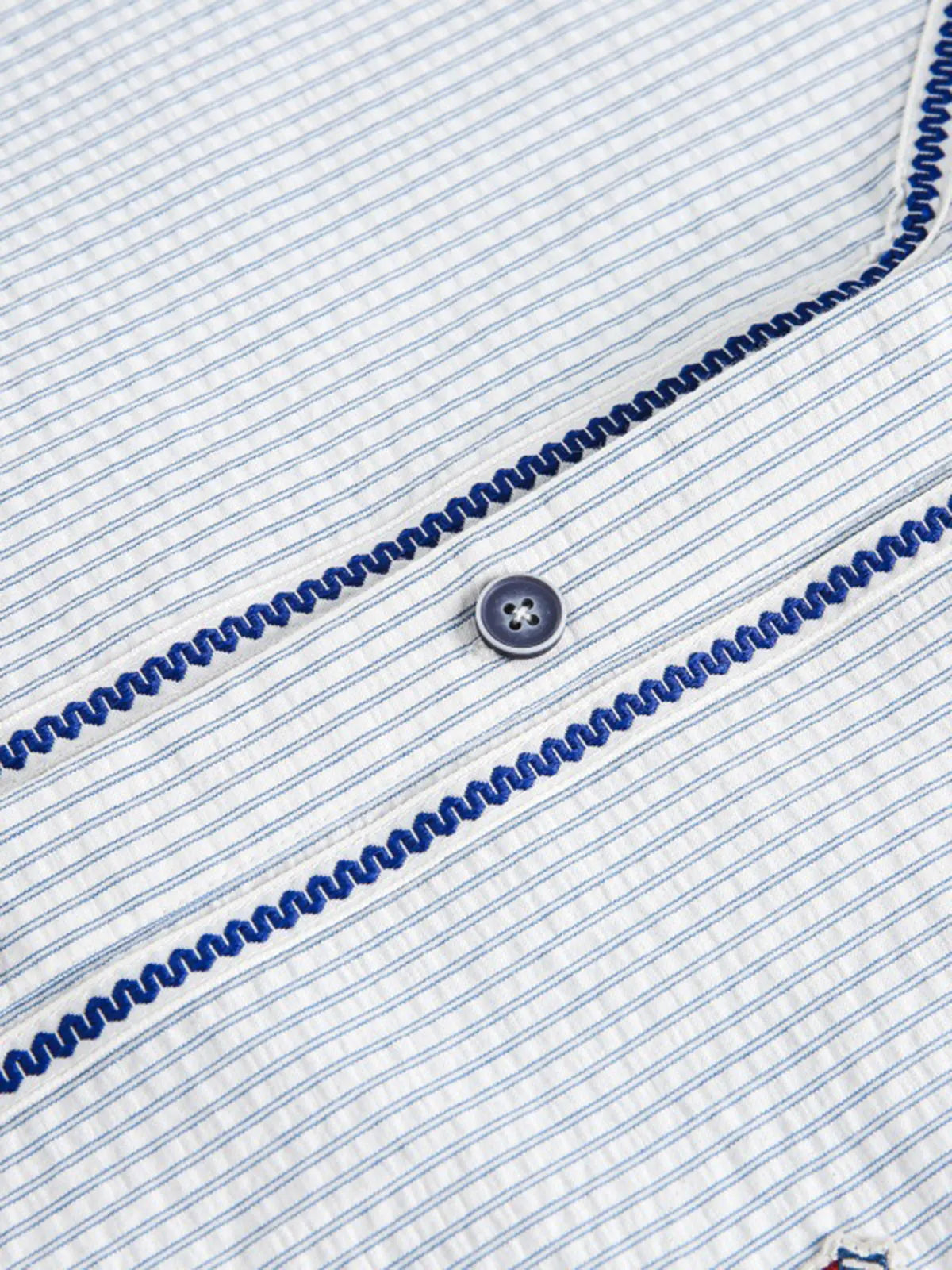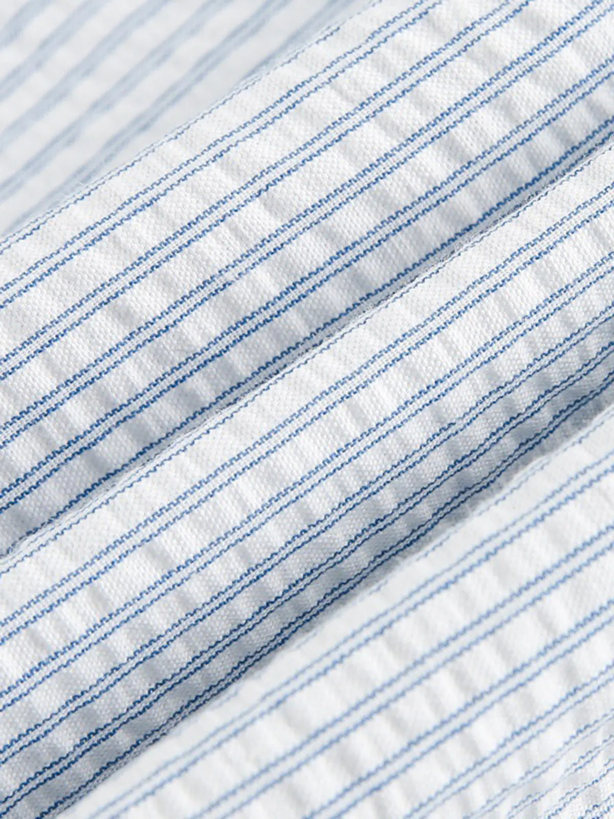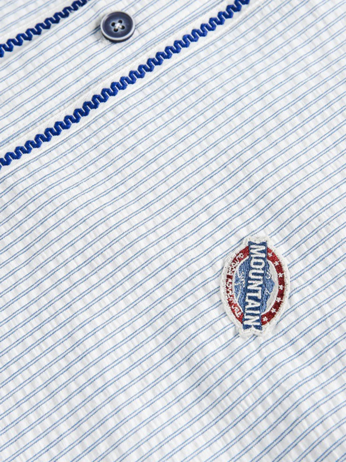 100%コットンのシアサッカー生地は軽量で通気性に優れ、ストライプ柄が涼しげなアクセントに。Vネックの開襟と胸ポケットがスポーティな表情をプラスし、背面の「08」プリントで西海岸風のヴィンテージ感を演出。ドロップショルダーとボックスシルエットでリラックスした着心地を実現し、男女問わず幅広いコーデに馴染みます。