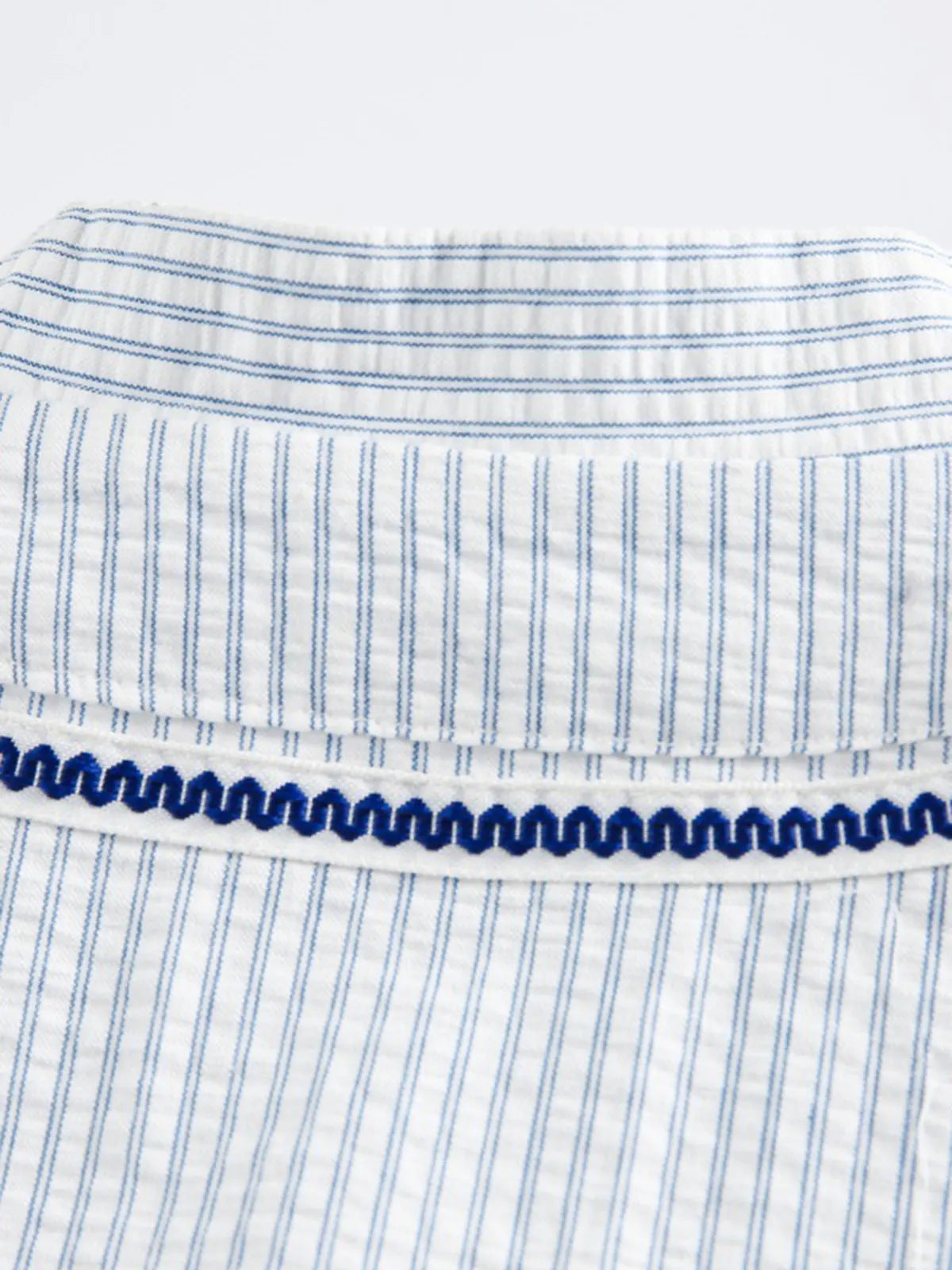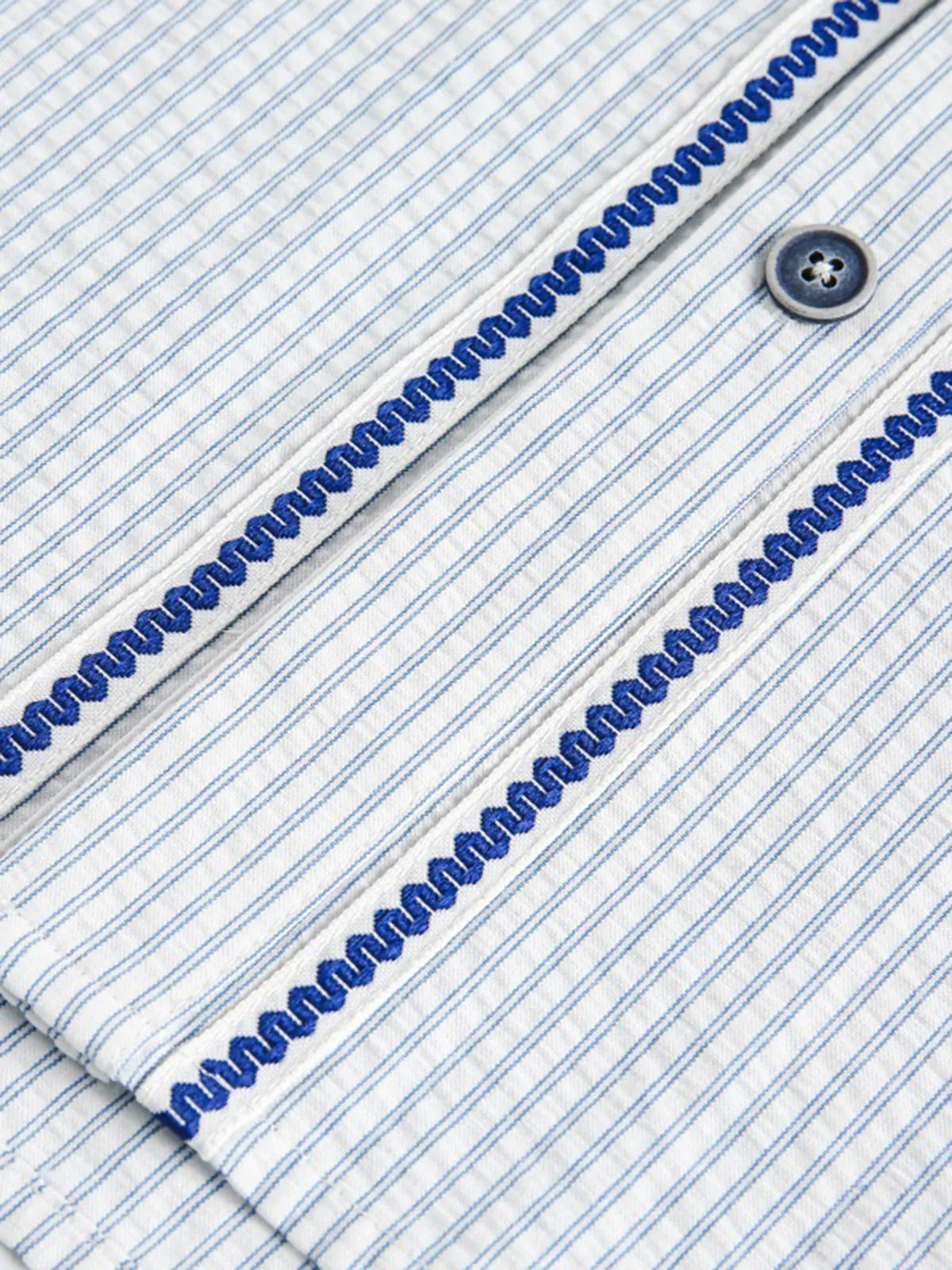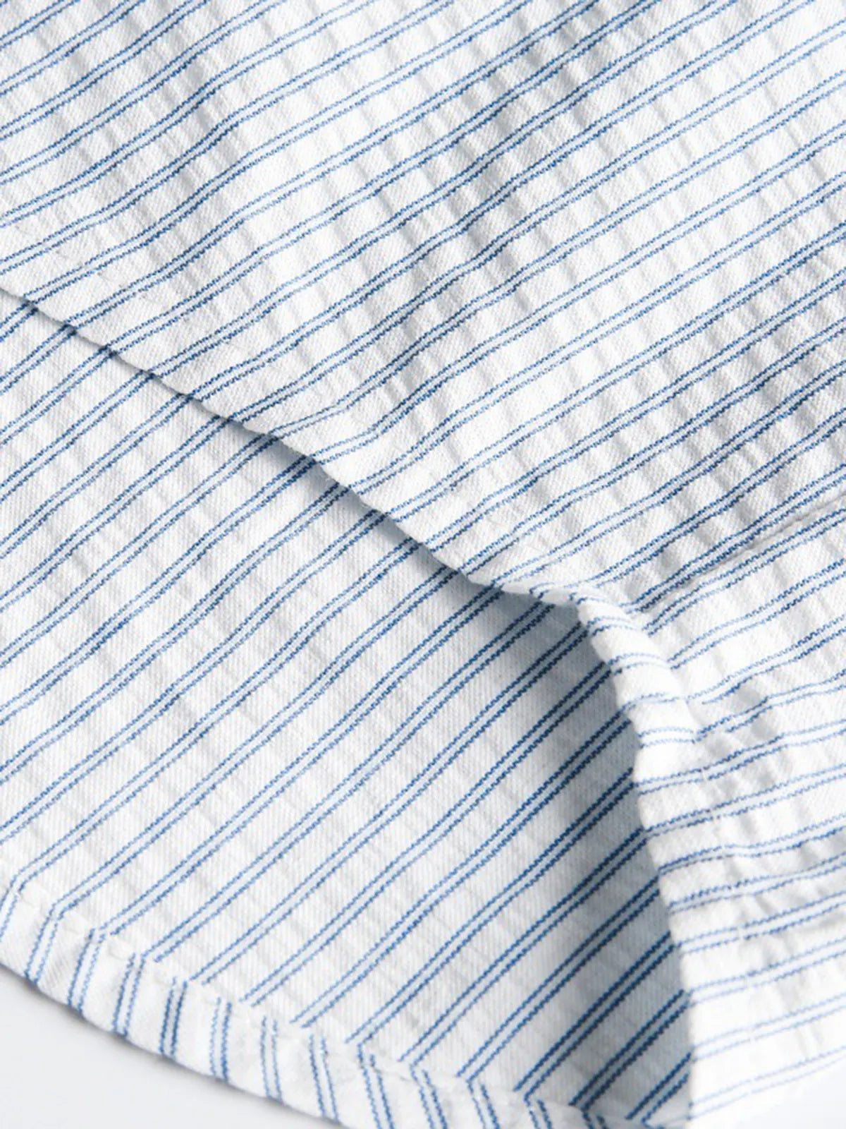 100%コットンのシアサッカー生地は軽量で通気性に優れ、ストライプ柄が涼しげなアクセントに。Vネックの開襟と胸ポケットがスポーティな表情をプラスし、背面の「08」プリントで西海岸風のヴィンテージ感を演出。ドロップショルダーとボックスシルエットでリラックスした着心地を実現し、男女問わず幅広いコーデに馴染みます。