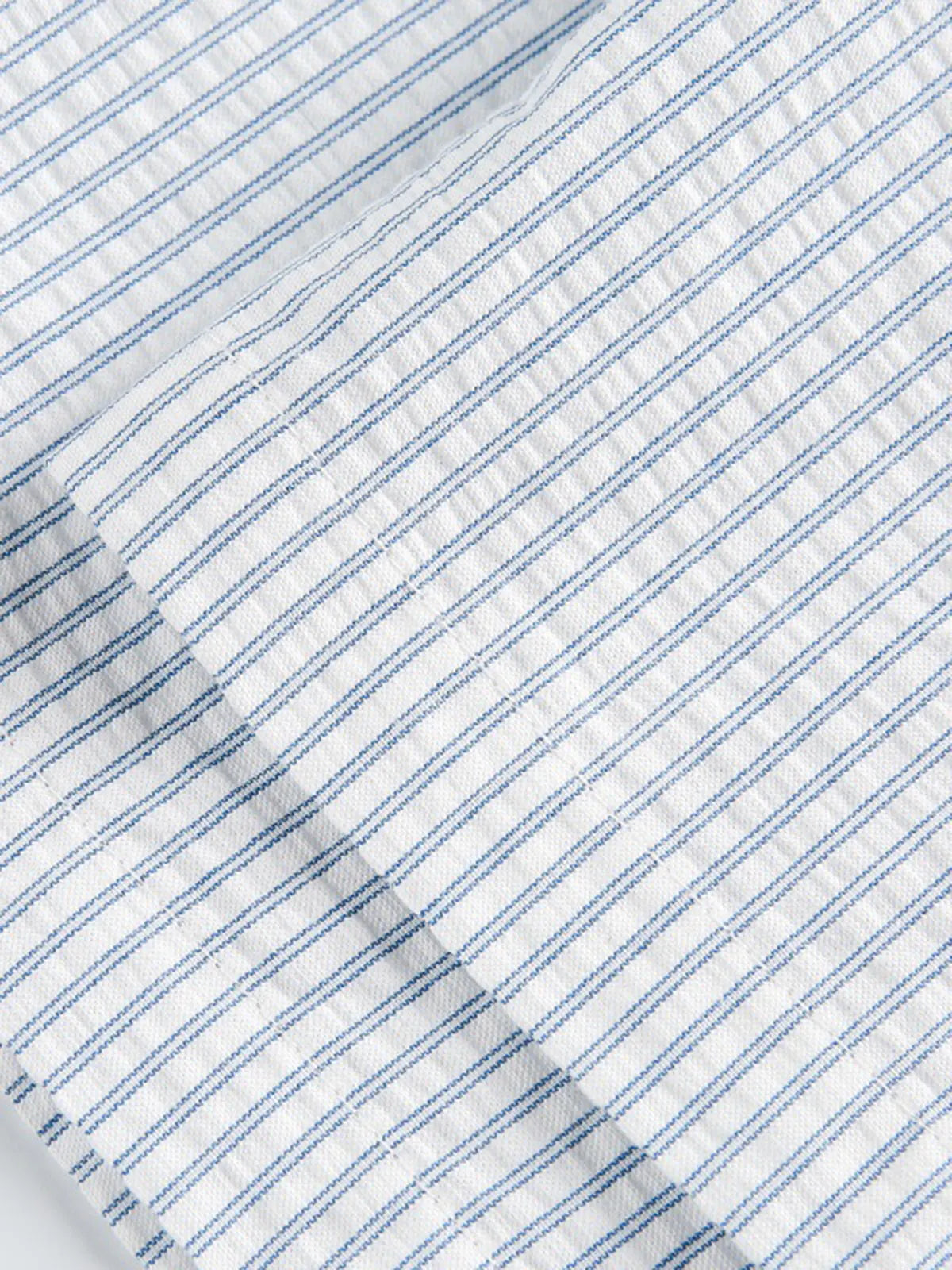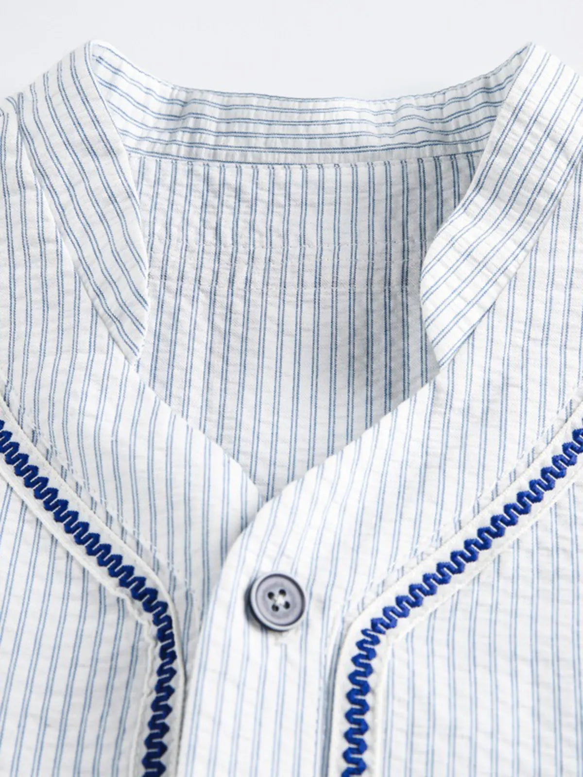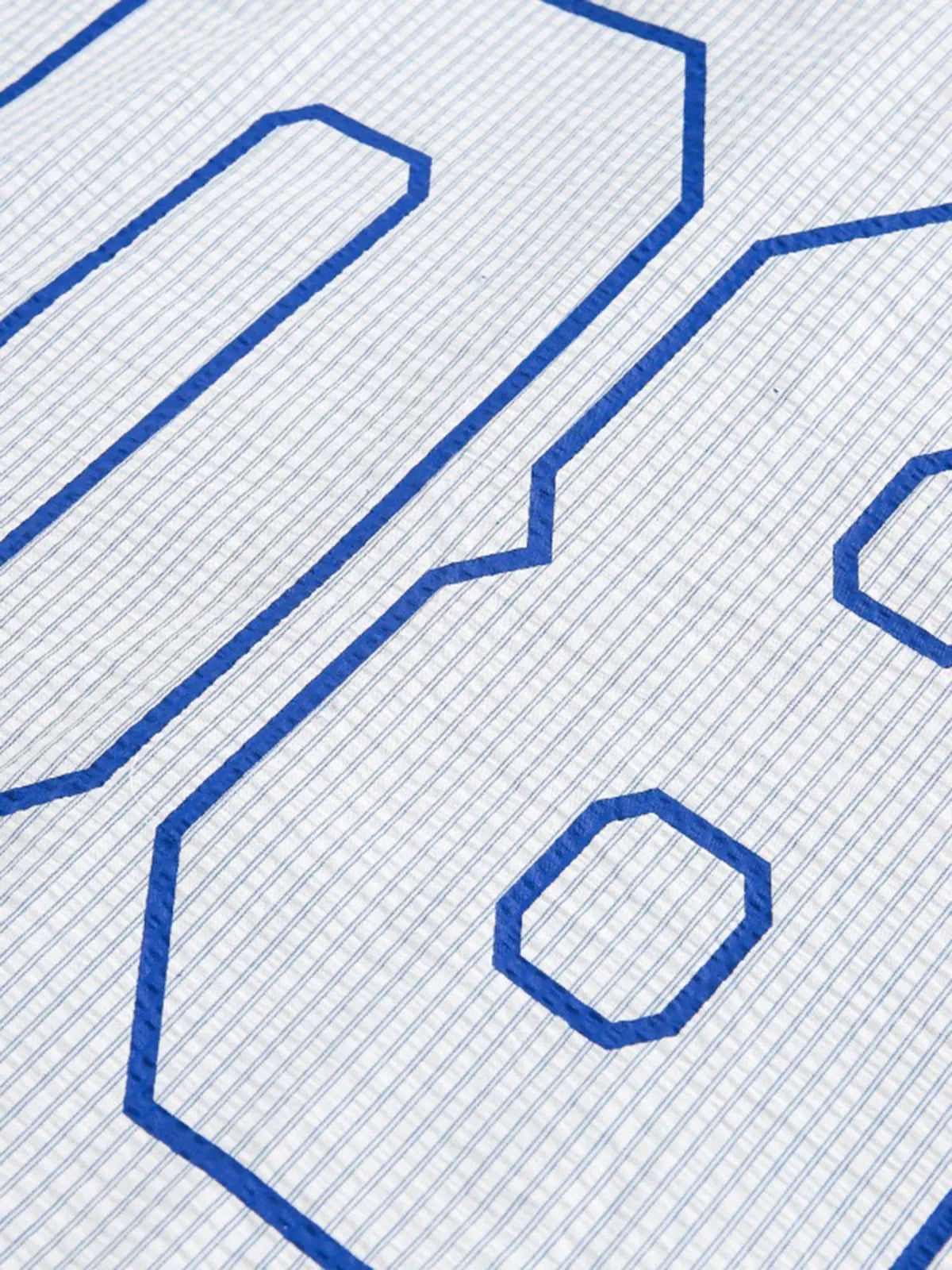 シアサッカーの凹凸感と背面「08」プリントが映える、ゆったりシルエットの夏向けベースボールシャツ。