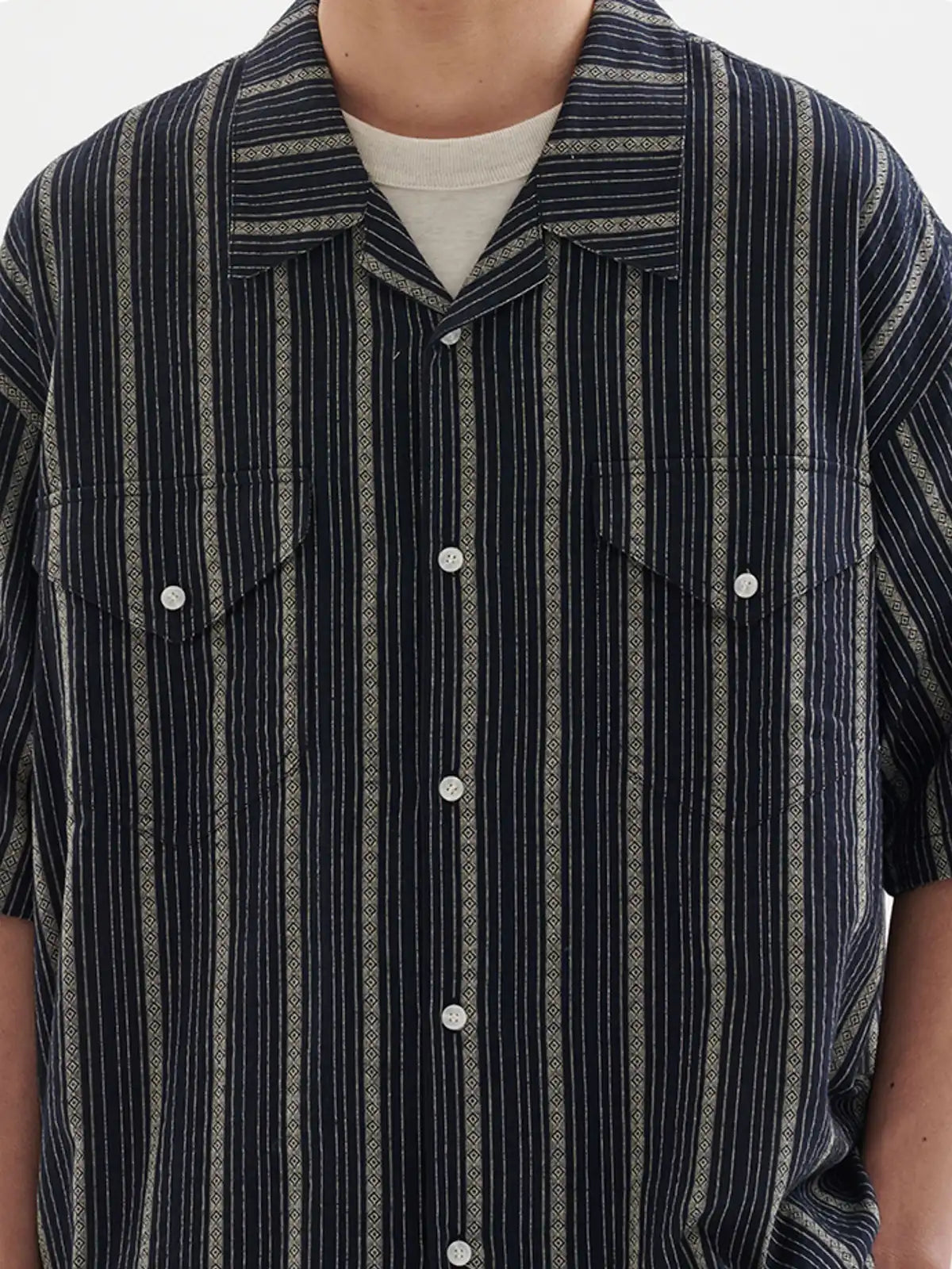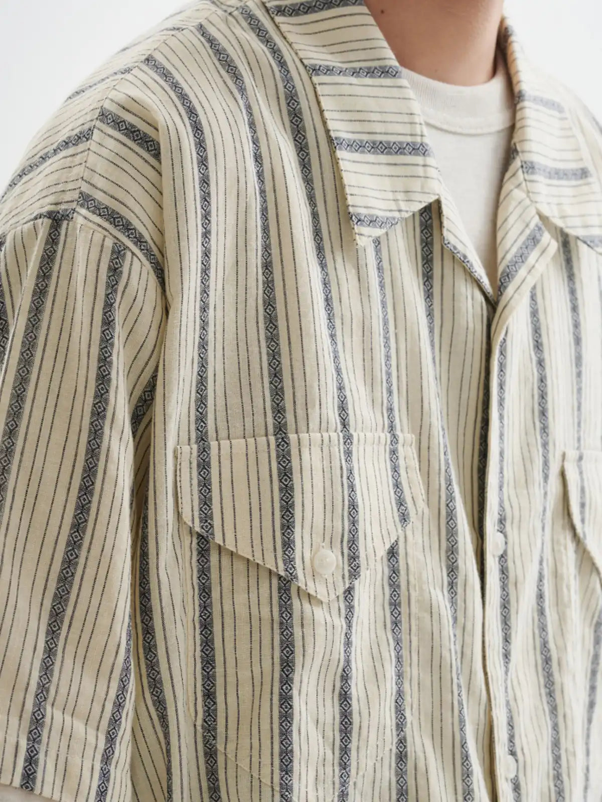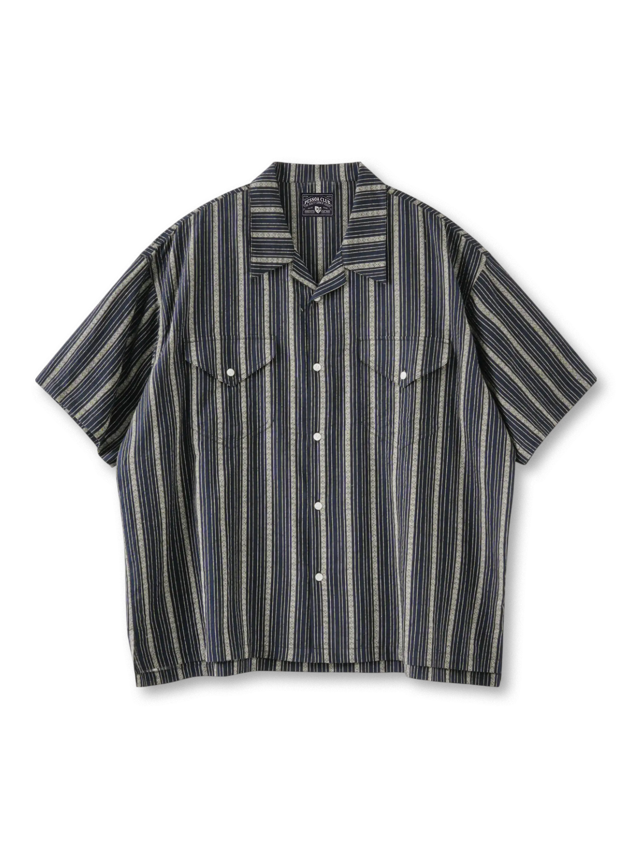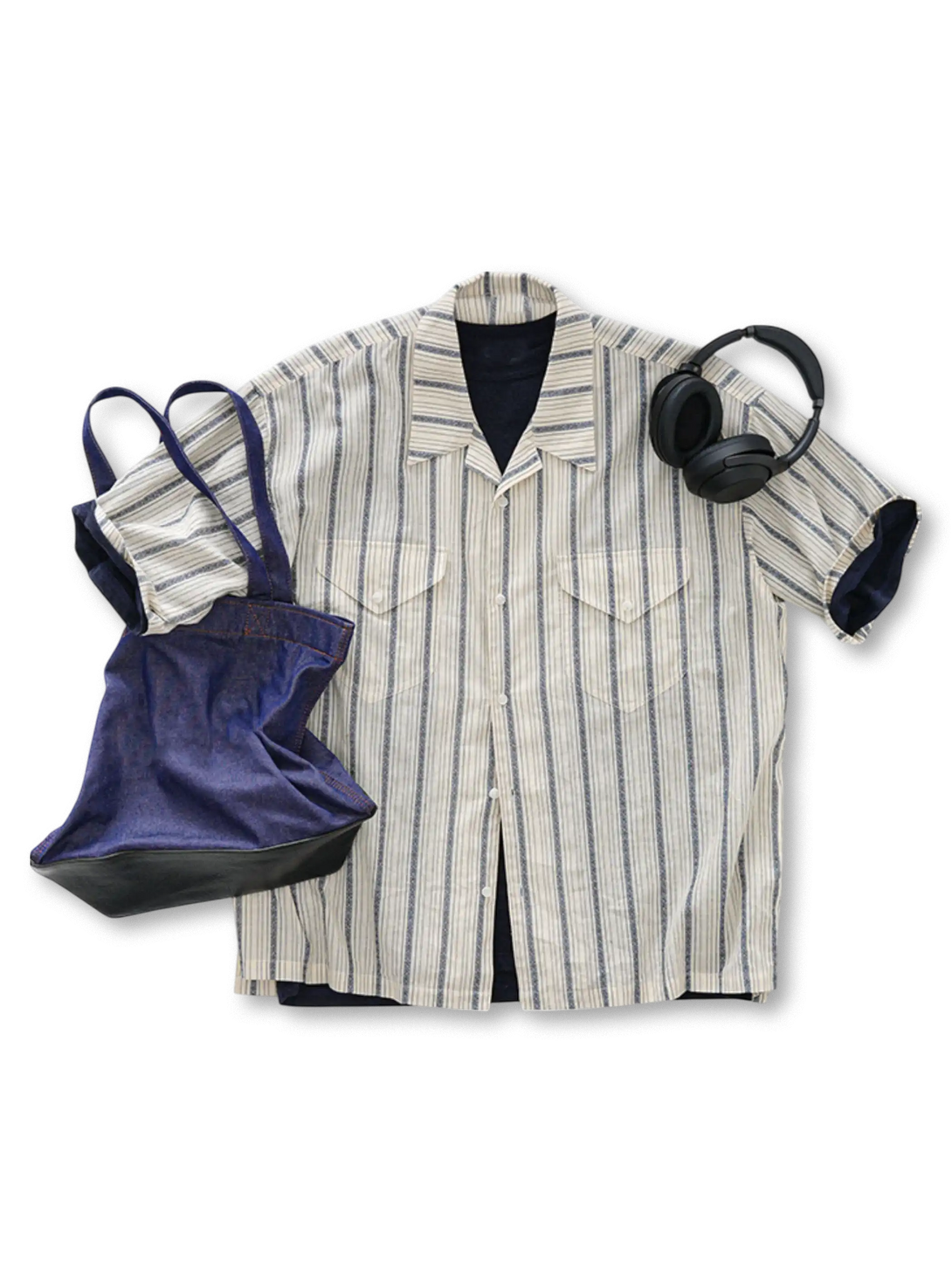 レトロなストライプ生地と大胆なカラーブロックパネルを融合し、クラシックなワークウェアの力強さとモダンな遊び心を両立。ボックスシルエットのドロップショルダーと軽やかなコットン100%がリラックス感を演出し、デニムやチノパンとのスタイリングで都会的なカジュアルに仕上がる。襟元のキューバカラーがさりげないアクセントを添え、あらゆるシーンに溶け込む万能性を発揮。