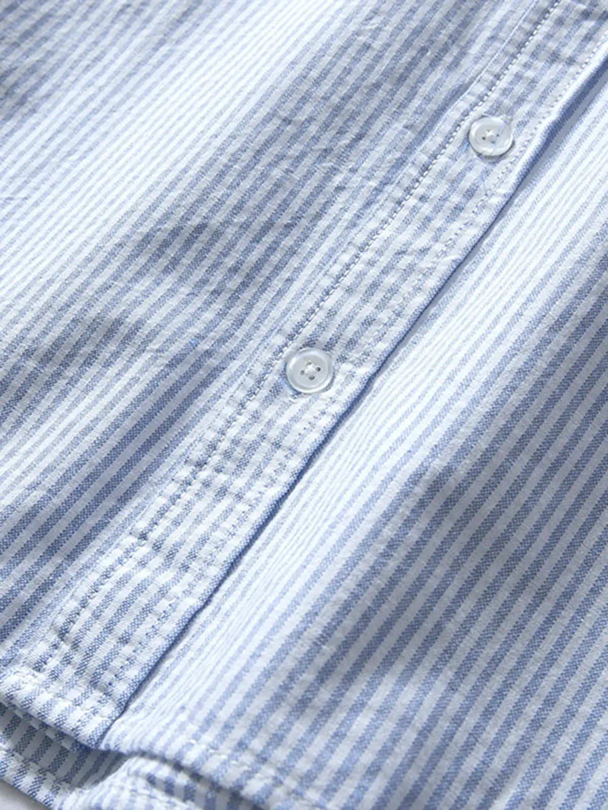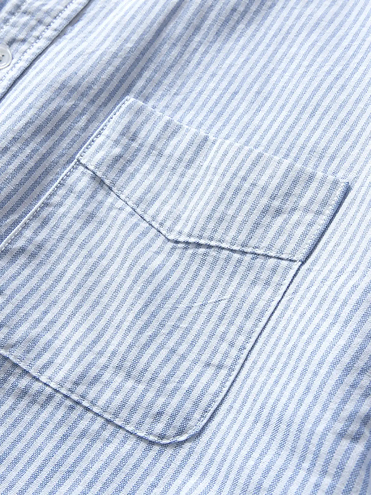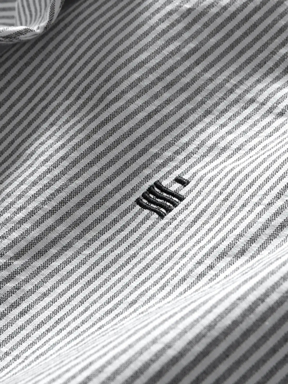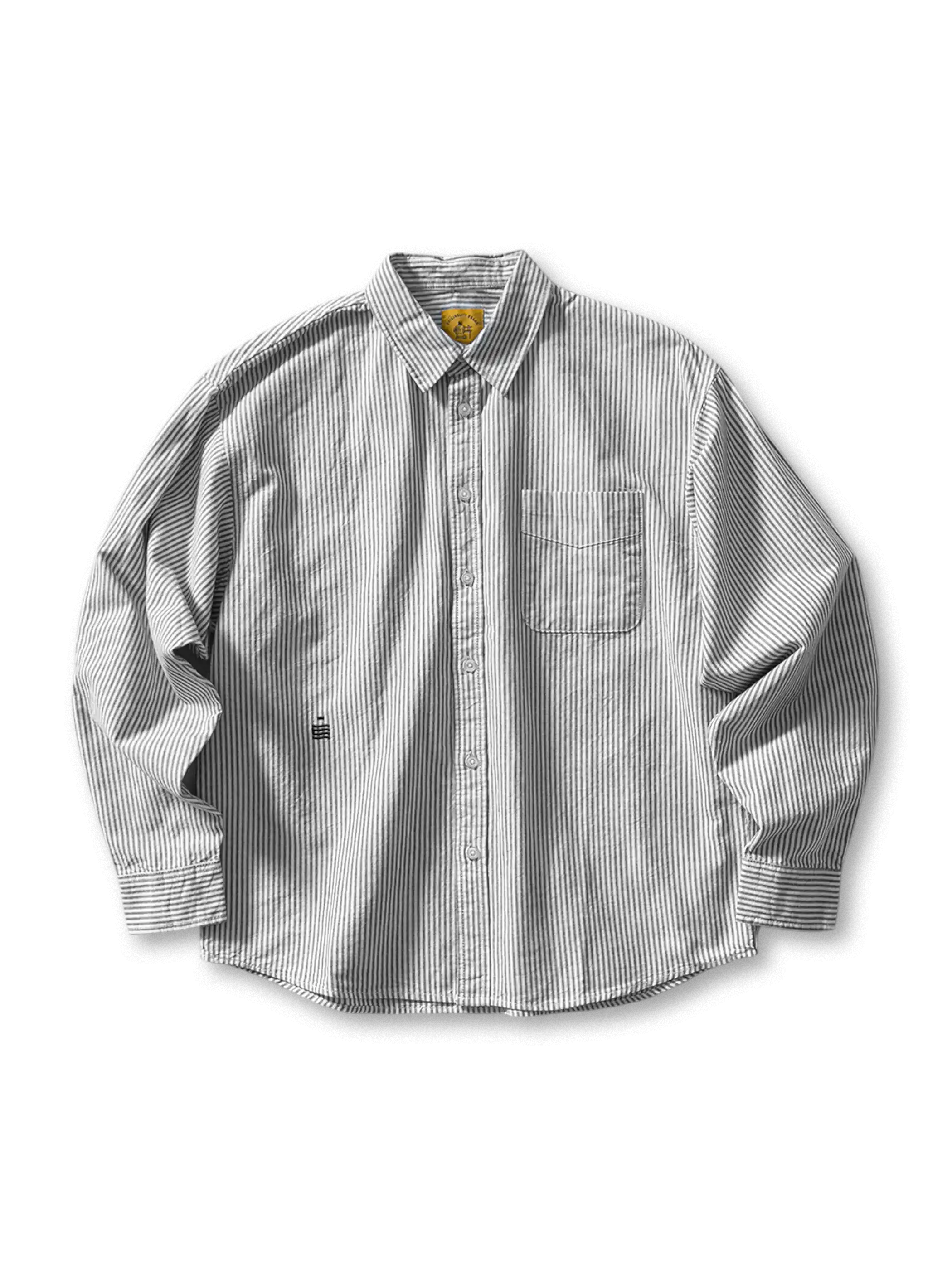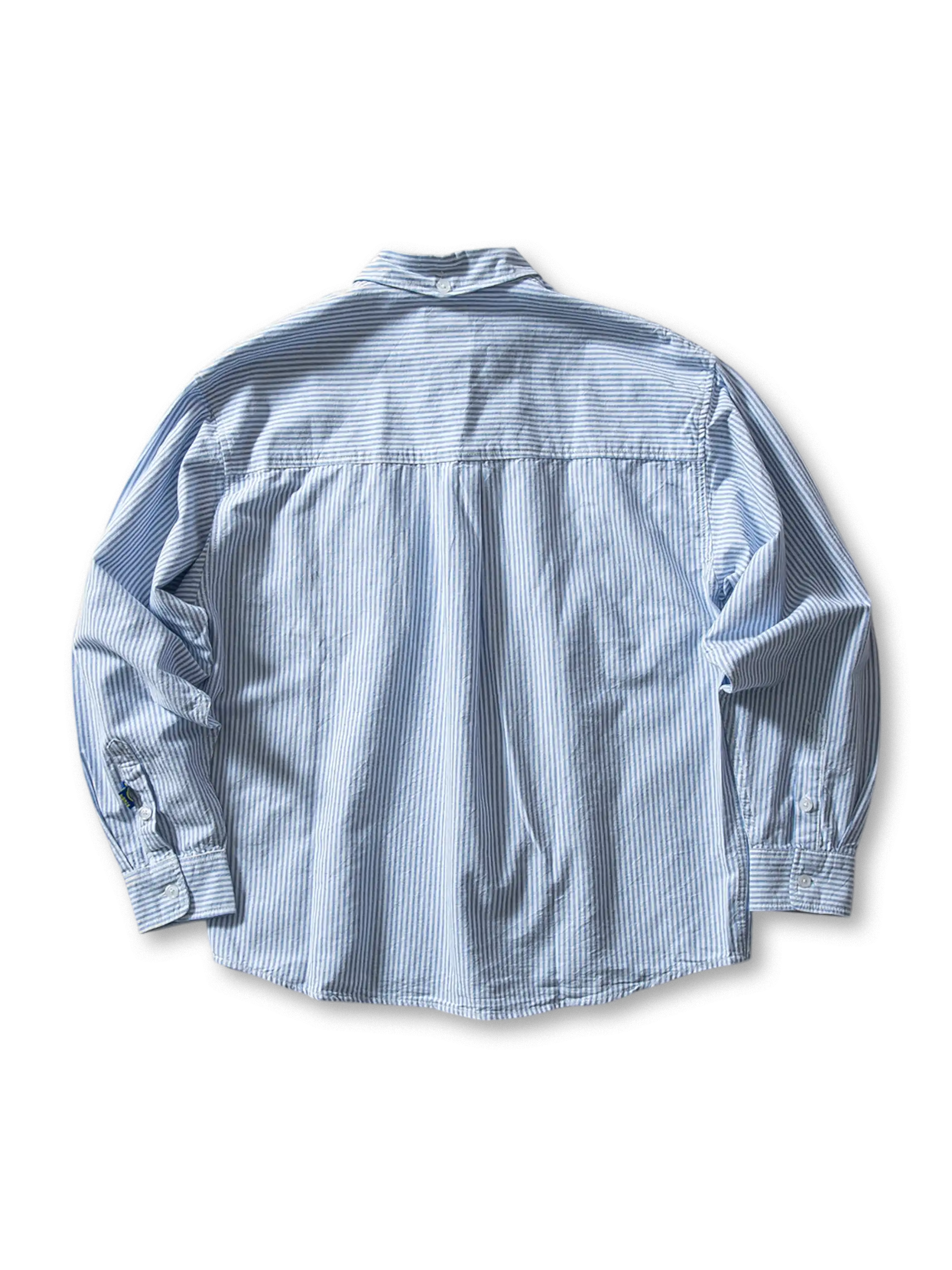 シンプルかつ上品なストライプ柄のオックスフォード生地を使用し、胸元の小さな刺繍がポイントに。コットン100%素材で通気性と肌触りが良く、季節を問わず快適に着用できます。ルーズフィットでリラックス感があり、デニムやチノパンとの相性も抜群。カジュアルからきれいめまで、幅広いスタイリングを楽しめる万能アイテムです。