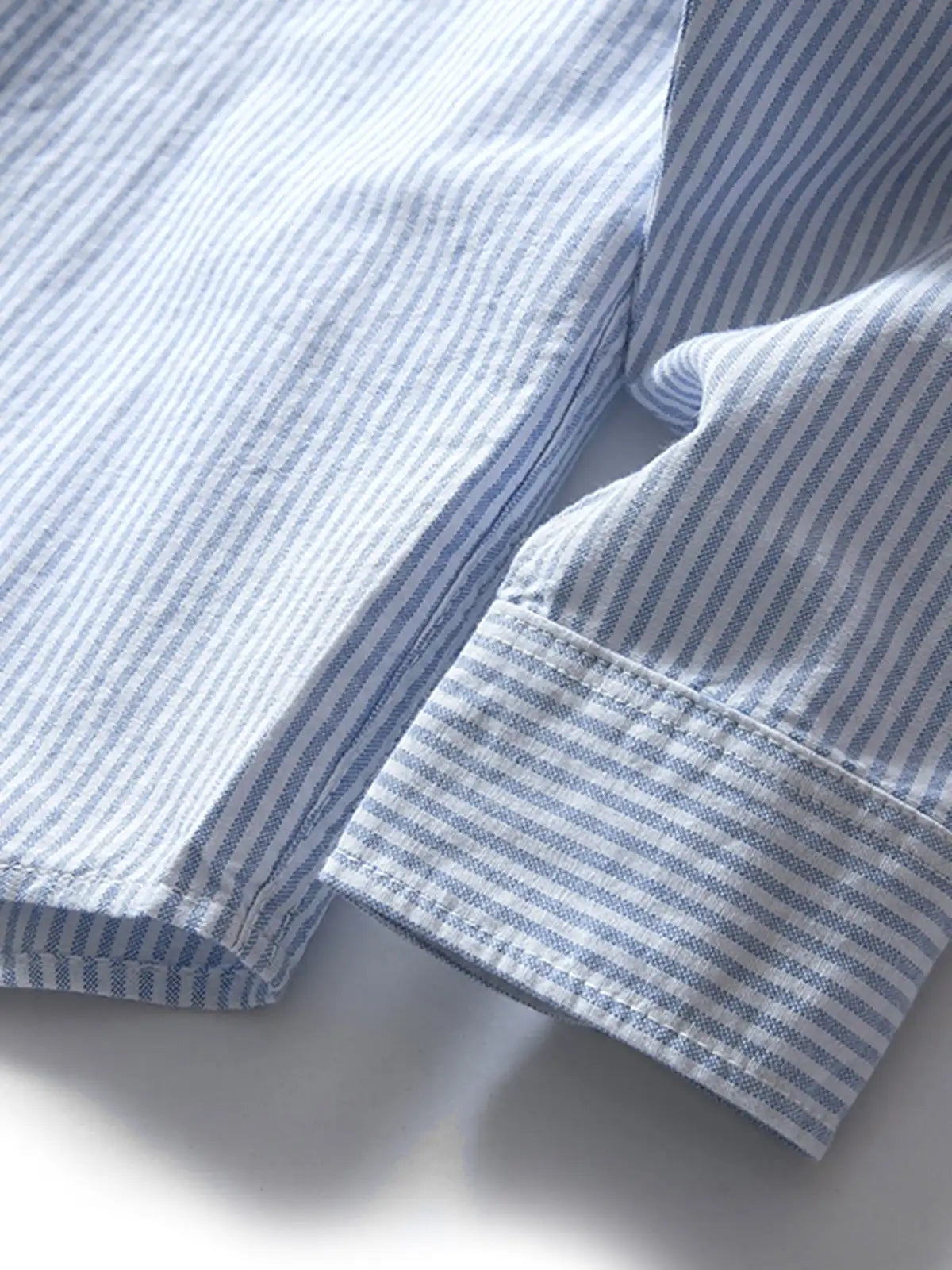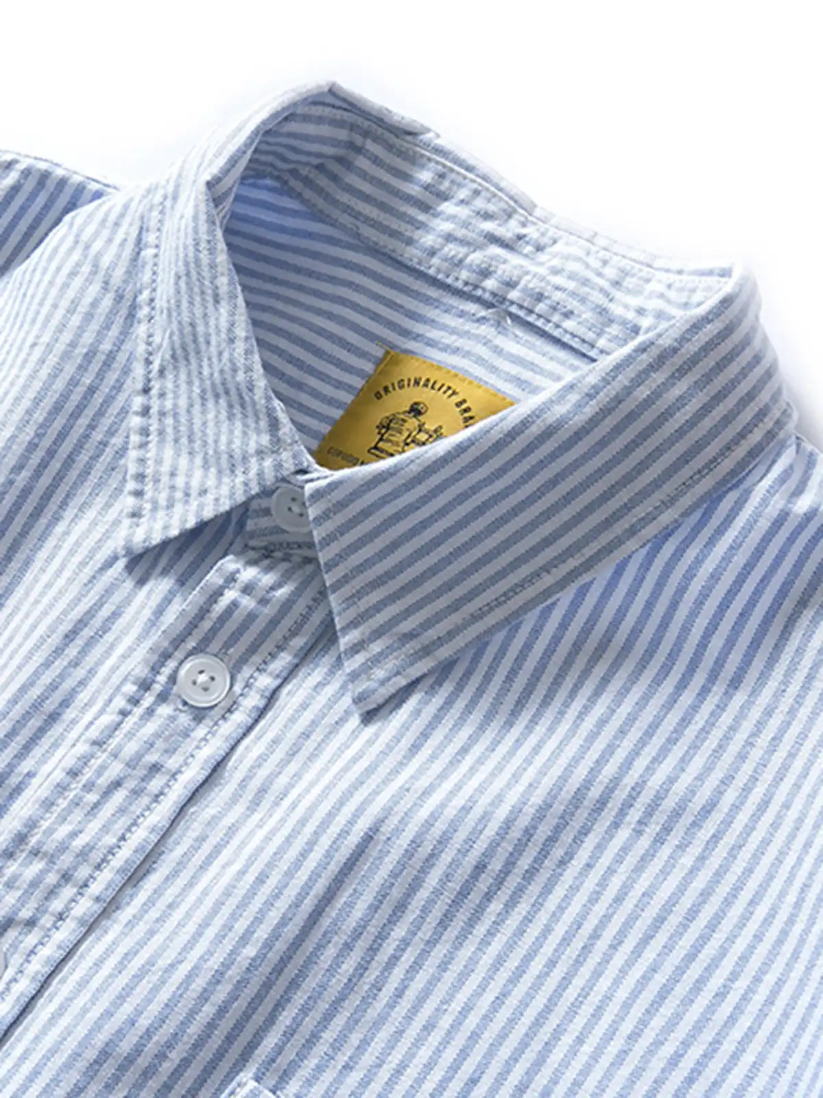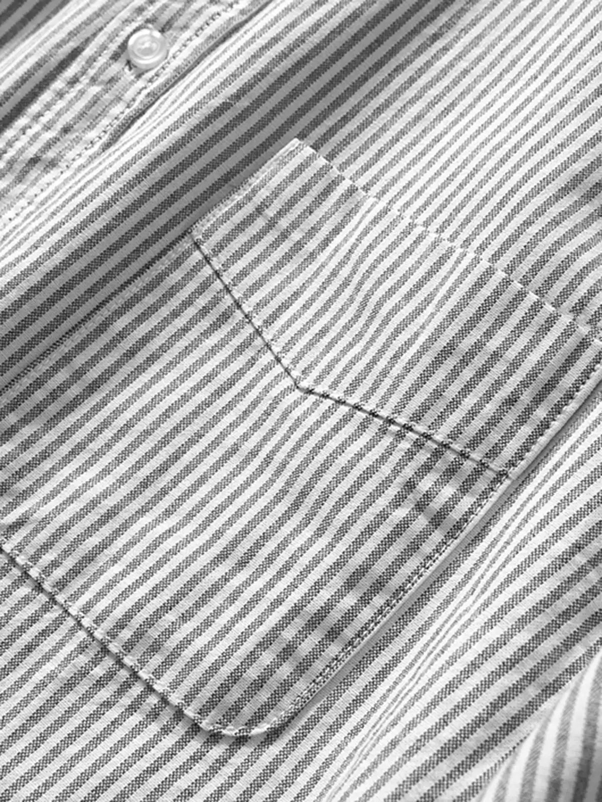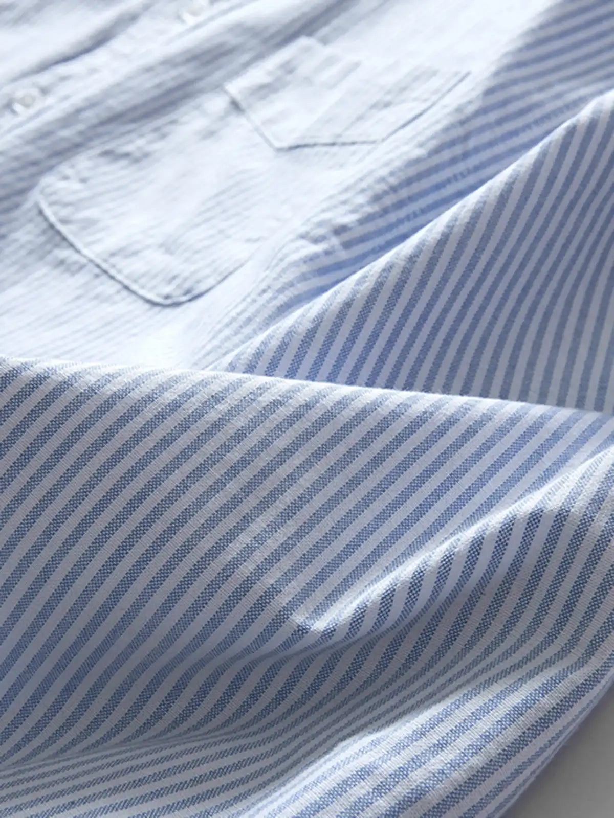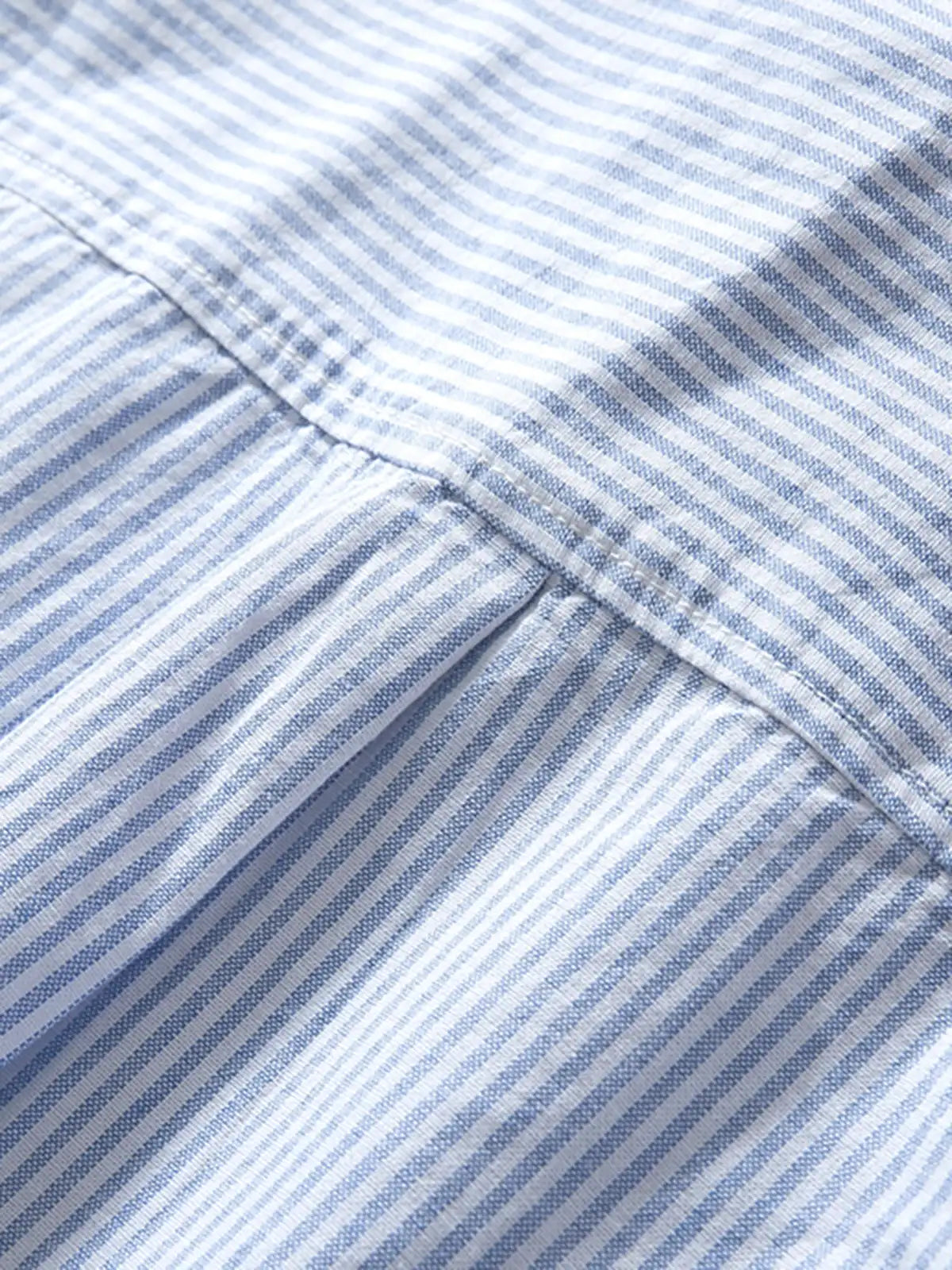 シンプルかつ上品なストライプ柄のオックスフォード生地を使用し、胸元の小さな刺繍がポイントに。コットン100%素材で通気性と肌触りが良く、季節を問わず快適に着用できます。ルーズフィットでリラックス感があり、デニムやチノパンとの相性も抜群。カジュアルからきれいめまで、幅広いスタイリングを楽しめる万能アイテムです。