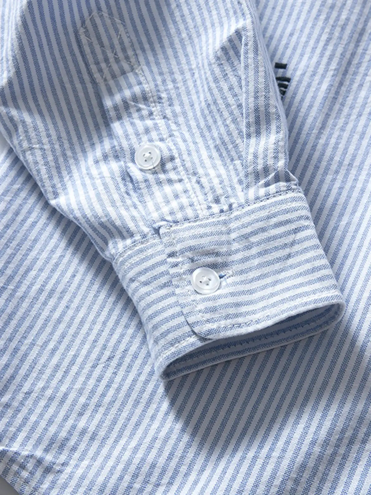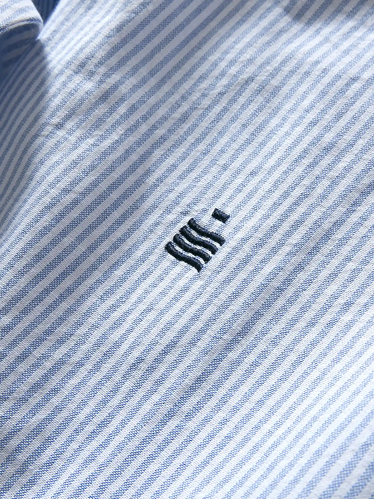 小さな刺繍がさりげないアクセントになった、100%コットンのストライプオックスフォードシャツ。