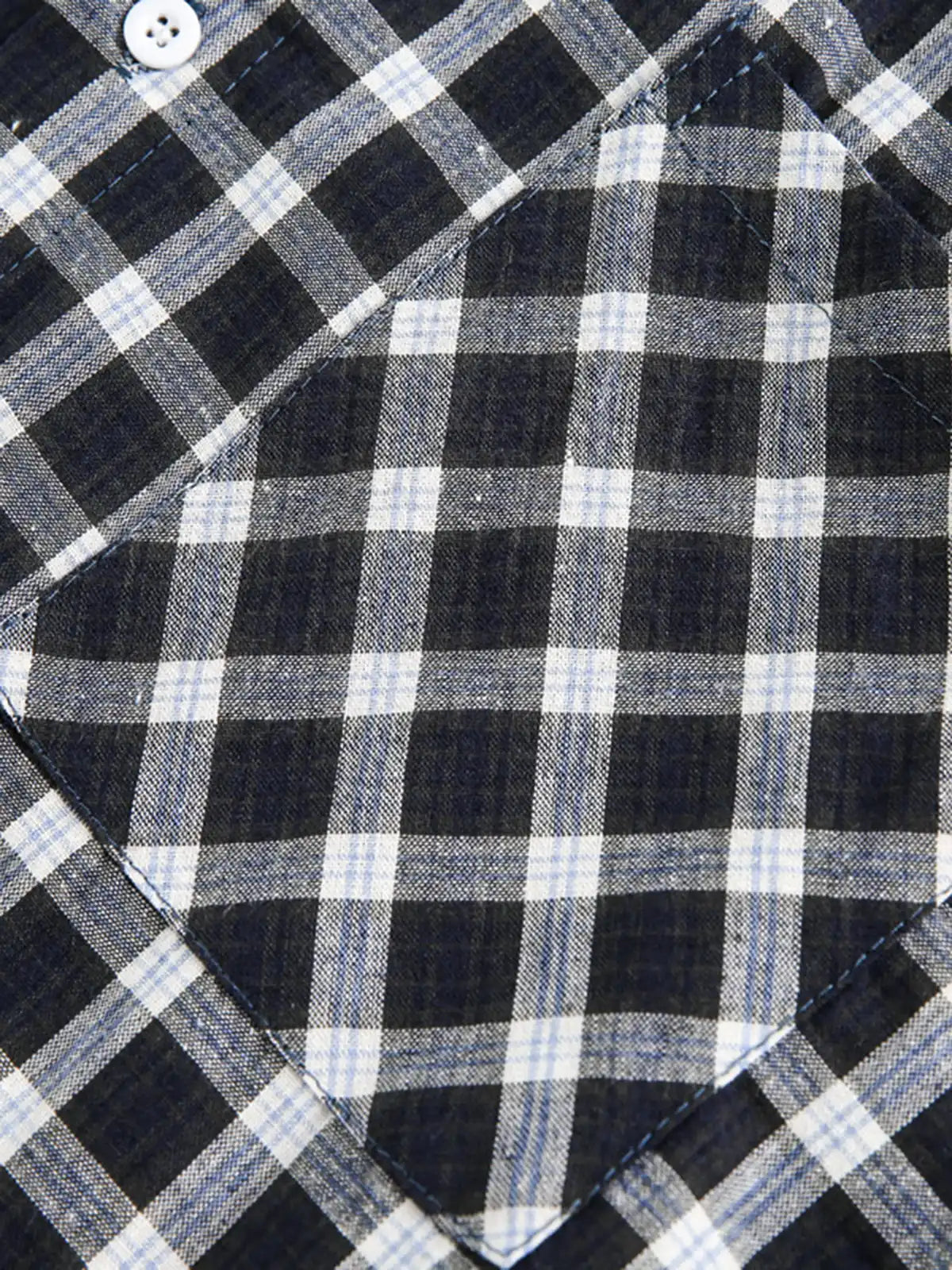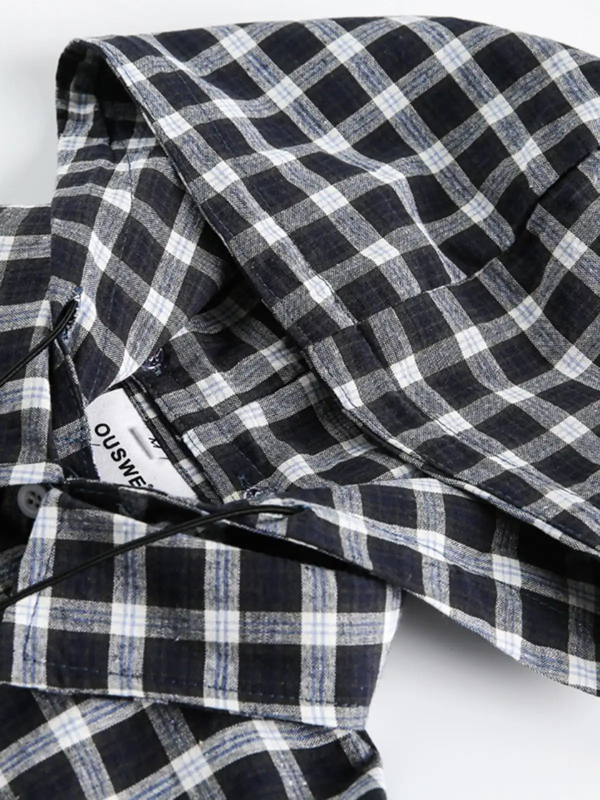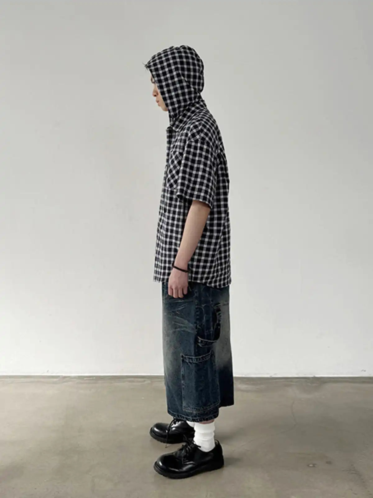 フードはボタンで簡単に取り外しが可能で、襟なしのショートスリーブシャツとしても着用できます。全体的にゆったりとしたルーズフィットで、通気性の良いコットン100%の生地を使用。前面には使いやすいボタン留めが施され、胸元には大きめのパッチポケットを配置してアクセントをプラス。チェック柄の配色はヴィンテージ感があり、カジュアルコーデの主役としても活躍します。背面にはヨーク切り替えを取り入れ、動きやすさとデザイン性を両立。夏のイベントやフェス、アウトドアシーンまで、幅広いスタイルに溶け込みやすいアイテムです。
