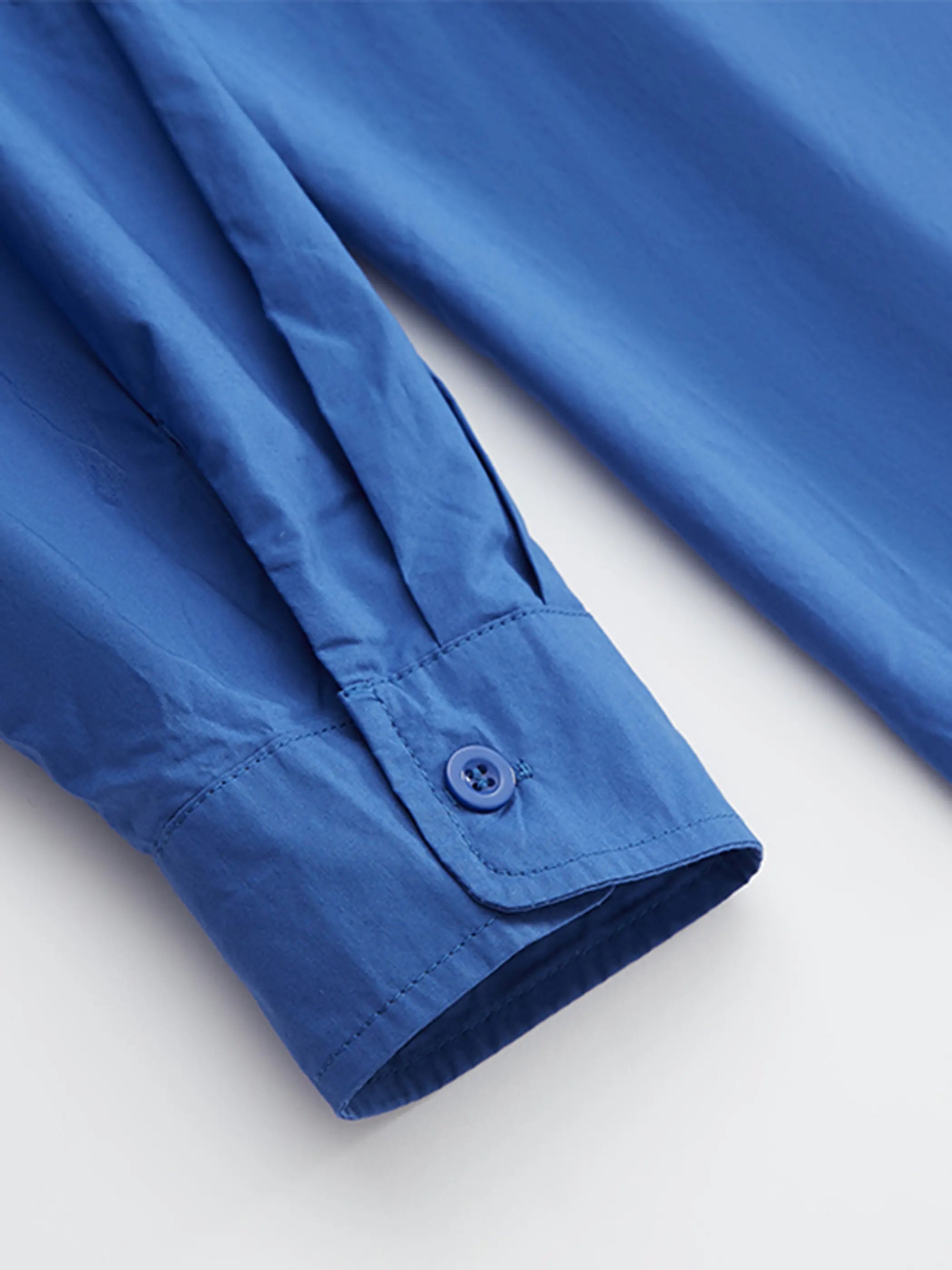 鮮やかなクラインブルーが日常にモダンなアクセントを添える、ゆったりシルエットの定番長袖シャツ。