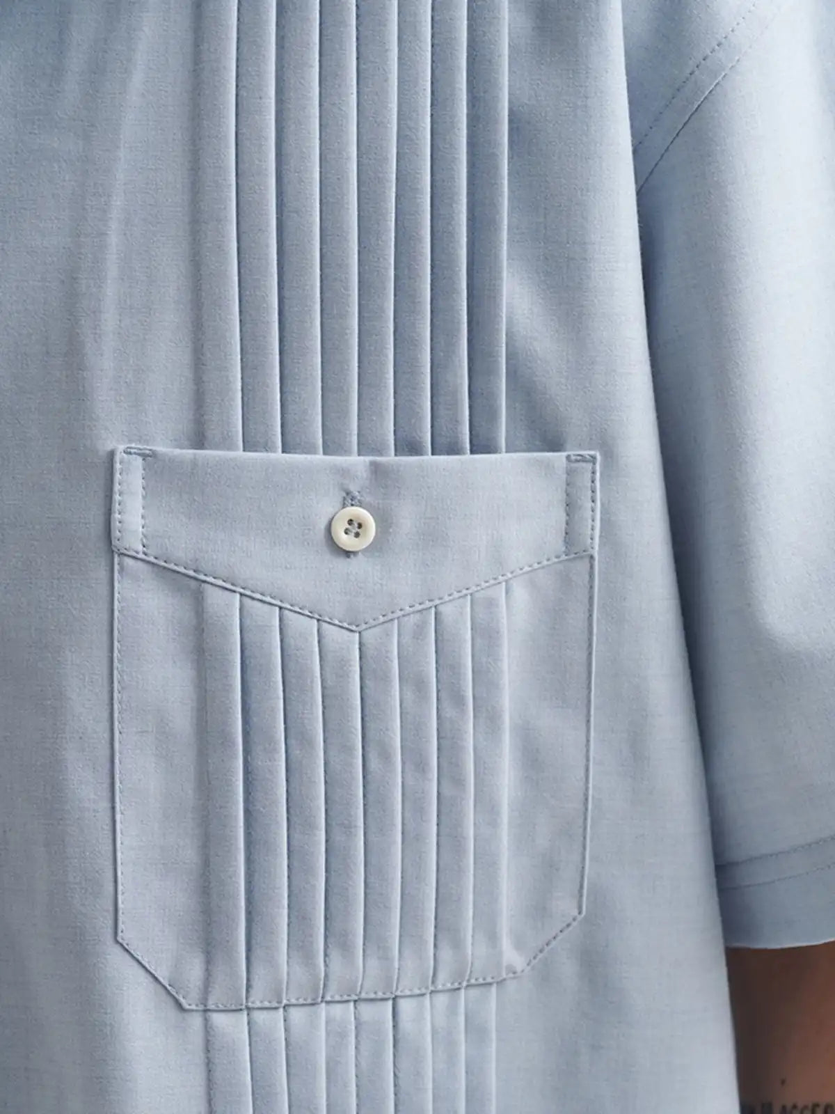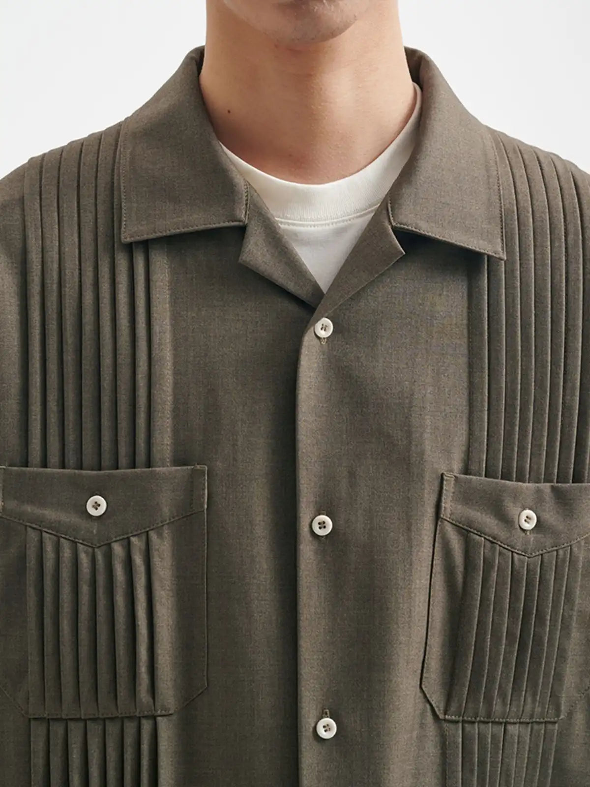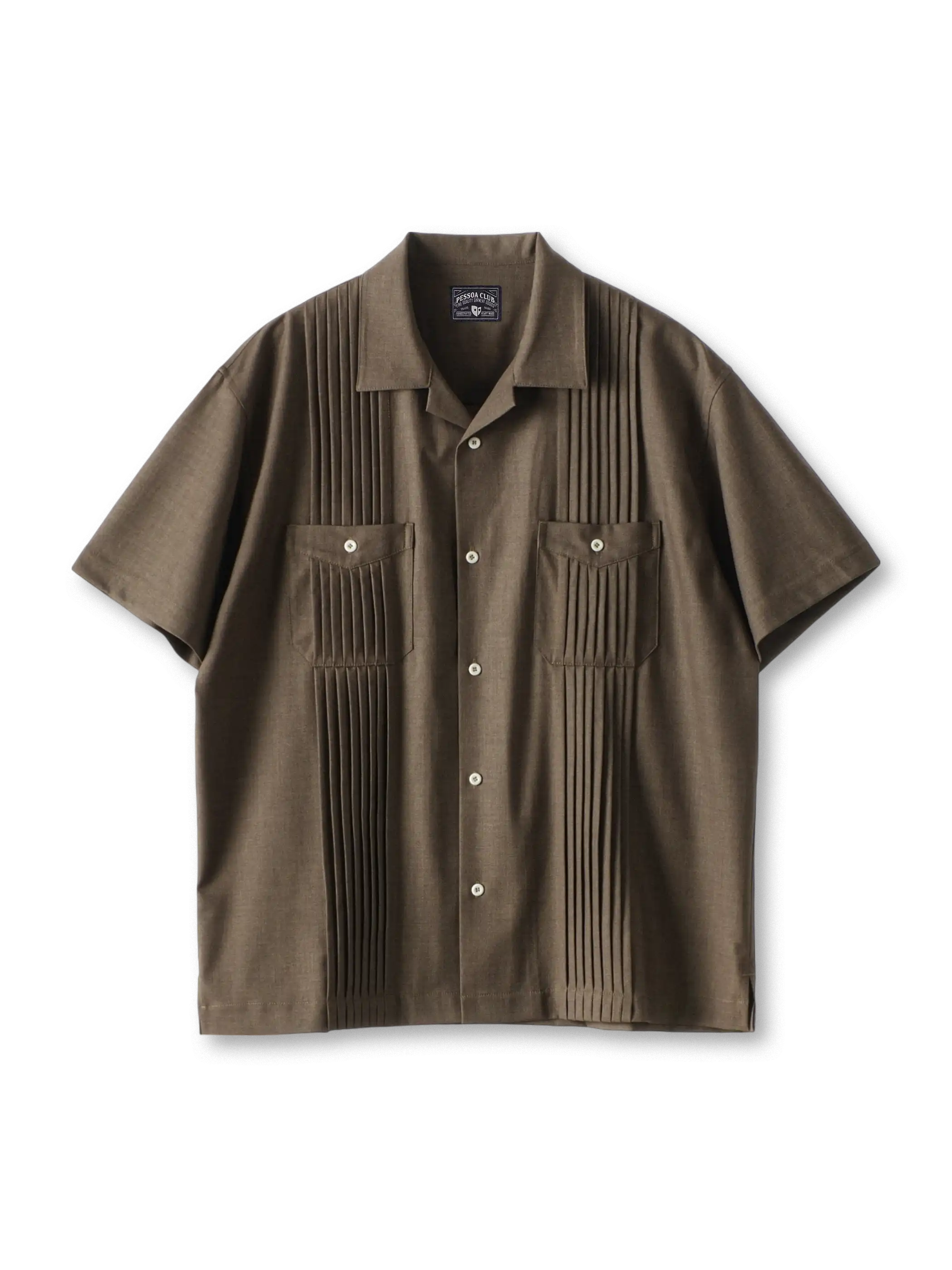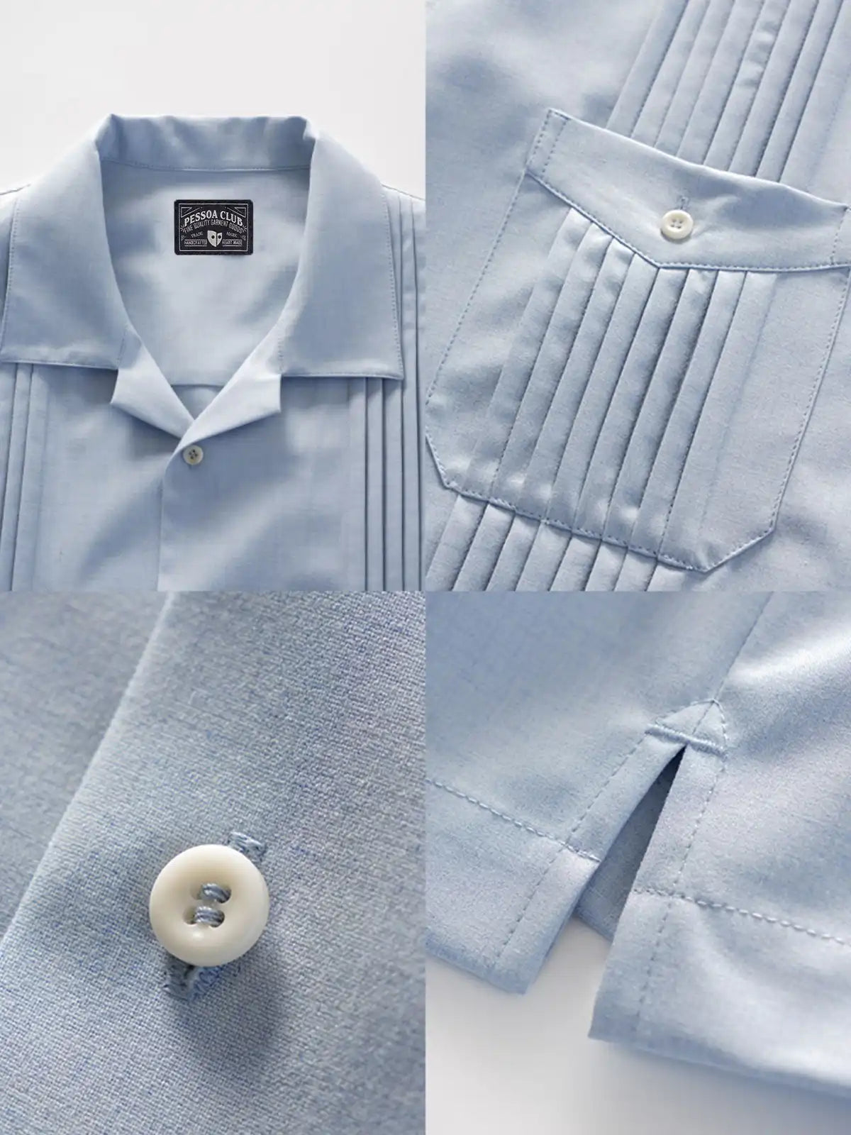 キューバカラーの開放感と、前身頃に縦一列ずつ施されたダブルオルガンプリーツが特徴的。19世紀のグアヤベラにルーツを持つ襟元は程よい抜け感を演出し、Hシルエットのゆとりある身幅と肩幅が快適な着心地を提供。シャープなプリーツラインが視覚的に縦長効果をもたらし、テーラードパンツやデニムと合わせればビジネスカジュアルからカジュアルまで幅広く対応します。