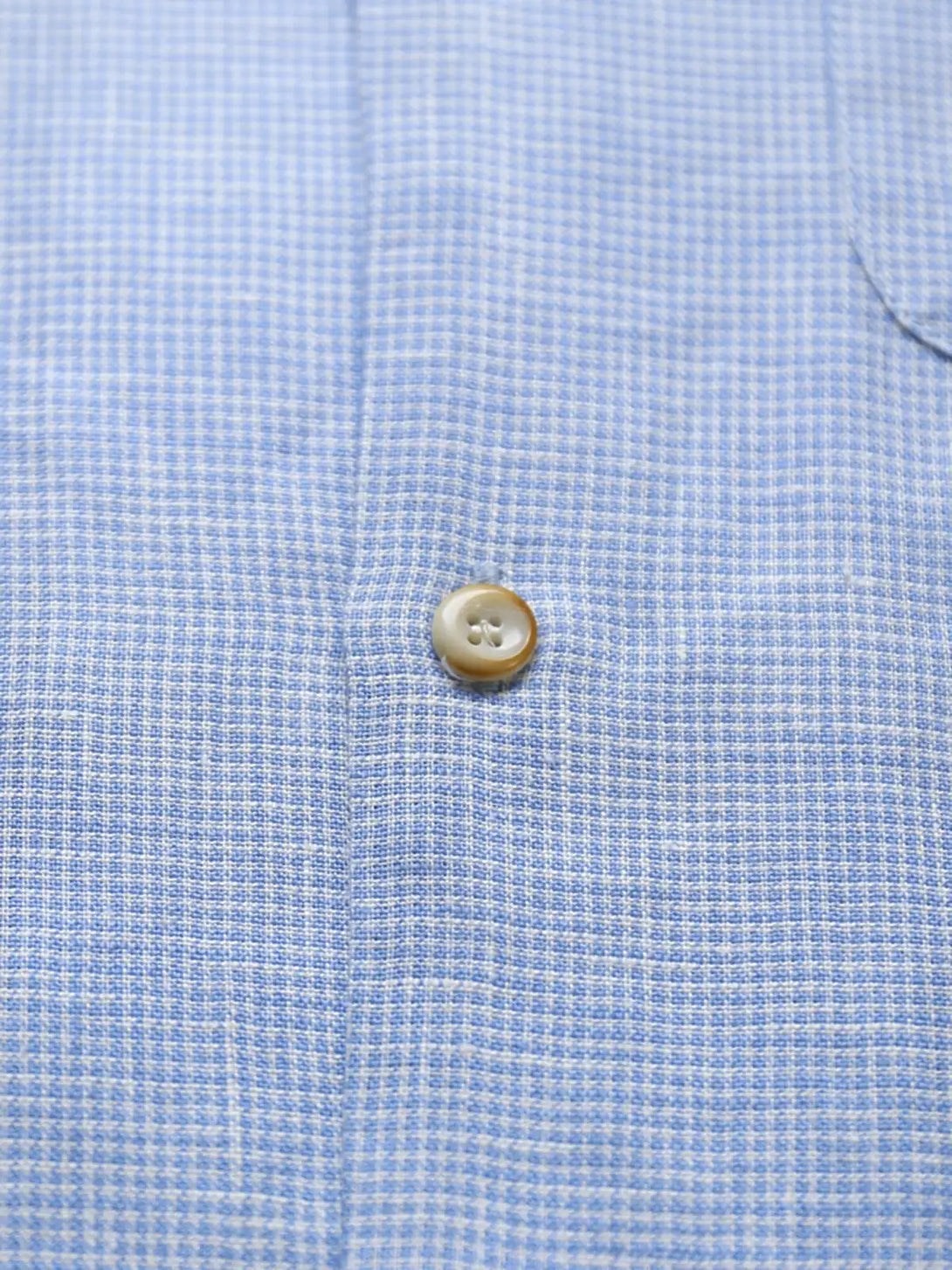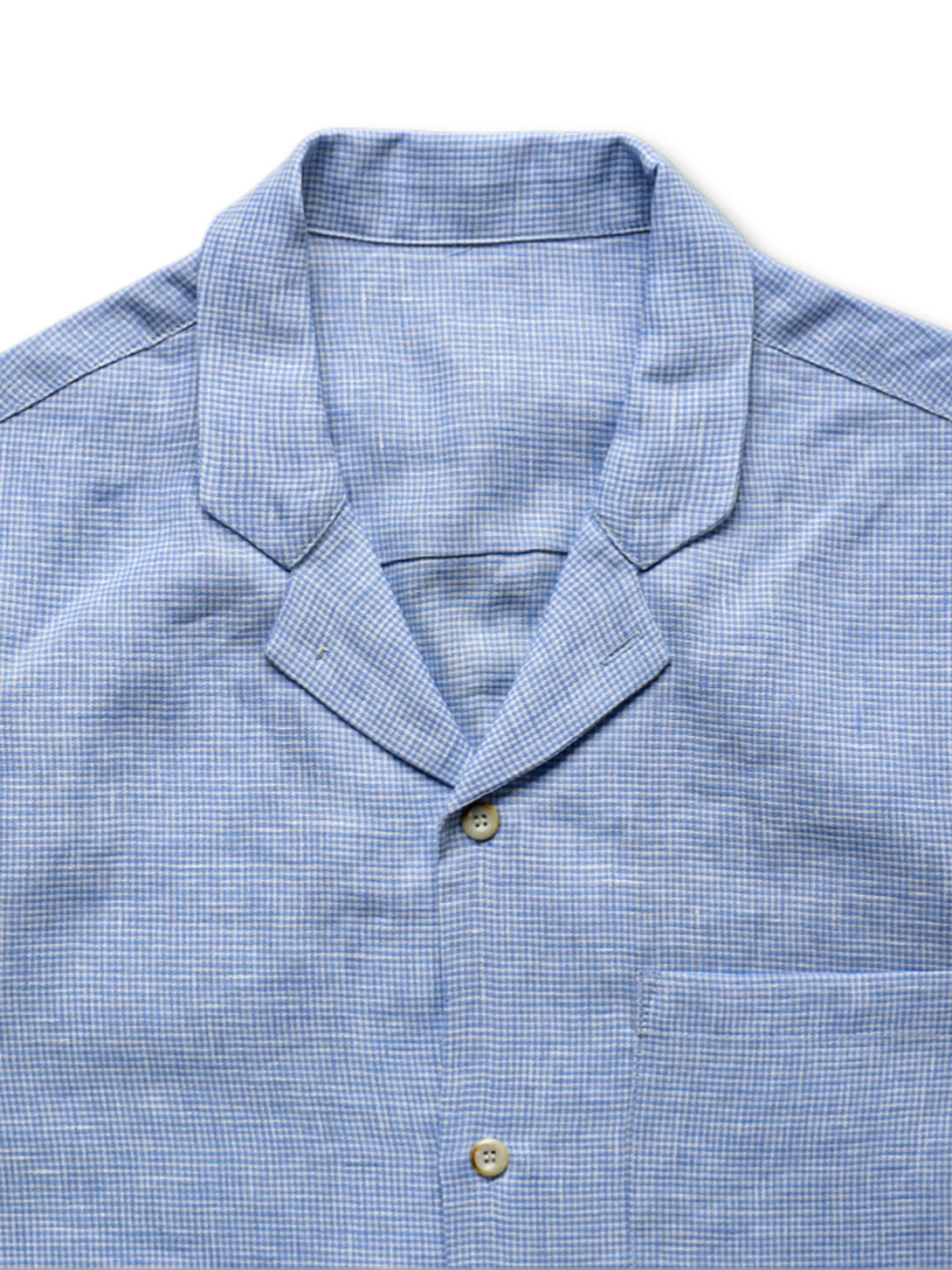 100%リネン素材を使用し、淡いチェック柄が涼しげでナチュラルな雰囲気を演出。軽くて通気性が高く、着心地は爽やか。小ぶりの古巴襟が首元をすっきり見せ、カジュアルからリゾートスタイルまで幅広く対応。使い込むほどに柔らかさが増し、快適な着用感が続く一枚。