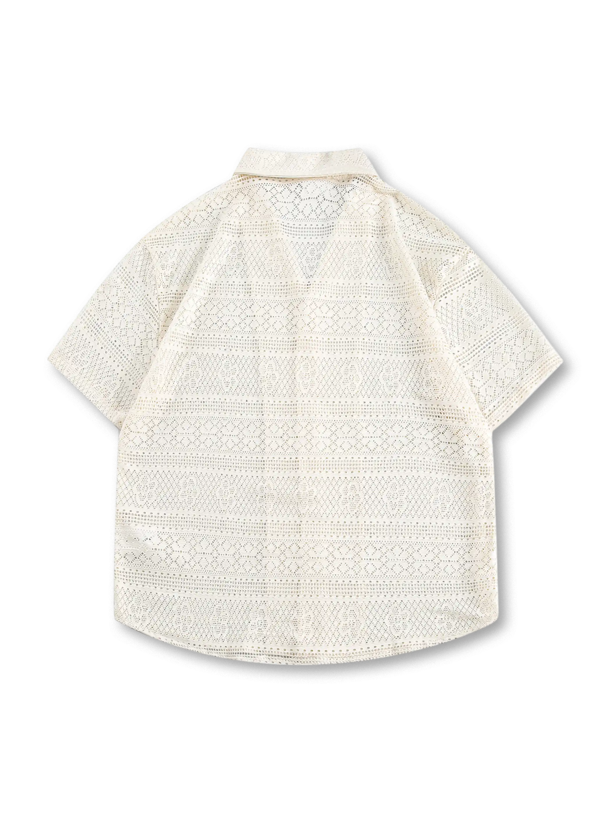 この半袖キューバシャツは、透かし編みのような柄が軽やかな抜け感を演出し、夏のリゾートやフェス、街着まで幅広く活躍する一着です。
