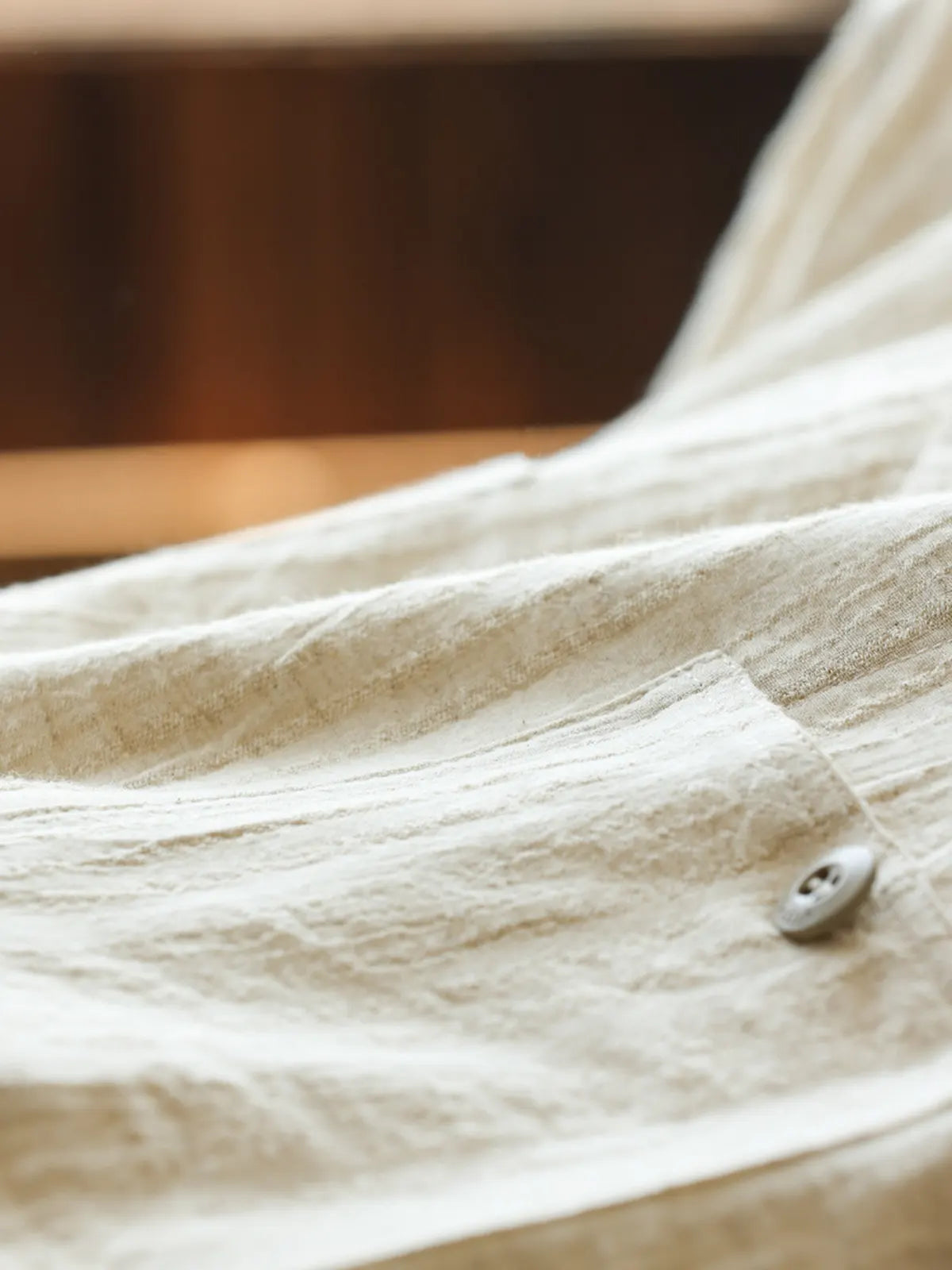 150g/m²のコットン×リネンジャガードで仕立てた、涼感あふれる古巴襟半袖シャツ。