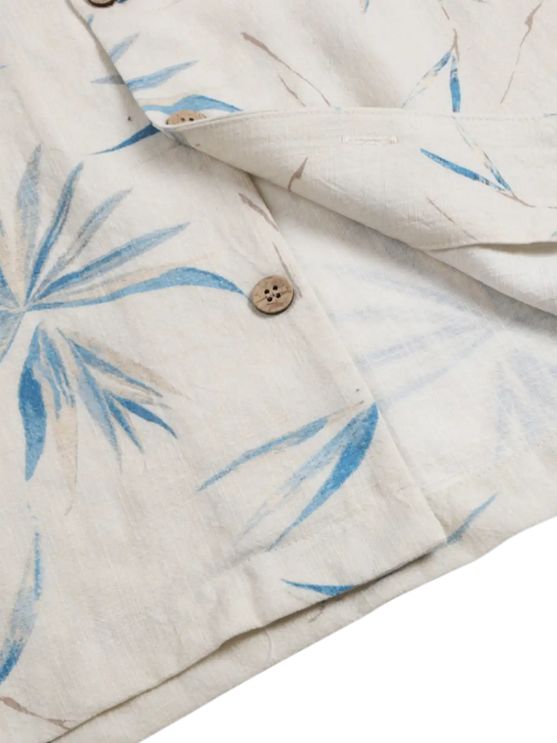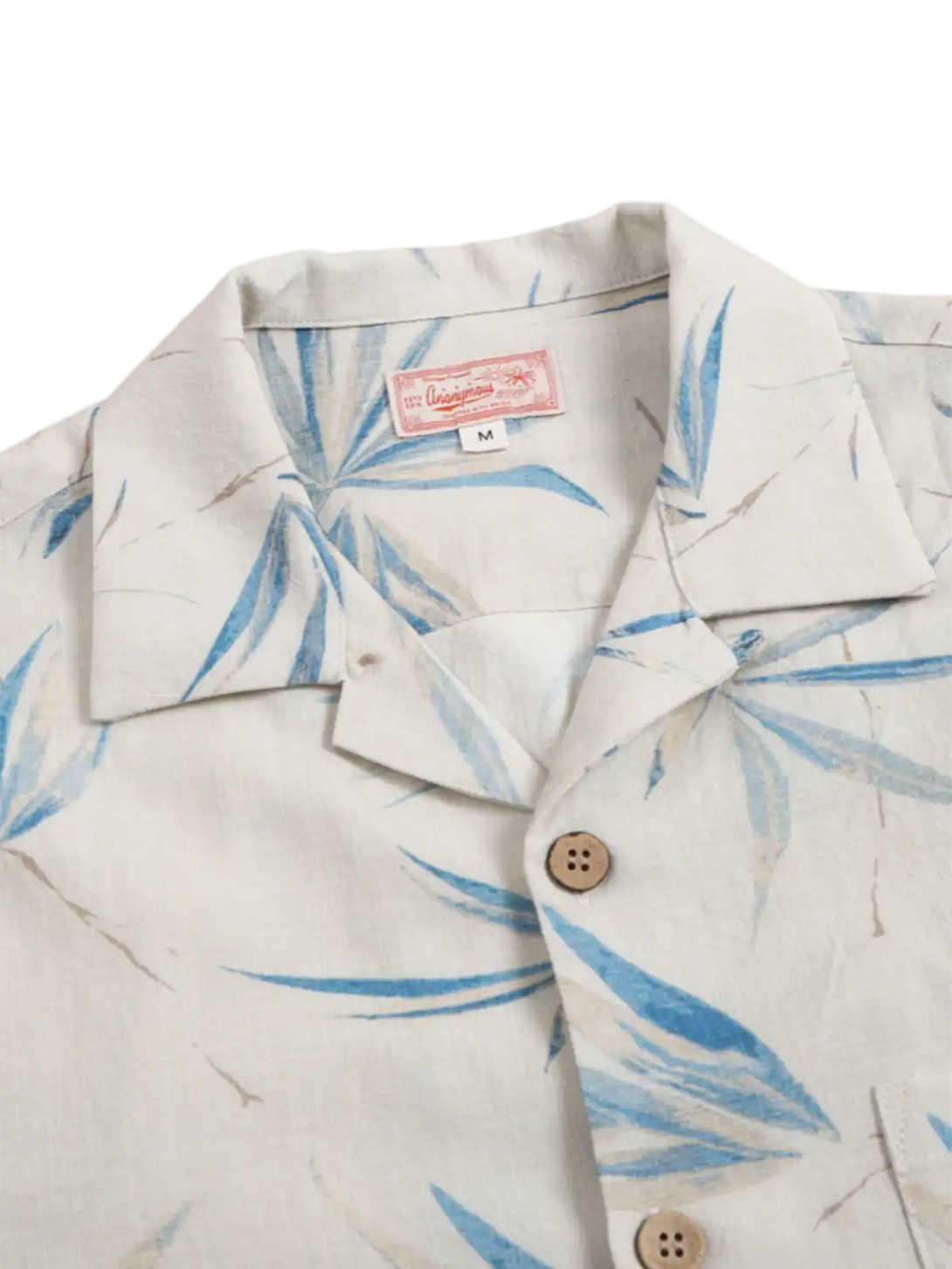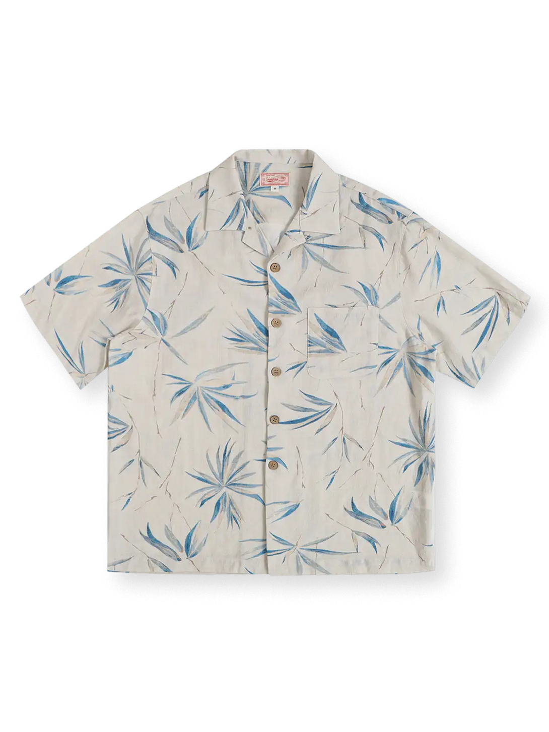 涼感あふれるコットンリネン素材と独特な竹柄プリント、リラックスした古巴襟が夏のリゾート気分を誘う一着。