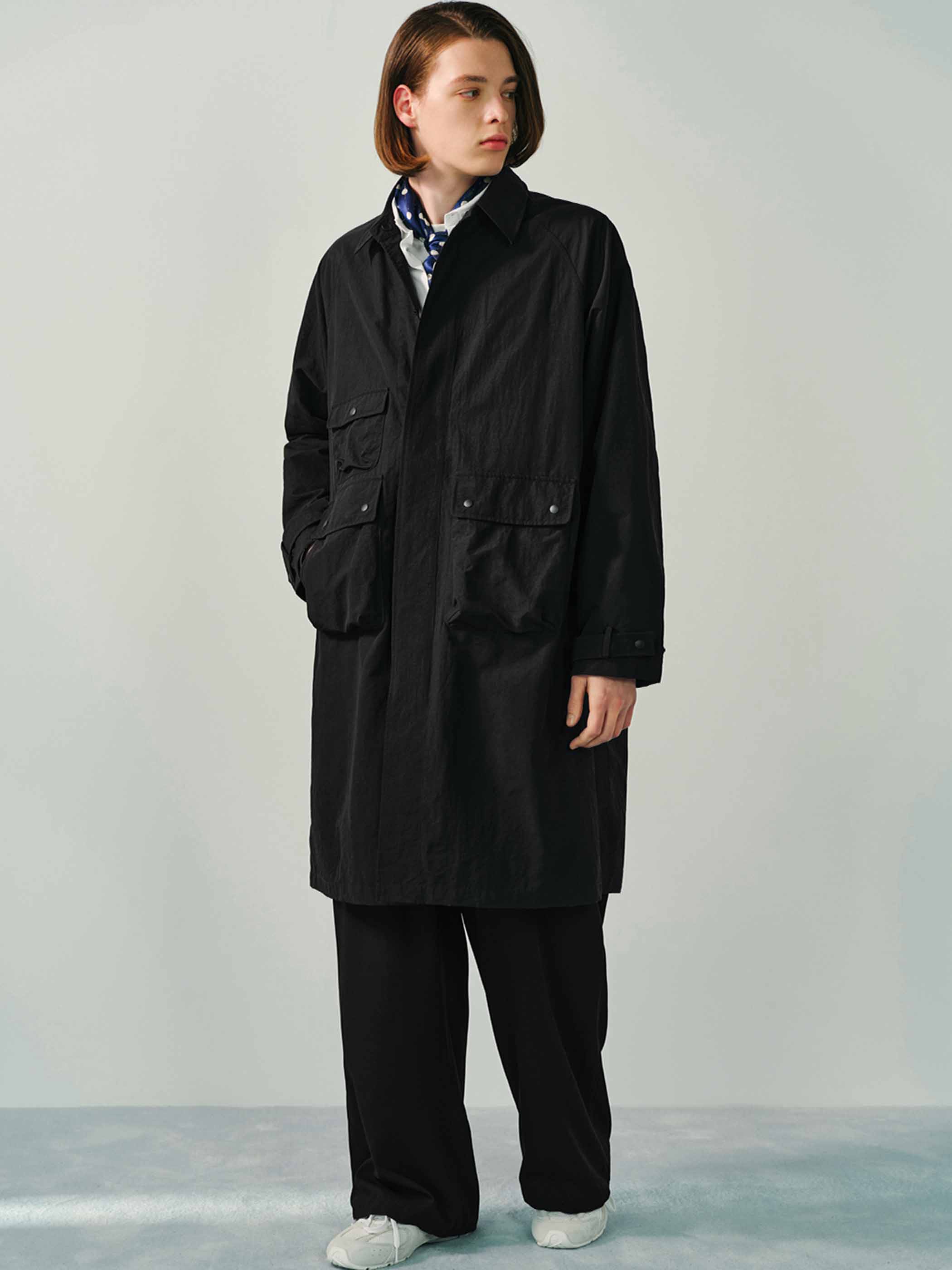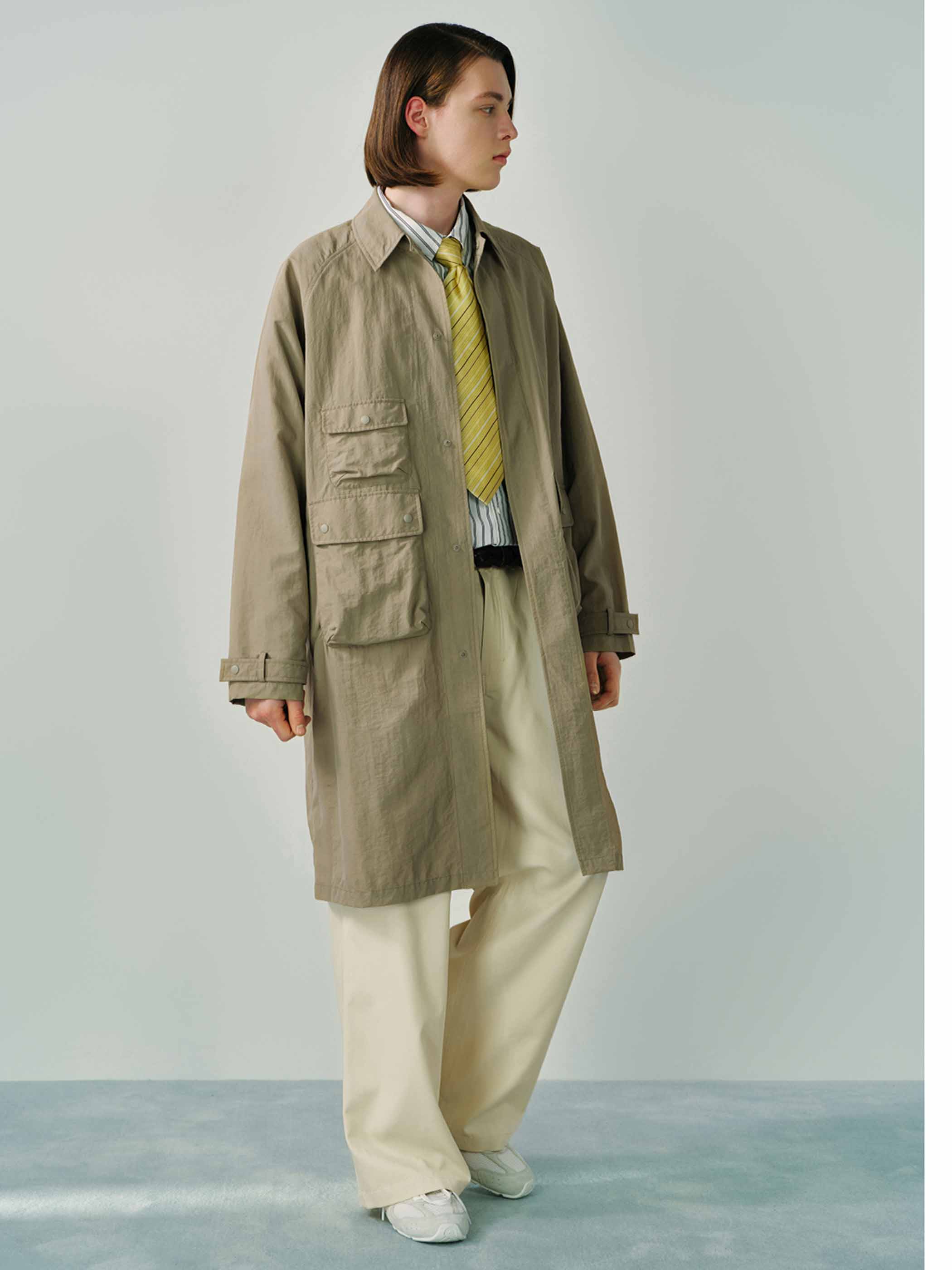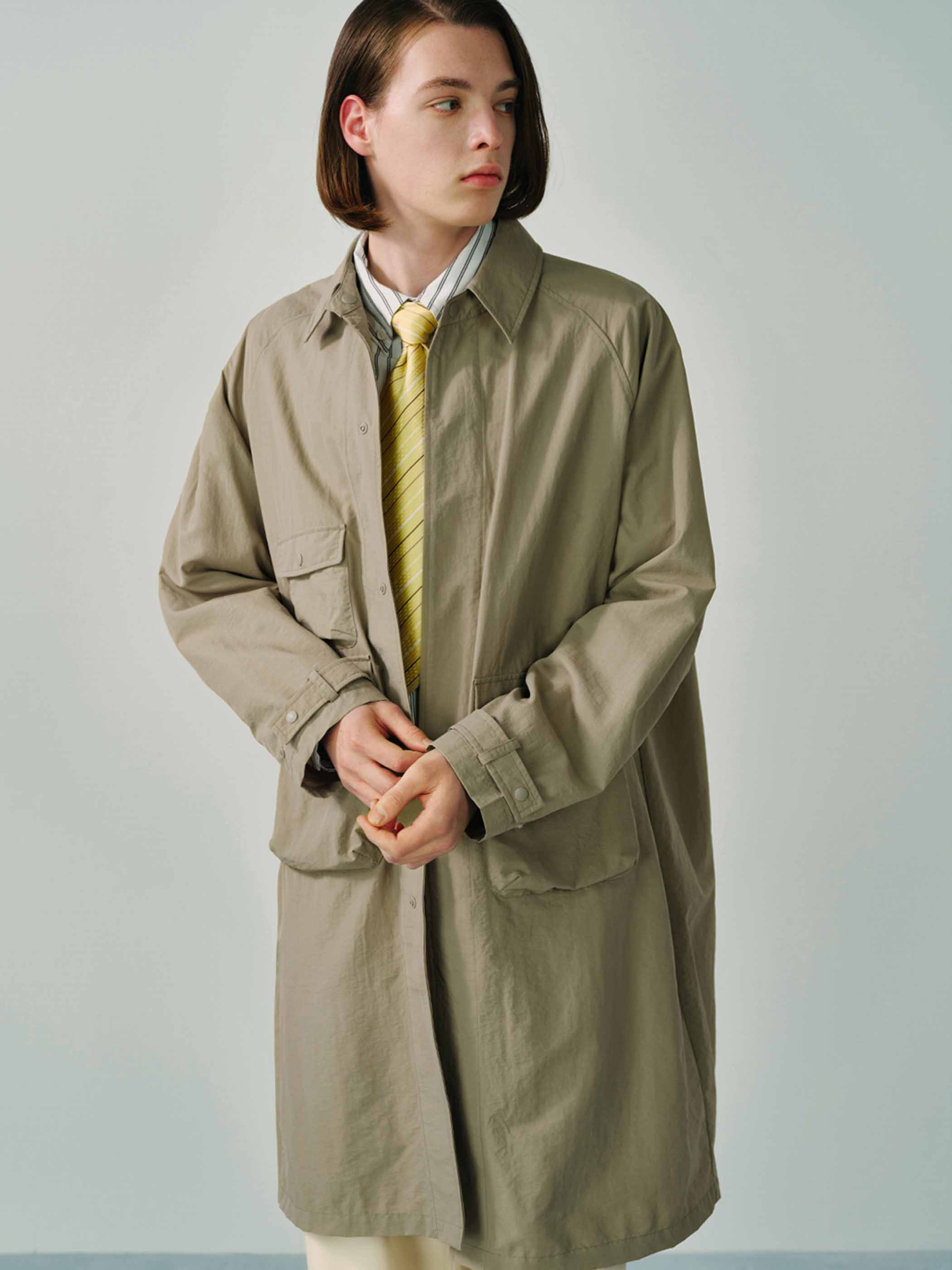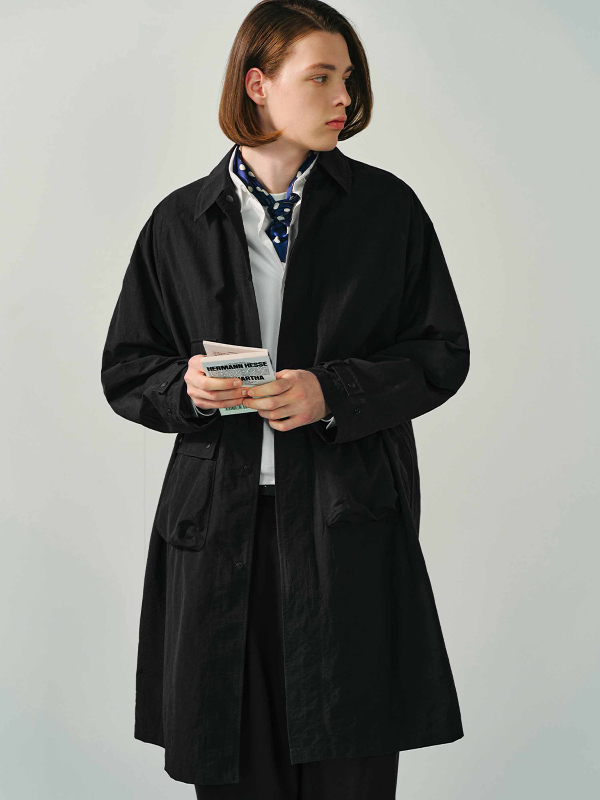 本コートは、伝統的なバルマカーン風コートを基に、輸入紙感ナイロン生地を使用して独特なマット感と微細なしわ模様を演出している。軽量でありながら長丈コートのドレープ感を抑え、ルーズなシルエットを実現している。前身頃は対称のフラップポケットで工装風ディテールを強調し、内側にはカード収納用の隠しポケットを装備。袖口は調節可能なボタン仕様で、古風な金属製デザインがアクセントとなる。カキ色とネイビー色の2色展開により、幅広いスタイルに合わせたコーディネートが可能です。