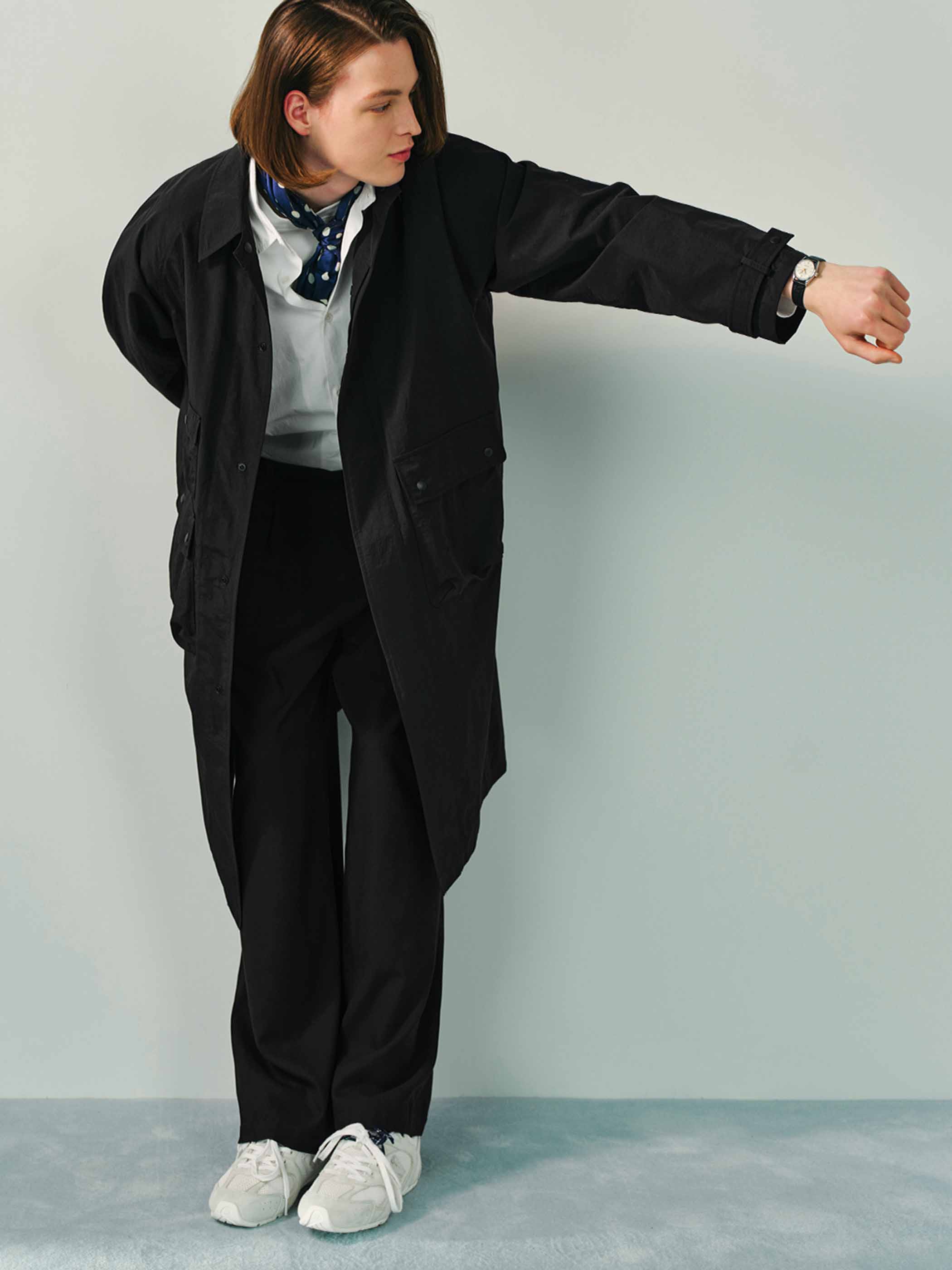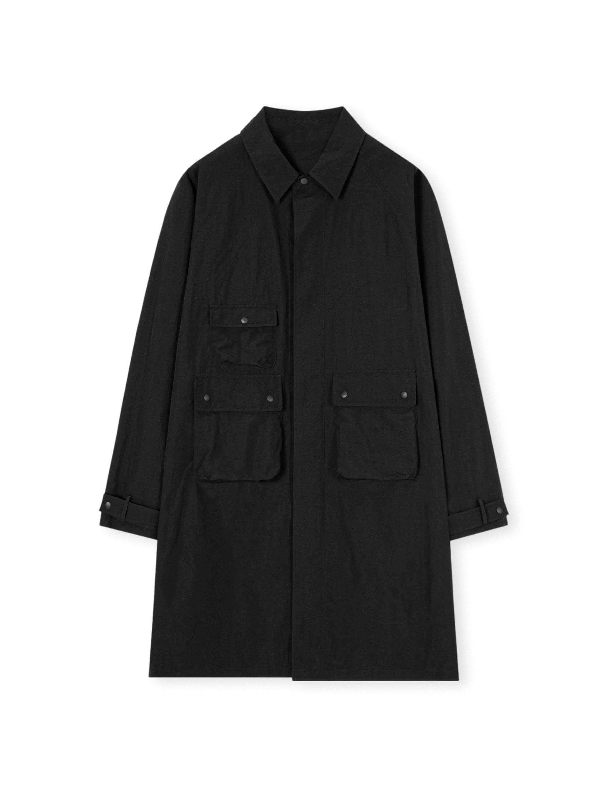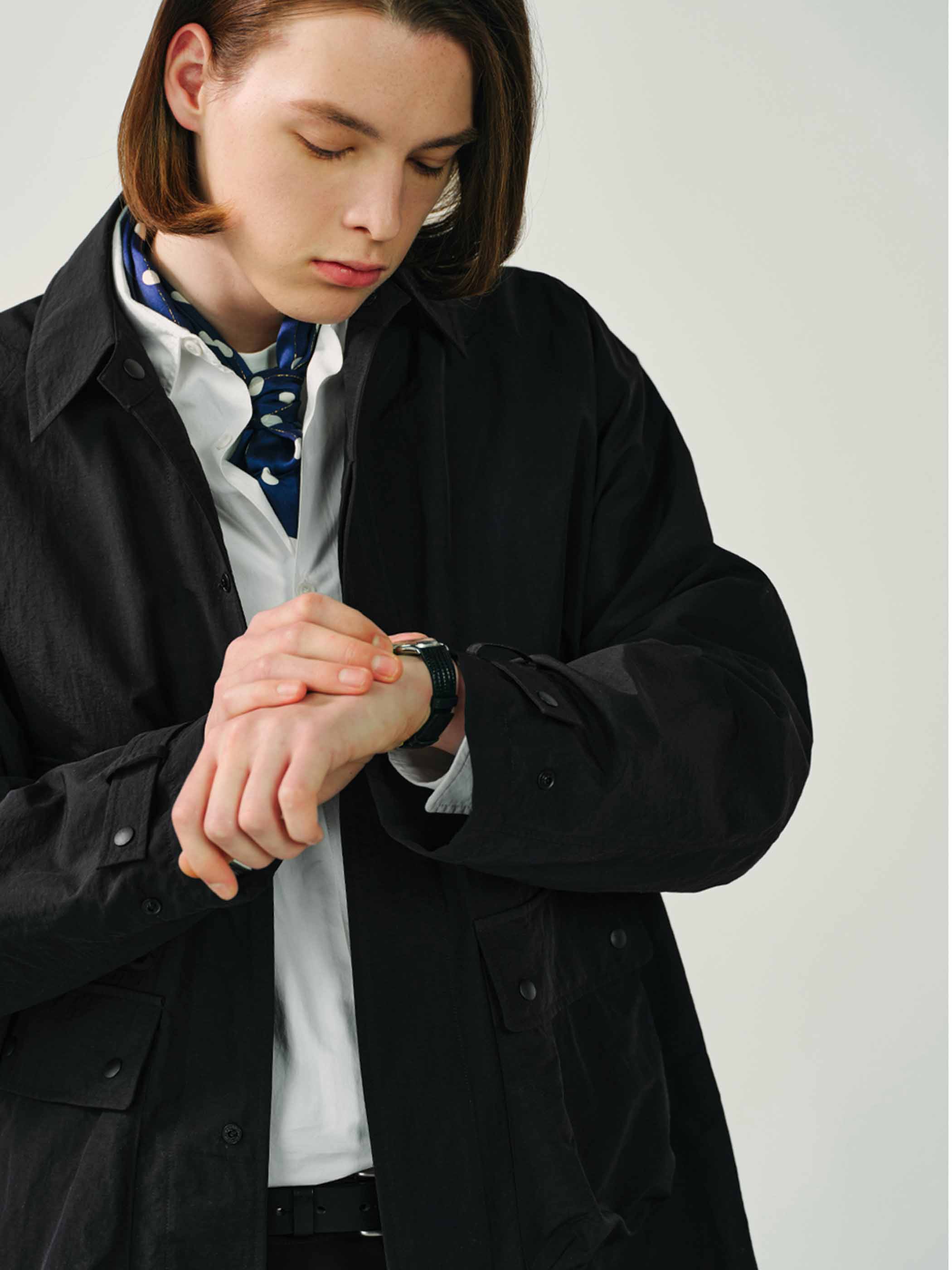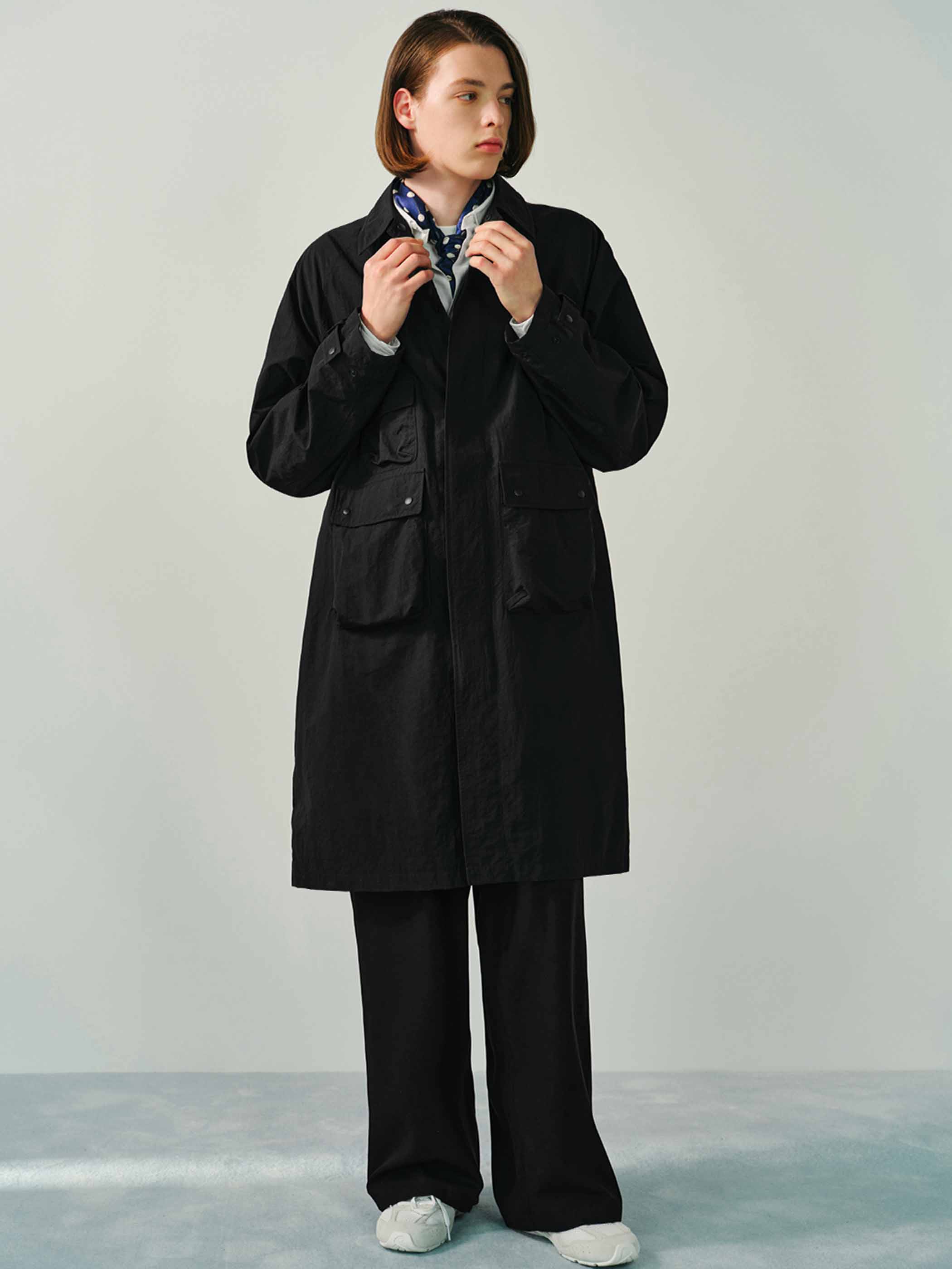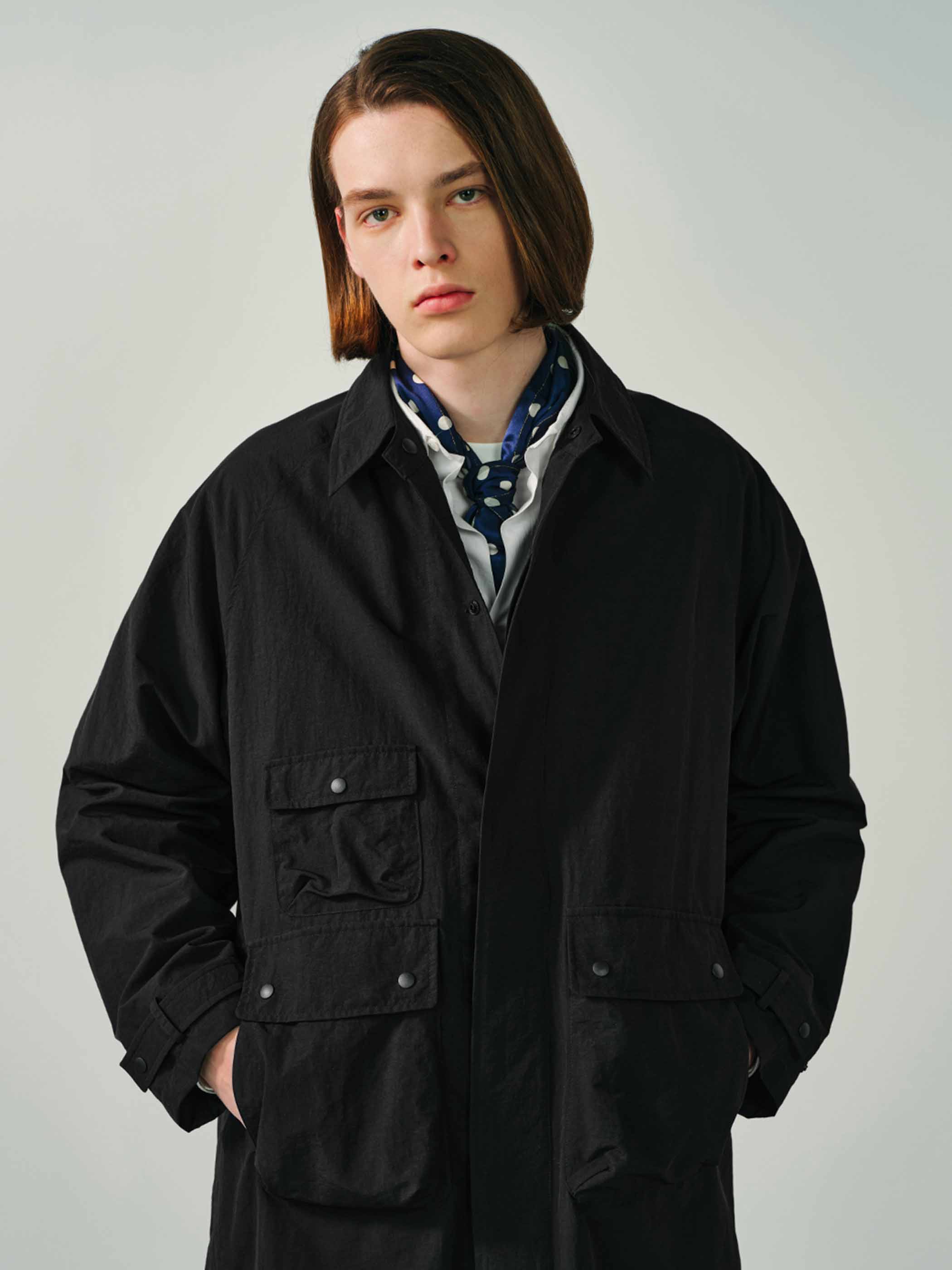 本コートは、伝統的なバルマカーン風コートを基に、輸入紙感ナイロン生地を使用して独特なマット感と微細なしわ模様を演出している。軽量でありながら長丈コートのドレープ感を抑え、ルーズなシルエットを実現している。前身頃は対称のフラップポケットで工装風ディテールを強調し、内側にはカード収納用の隠しポケットを装備。袖口は調節可能なボタン仕様で、古風な金属製デザインがアクセントとなる。カキ色とネイビー色の2色展開により、幅広いスタイルに合わせたコーディネートが可能です。