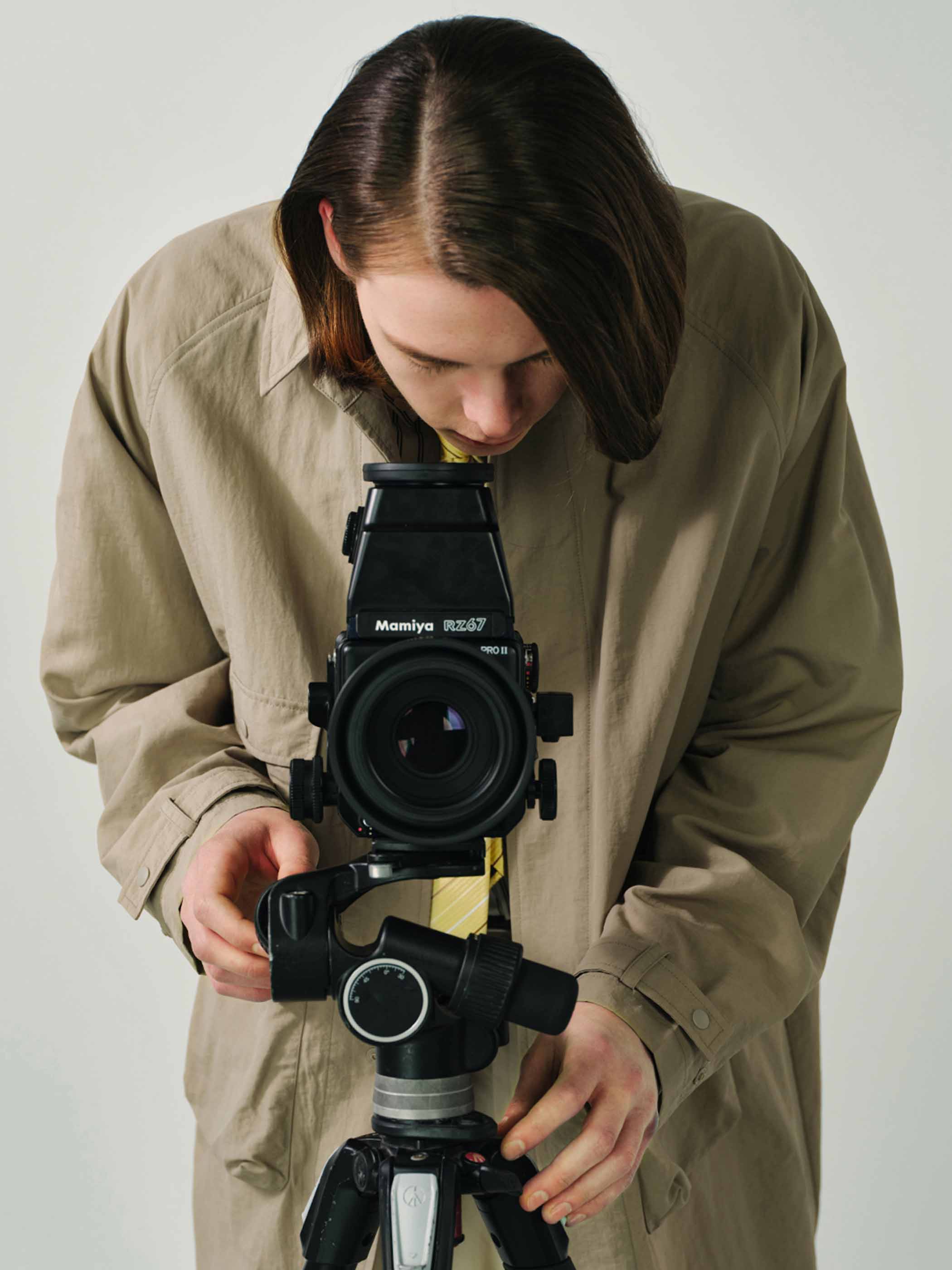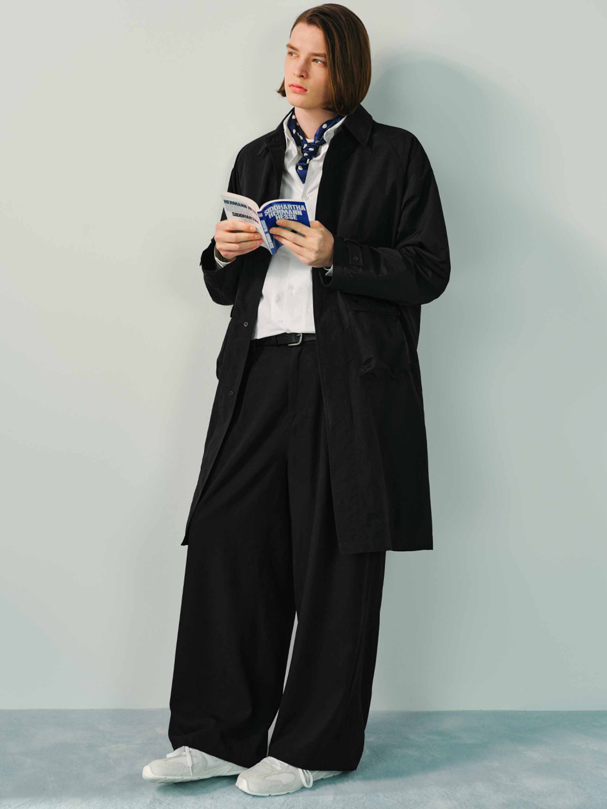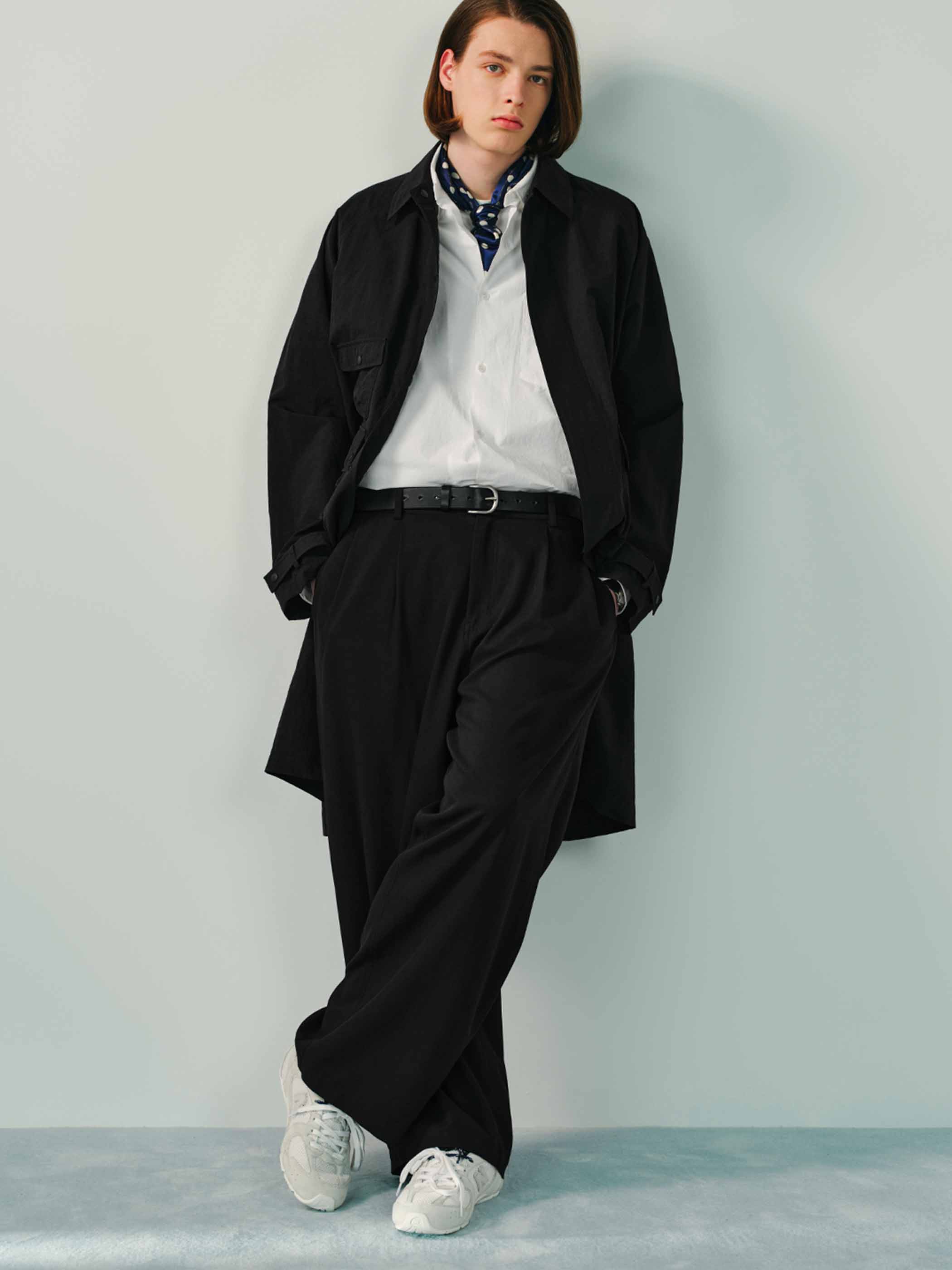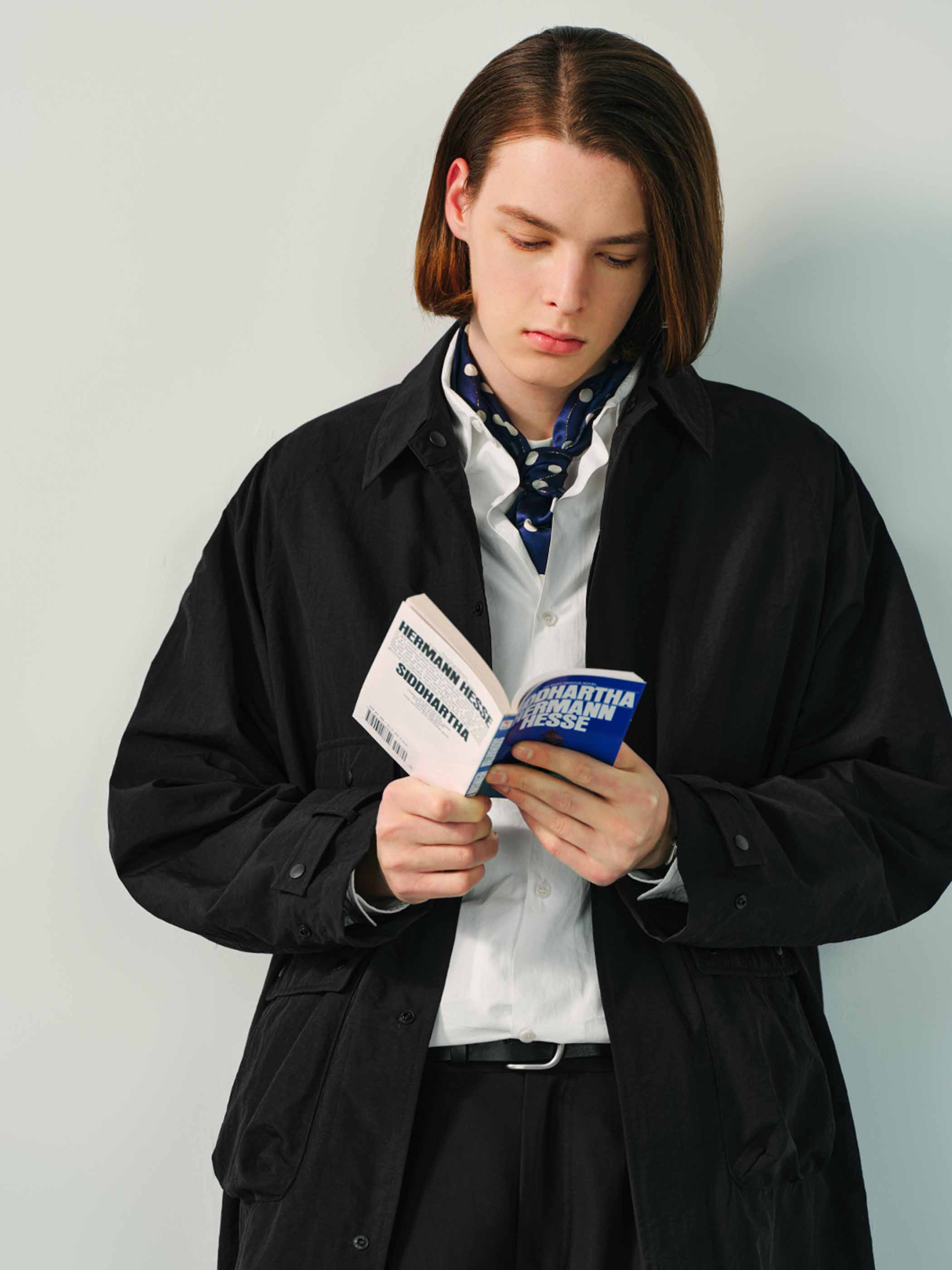 本コートは、伝統的なバルマカーン風コートを基に、輸入紙感ナイロン生地を使用して独特なマット感と微細なしわ模様を演出している。軽量でありながら長丈コートのドレープ感を抑え、ルーズなシルエットを実現している。前身頃は対称のフラップポケットで工装風ディテールを強調し、内側にはカード収納用の隠しポケットを装備。袖口は調節可能なボタン仕様で、古風な金属製デザインがアクセントとなる。カキ色とネイビー色の2色展開により、幅広いスタイルに合わせたコーディネートが可能です。
