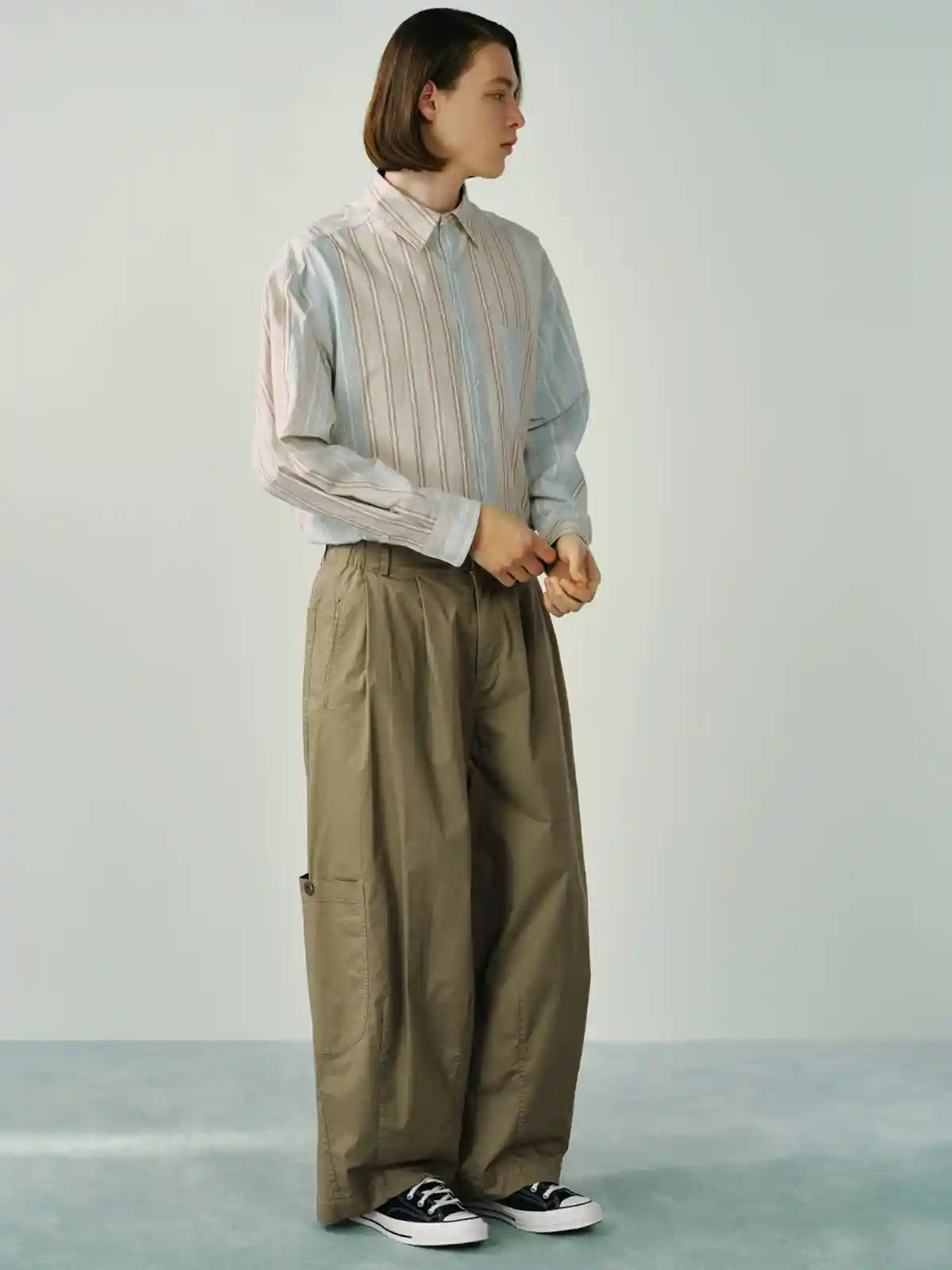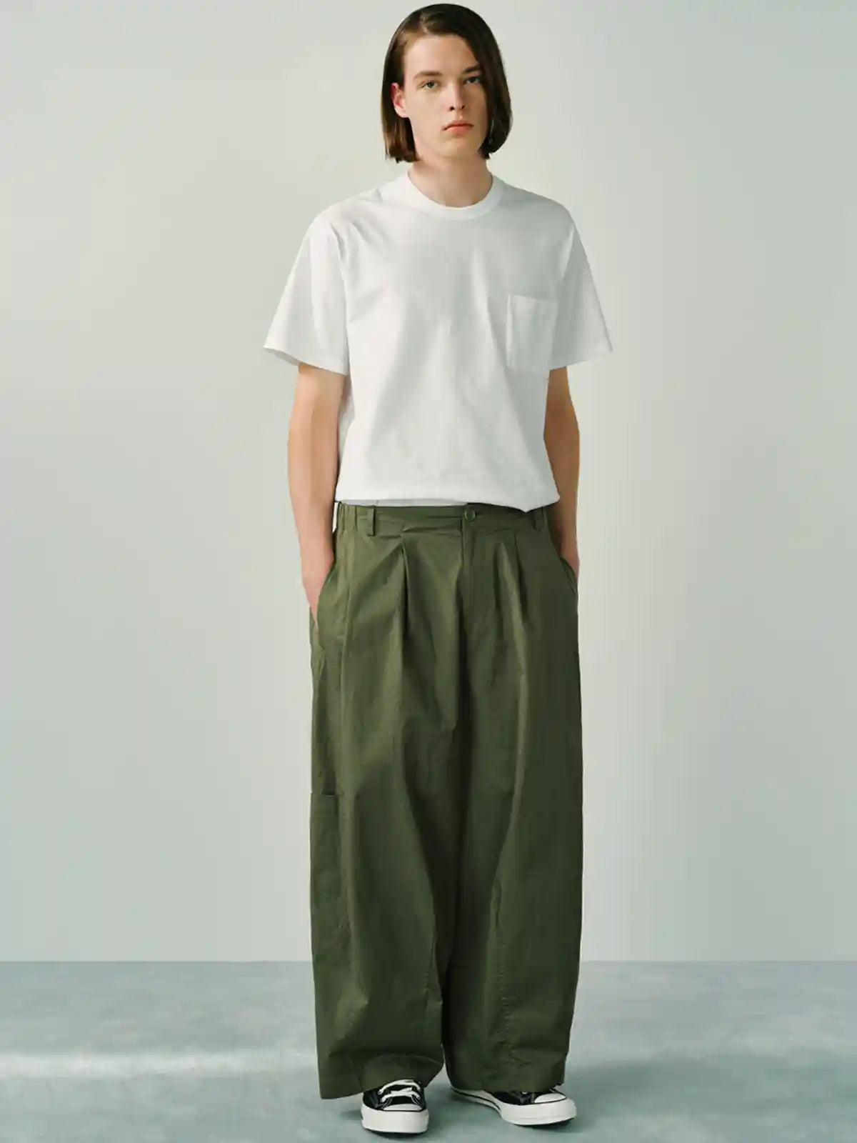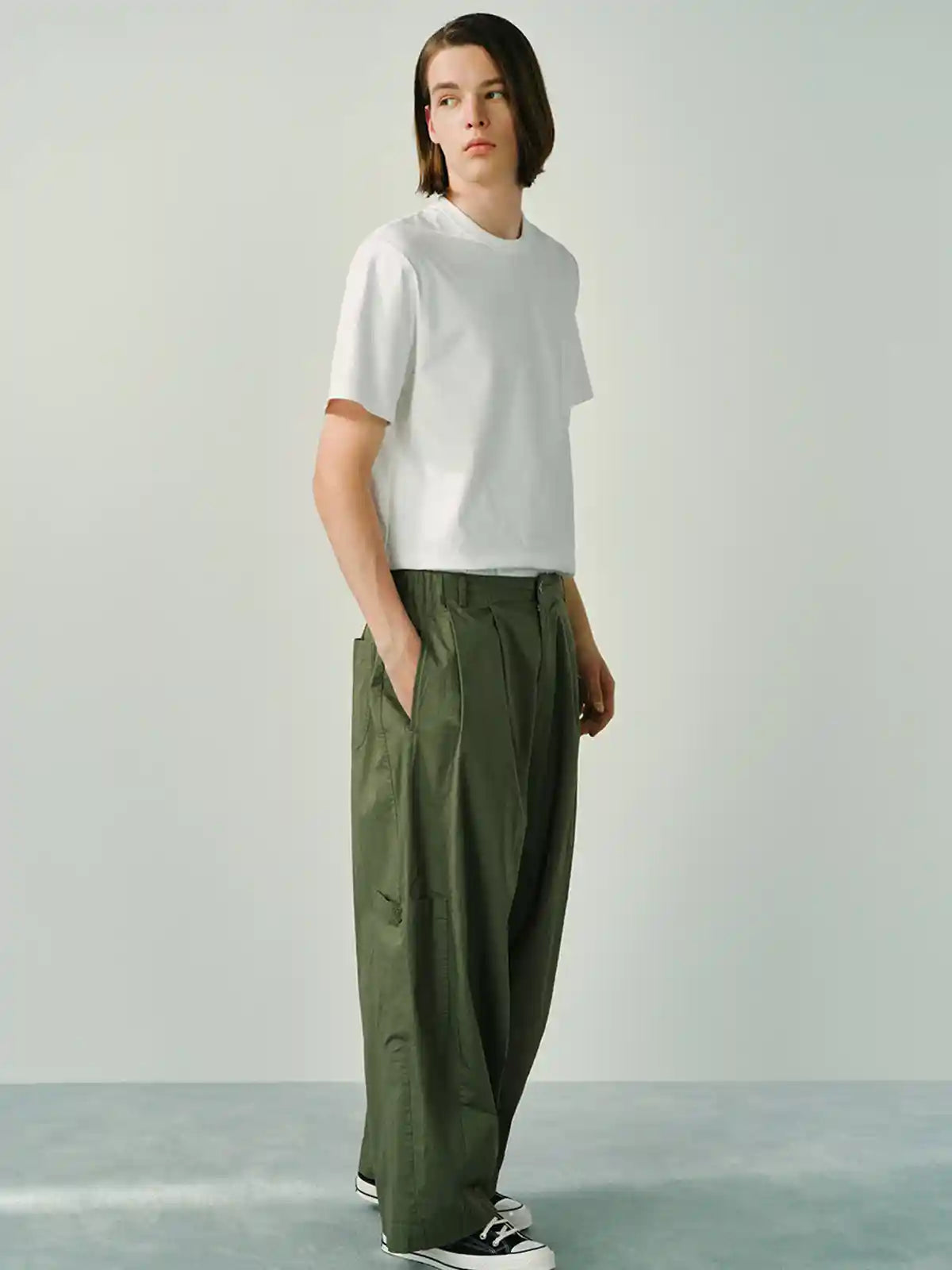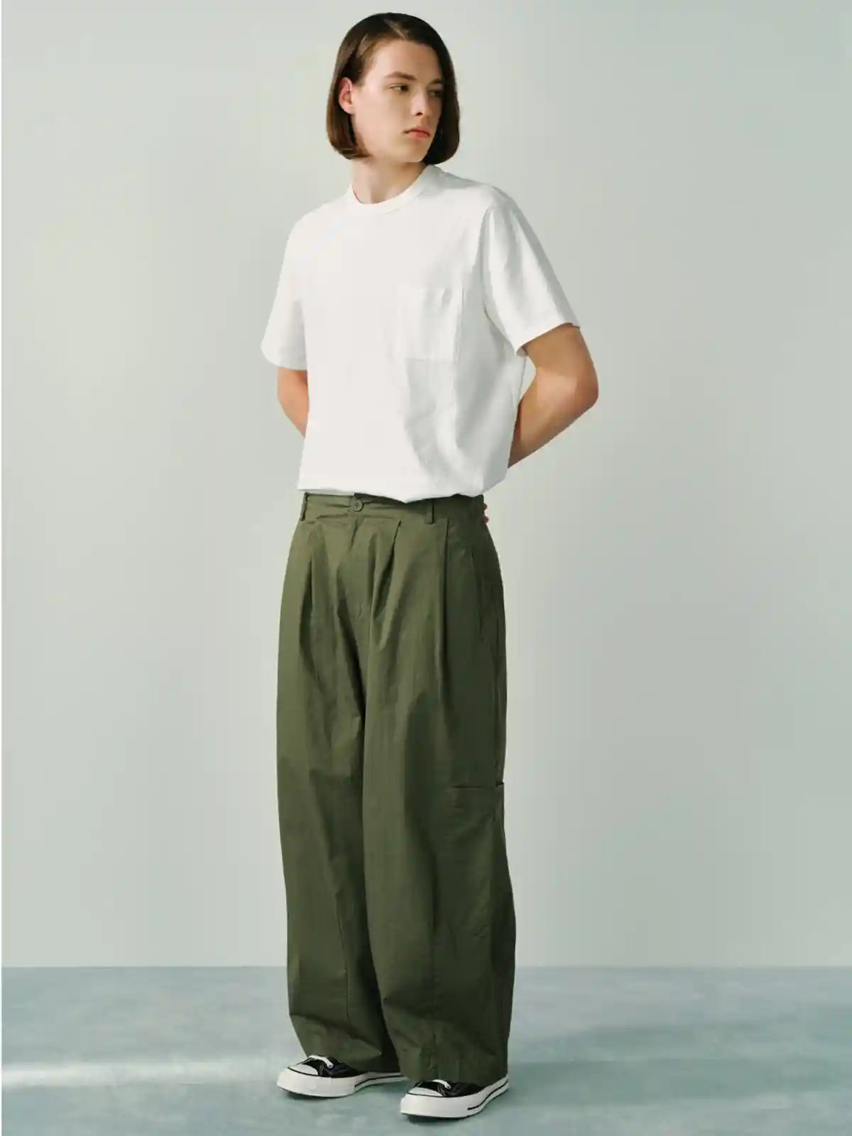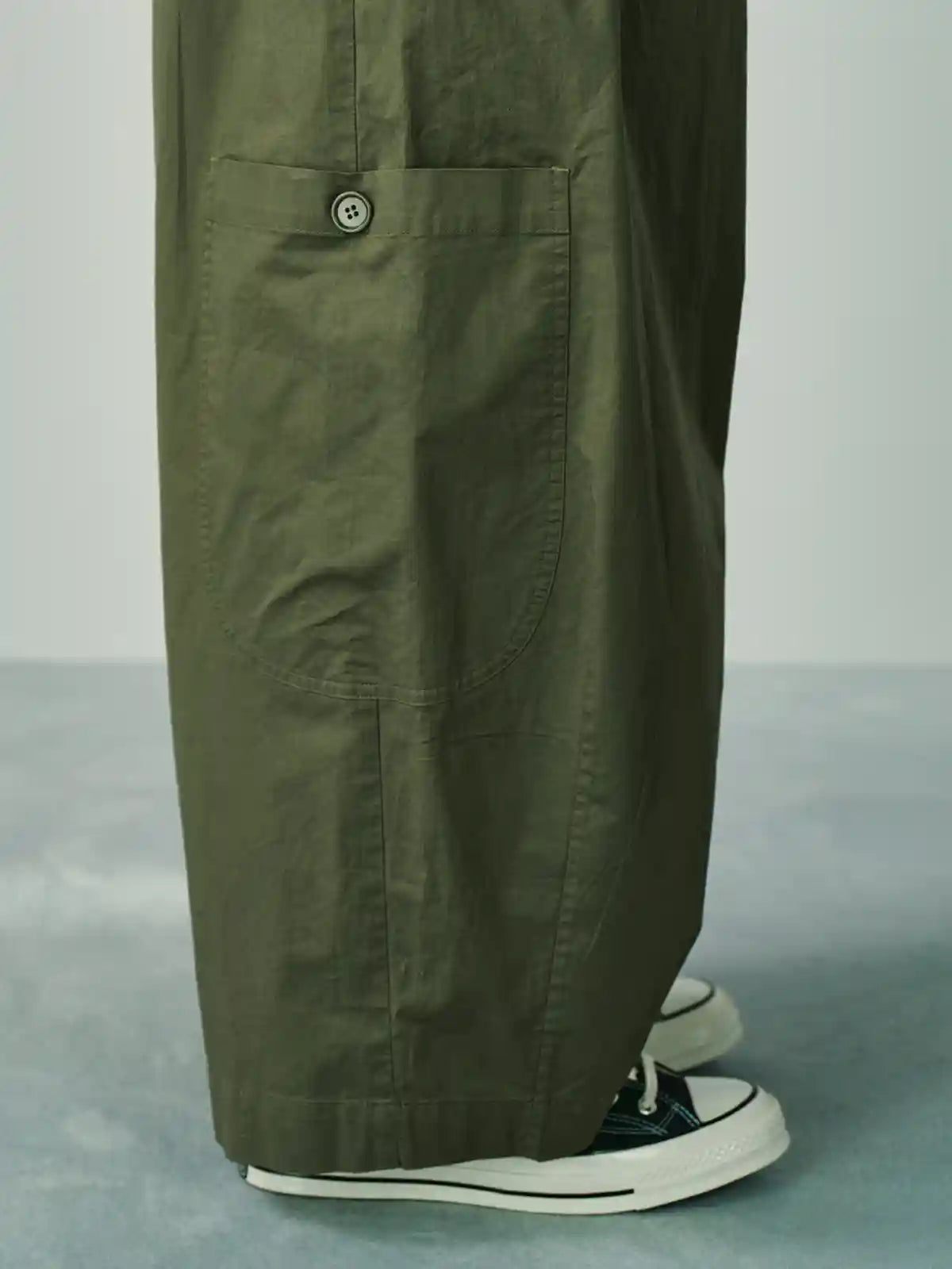 アメリカ産長綿を厳選使用し、柔らかな肌触りと上品な光沢感を実現。ヴィンテージ感のあるウォッシュ加工を施し、自然な風合いを演出。腿周りに余裕をもたせたバルーンシルエットで動きやすく快適。大きめのポケットを配し、機能性とデザイン性を両立。カーキとアーミーグリーンの2色展開で、スニーカーからブーツまで幅広く対応し、様々なスタイリングが楽しめます。日常の通勤から休日のカジュアルスタイルまで個性的な着こなしを叶えます。
