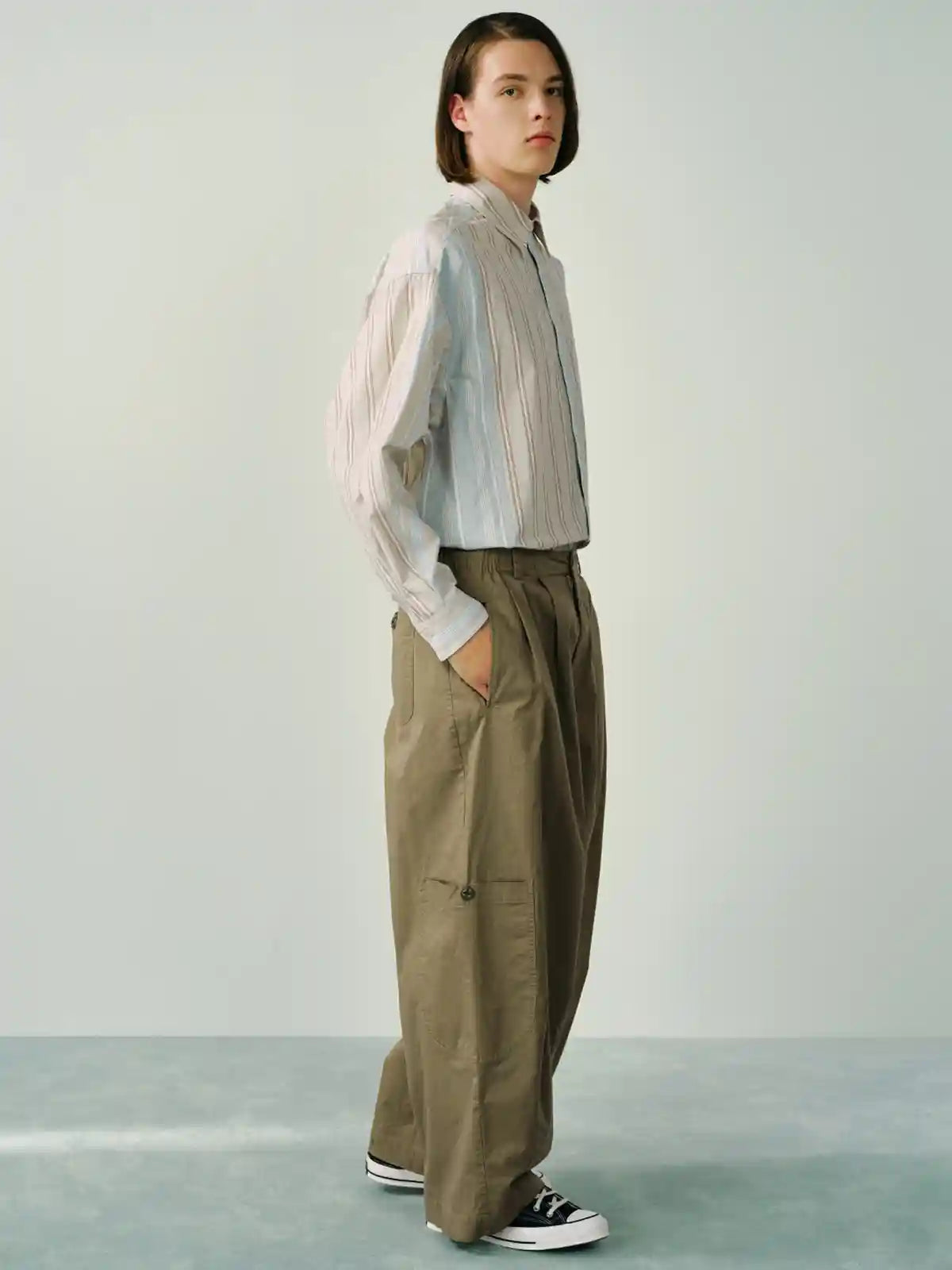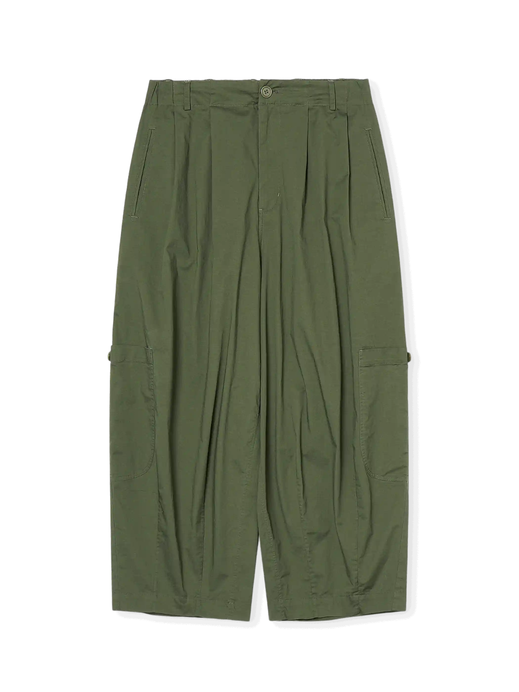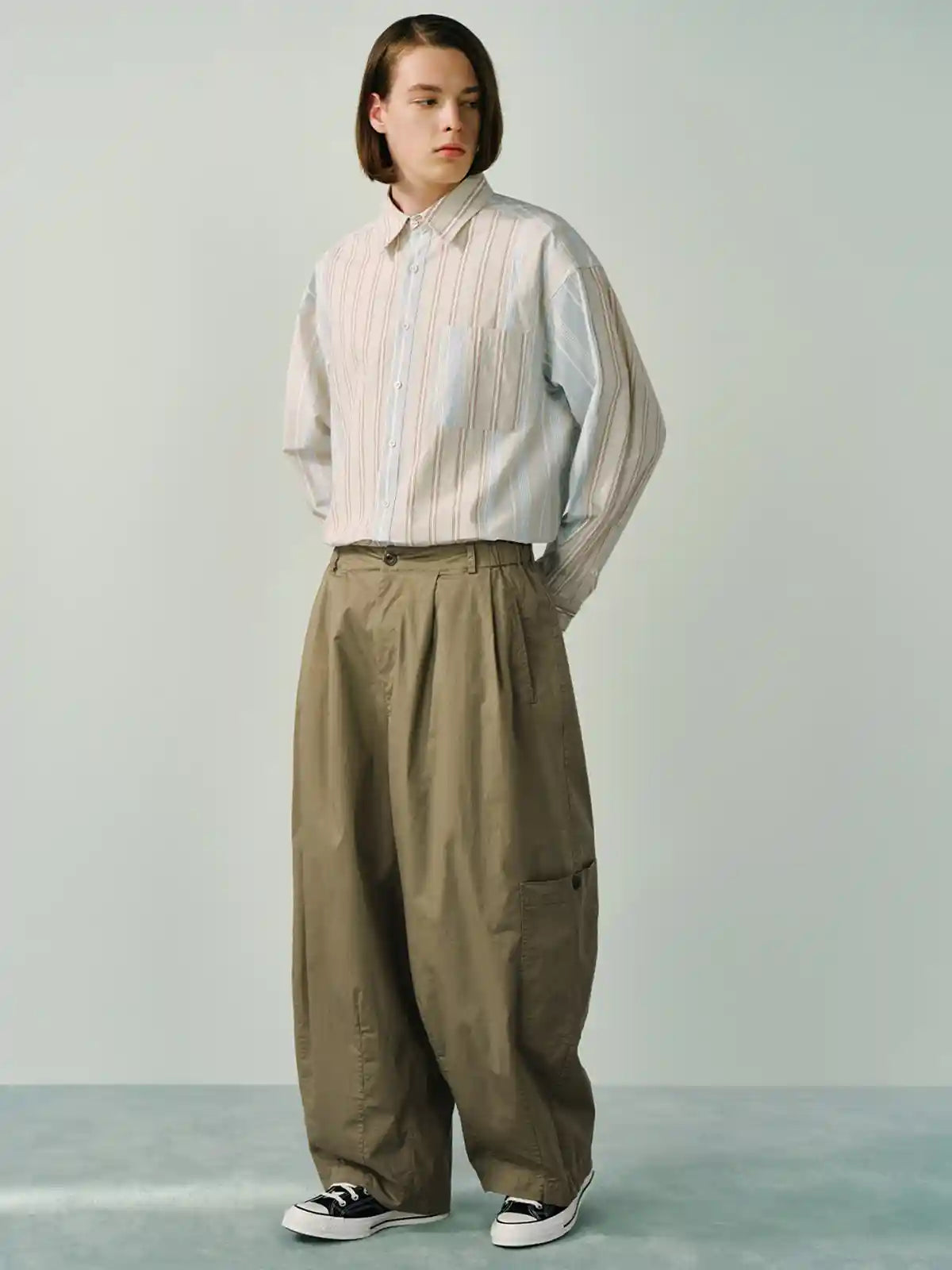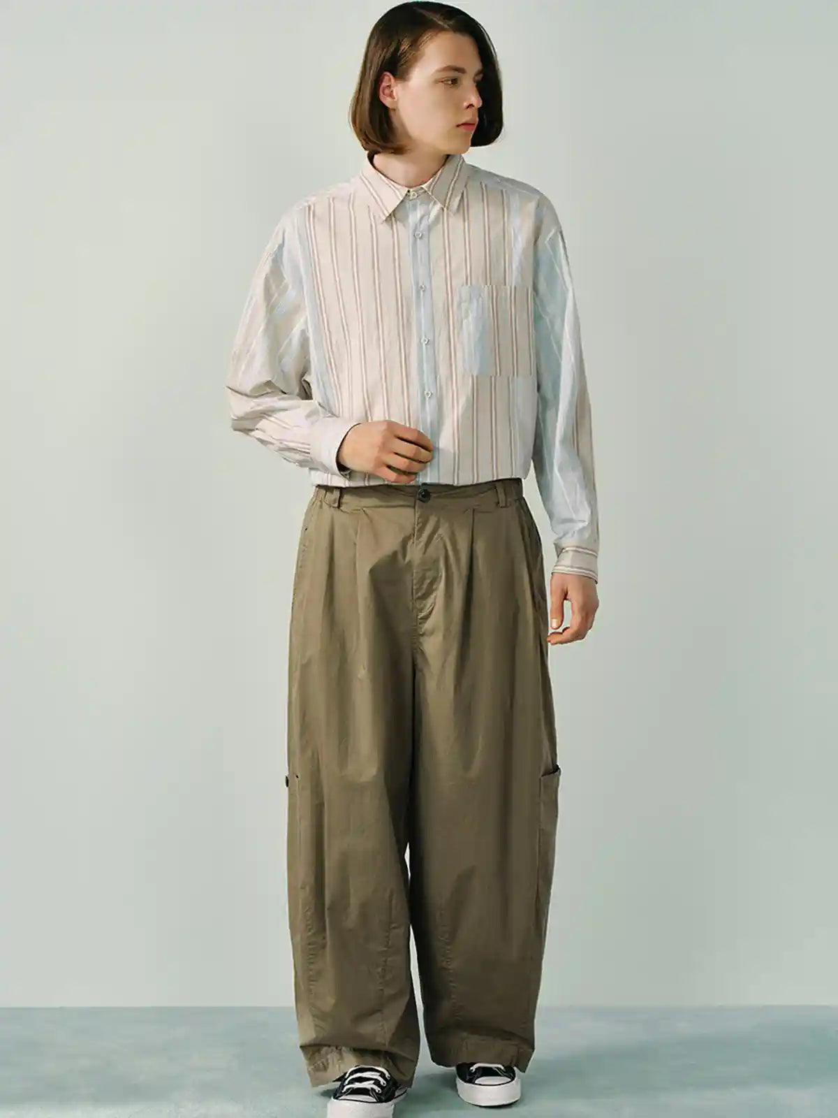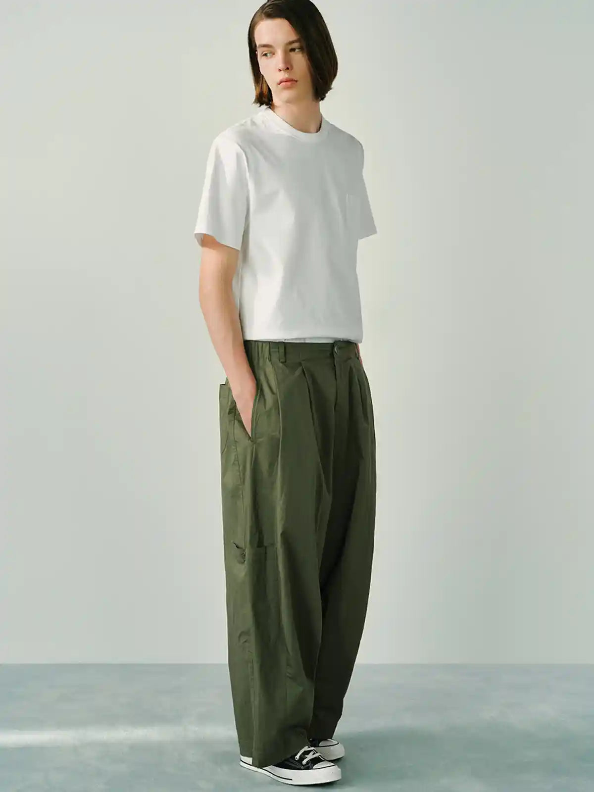 アメリカ産長綿を厳選使用し、柔らかな肌触りと上品な光沢感を実現。ヴィンテージ感のあるウォッシュ加工を施し、自然な風合いを演出。腿周りに余裕をもたせたバルーンシルエットで動きやすく快適。大きめのポケットを配し、機能性とデザイン性を両立。カーキとアーミーグリーンの2色展開で、スニーカーからブーツまで幅広く対応し、様々なスタイリングが楽しめます。日常の通勤から休日のカジュアルスタイルまで個性的な着こなしを叶えます。