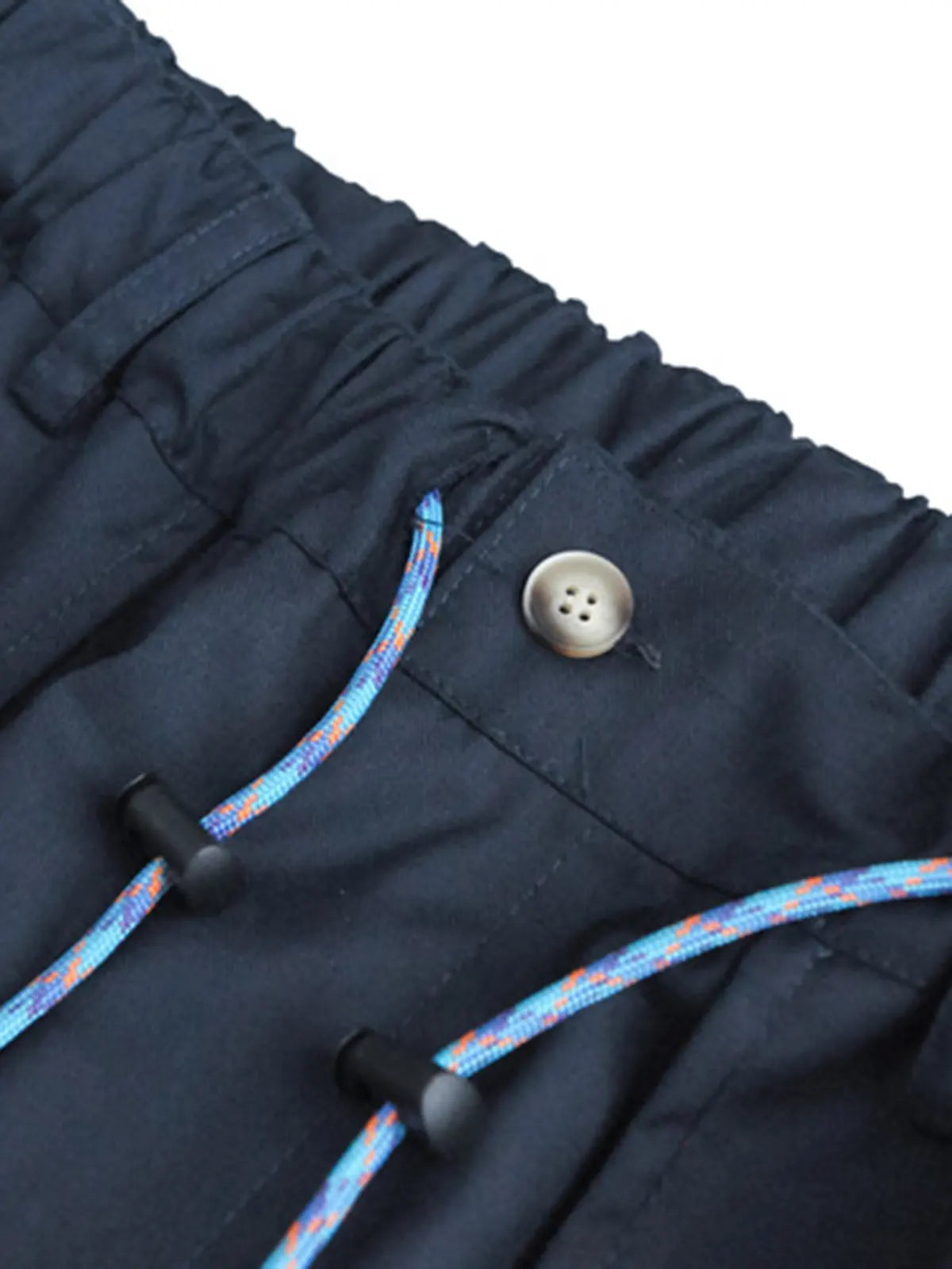 80%コットン、20%ポリエステルの混紡素材を採用し、快適さと耐久性を両立。ウエストはゴムとドローストリングで調整可能なため、通勤や軽いアウトドアシーンでも最適なフィット感を実現。ゆったりとしたデザインと豊富なポケットが、収納力と自由なスタイルを演出。スニーカーやワークシューズとの相性も抜群で、気軽かつ洗練された印象を与えます。