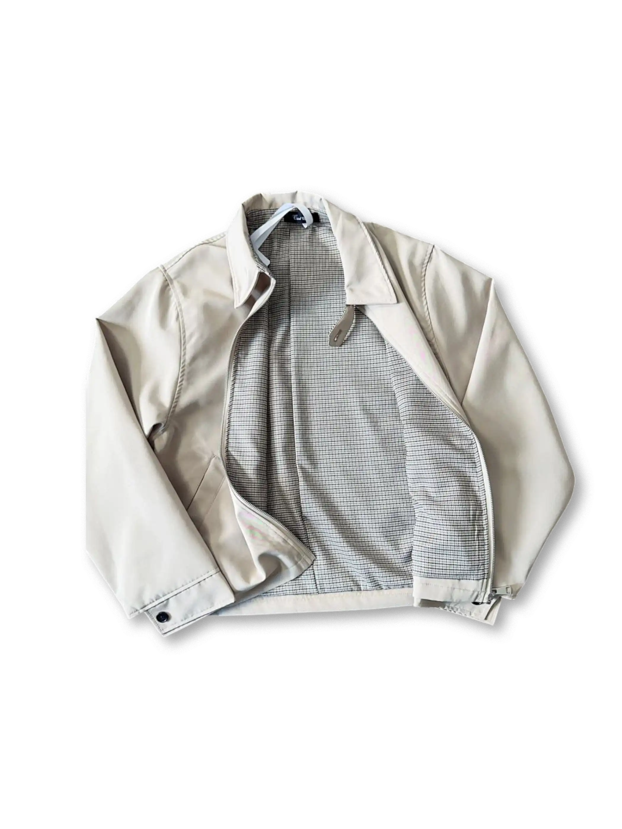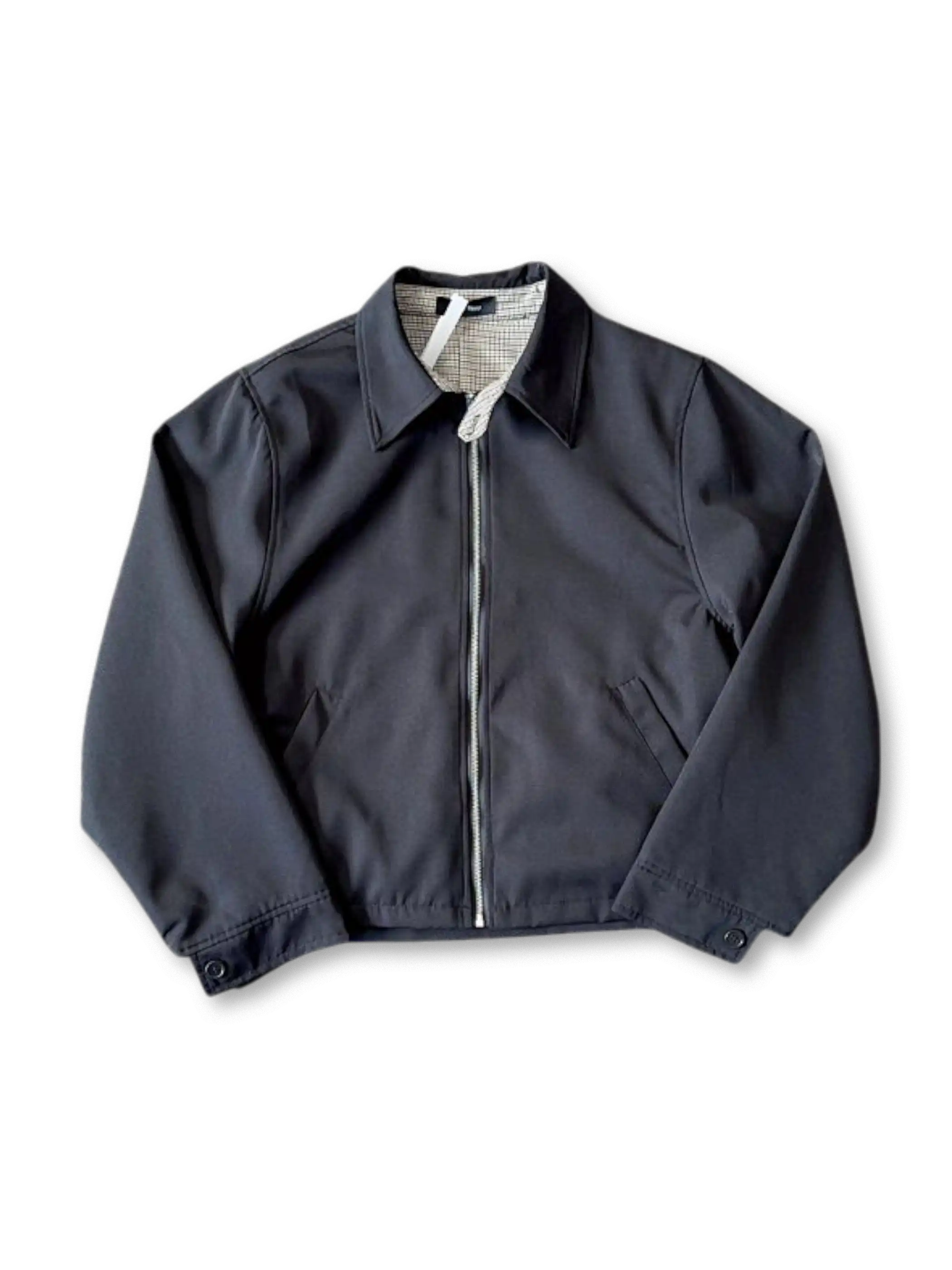 ミニマルなデザインと短めの着丈が印象的な、千鳥格子ライニングがアクセントのハリントンジャケット。