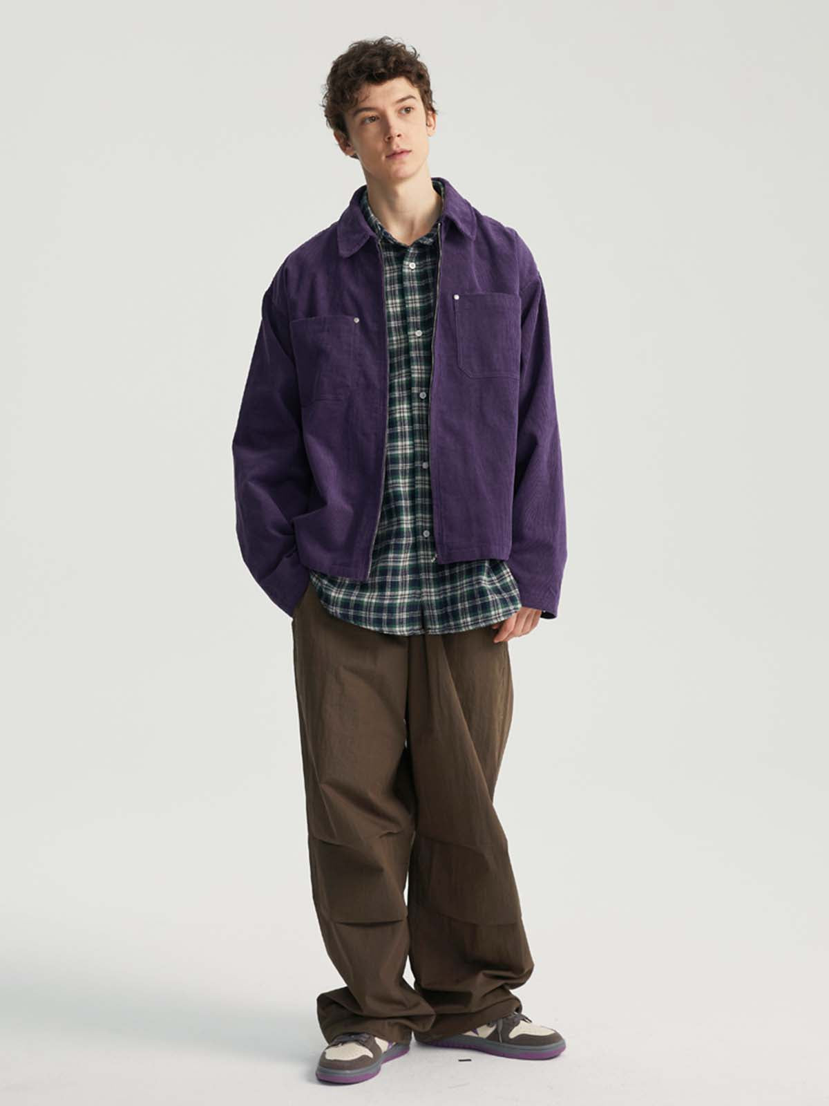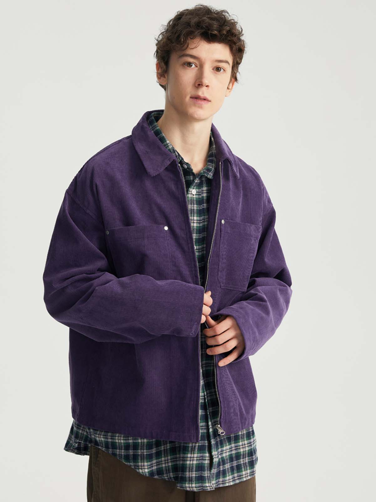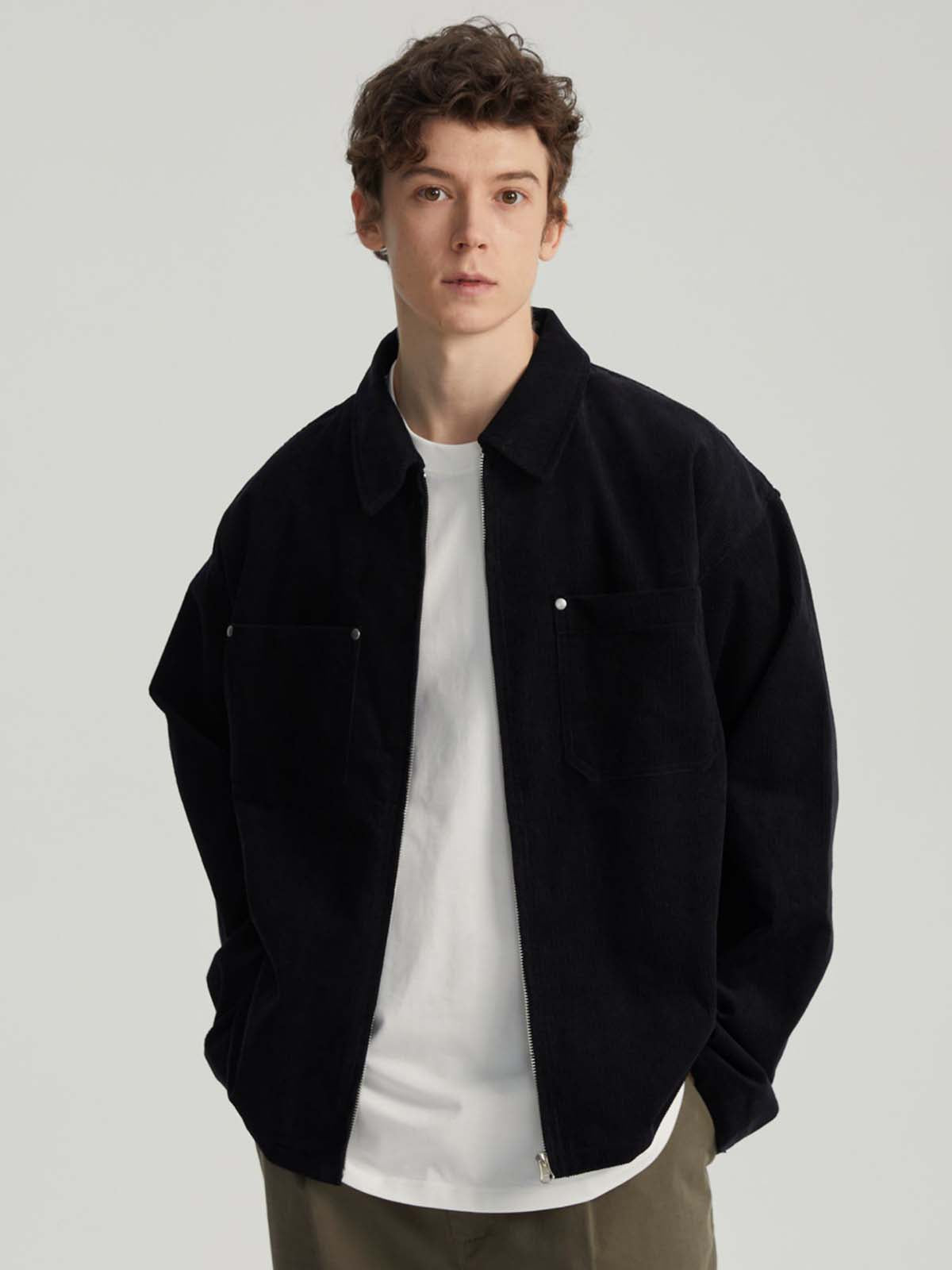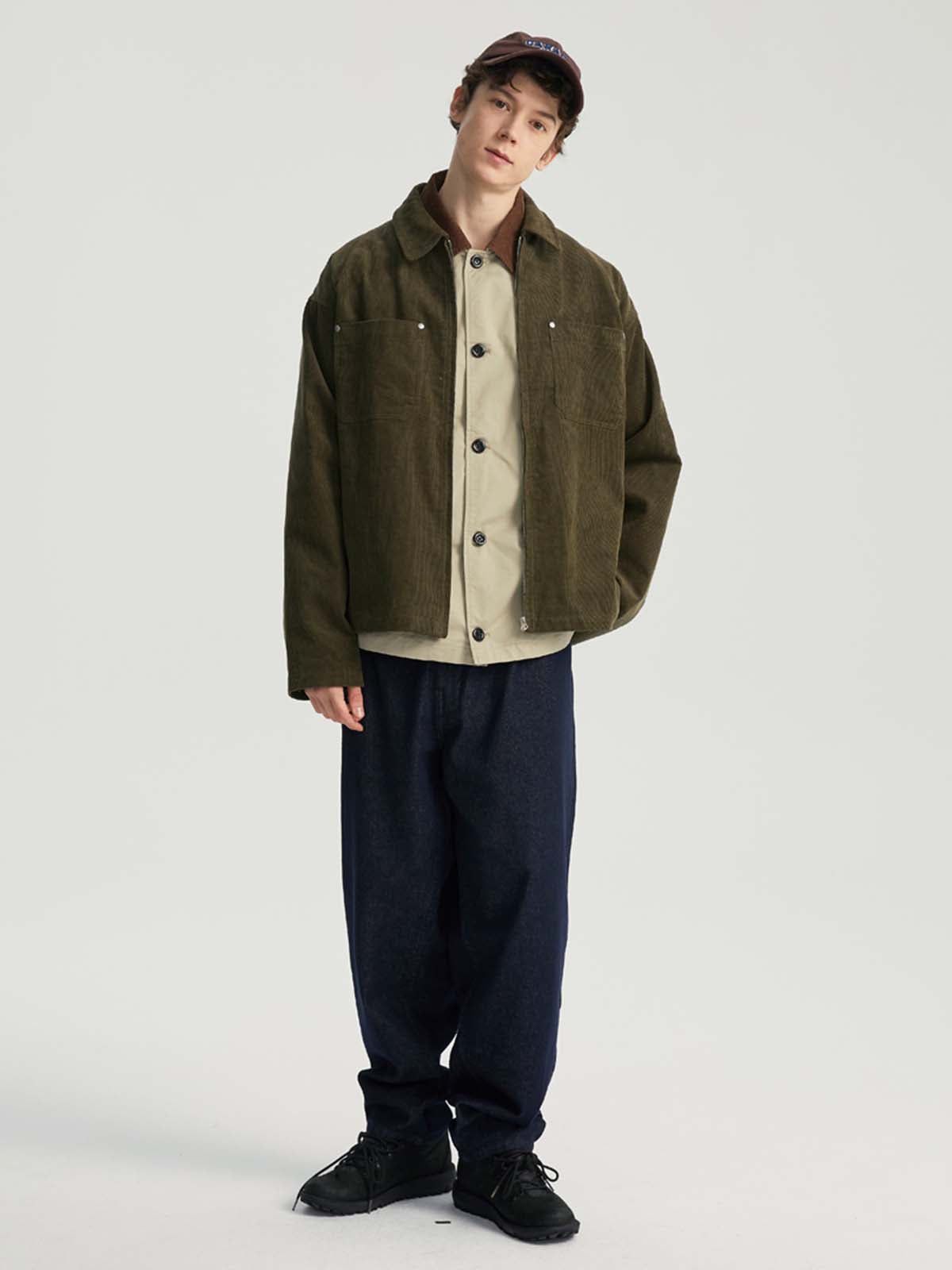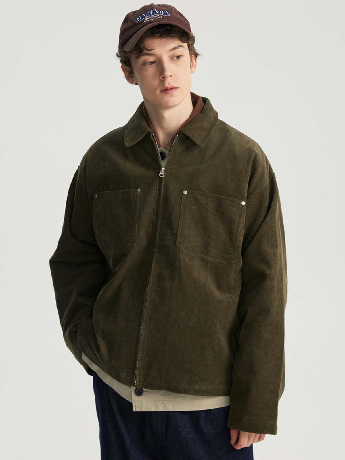 このジャケットは、純粋なコットンコーデュロイ生地を使用しており、ヴィンテージ感と快適さを両立させています。襟元とジッパーデザインがシンプルでありながらスタイリッシュな印象を与え、袖口のボタンディテールでさらに洗練された仕上がりに。胸部分には便利なスタッズポケットが施されており、実用性を高めつつ、ビジュアルにもアクセントを加えています。スッキリとした平らな裾デザインがジャケットをすっきりと見せ、カジュアルでスタイリッシュなコーディネートに最適です。