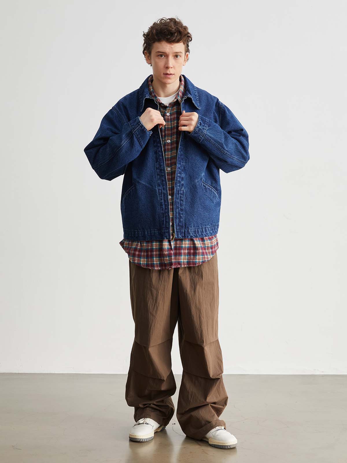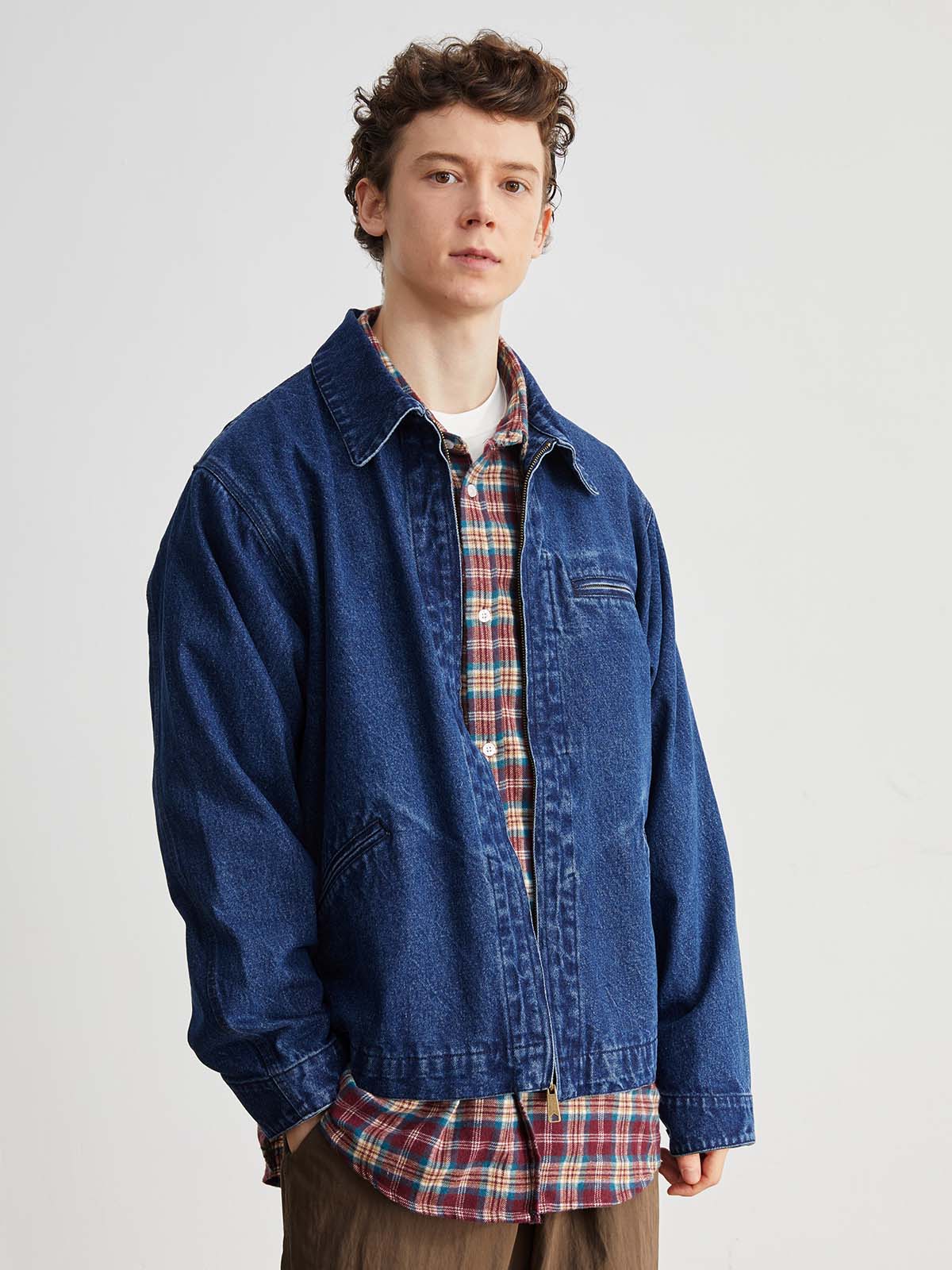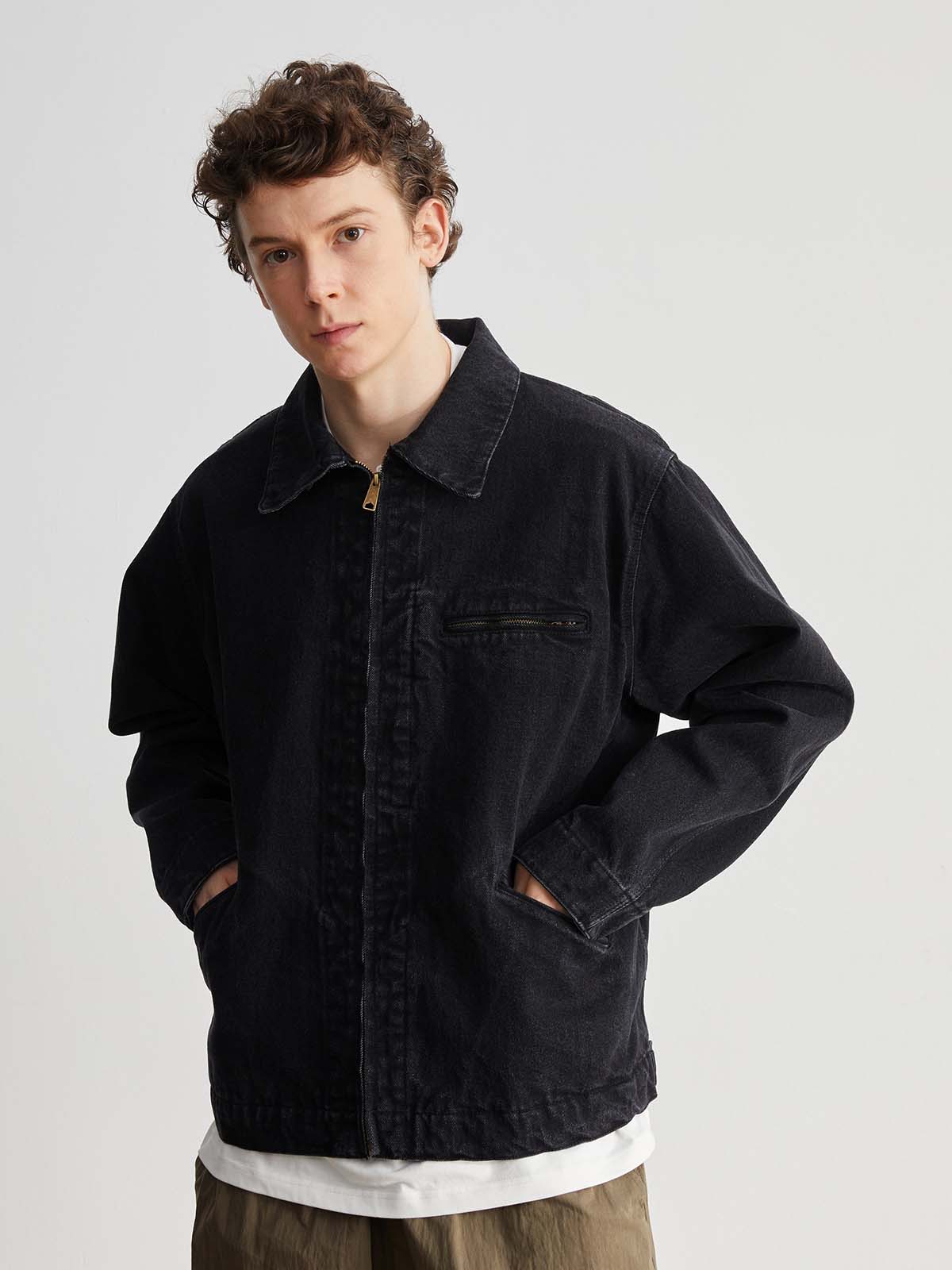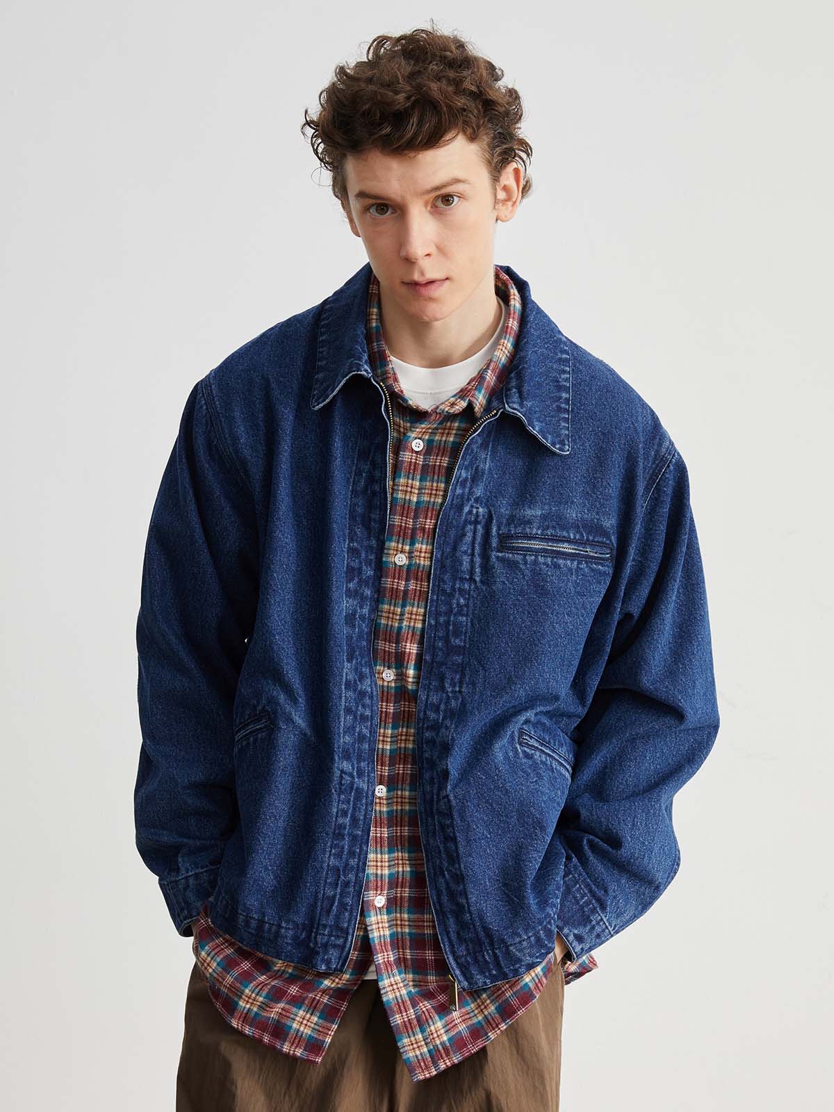 このジャケットは、アメリカンワークスタイルの定番デトロイトジャケットからインスパイアを受け、100%コットンデニム素材を使用しています。ウォッシュ加工による自然な色落ちが施され、ヴィンテージ感を強調しています。ショート丈で広めのフィット感が特徴で、さまざまな体型にフィットし、日常のコーディネートに奥行きを加えます。襟はジップアップデザインで、隠し金属ジッパーがシンプルながらもディテールを際立たせます。胸ポケットにはジッパーが付いており、小物を安全に収納できます。また、両サイドにスラッシュポケットがあり、実用性も向上しています。金属ボタンで仕上げられた裾部分が、全体のクオリティ感を高め、耐久性も確保しています。アメリカンワークスタイルにぴったりな一着です。