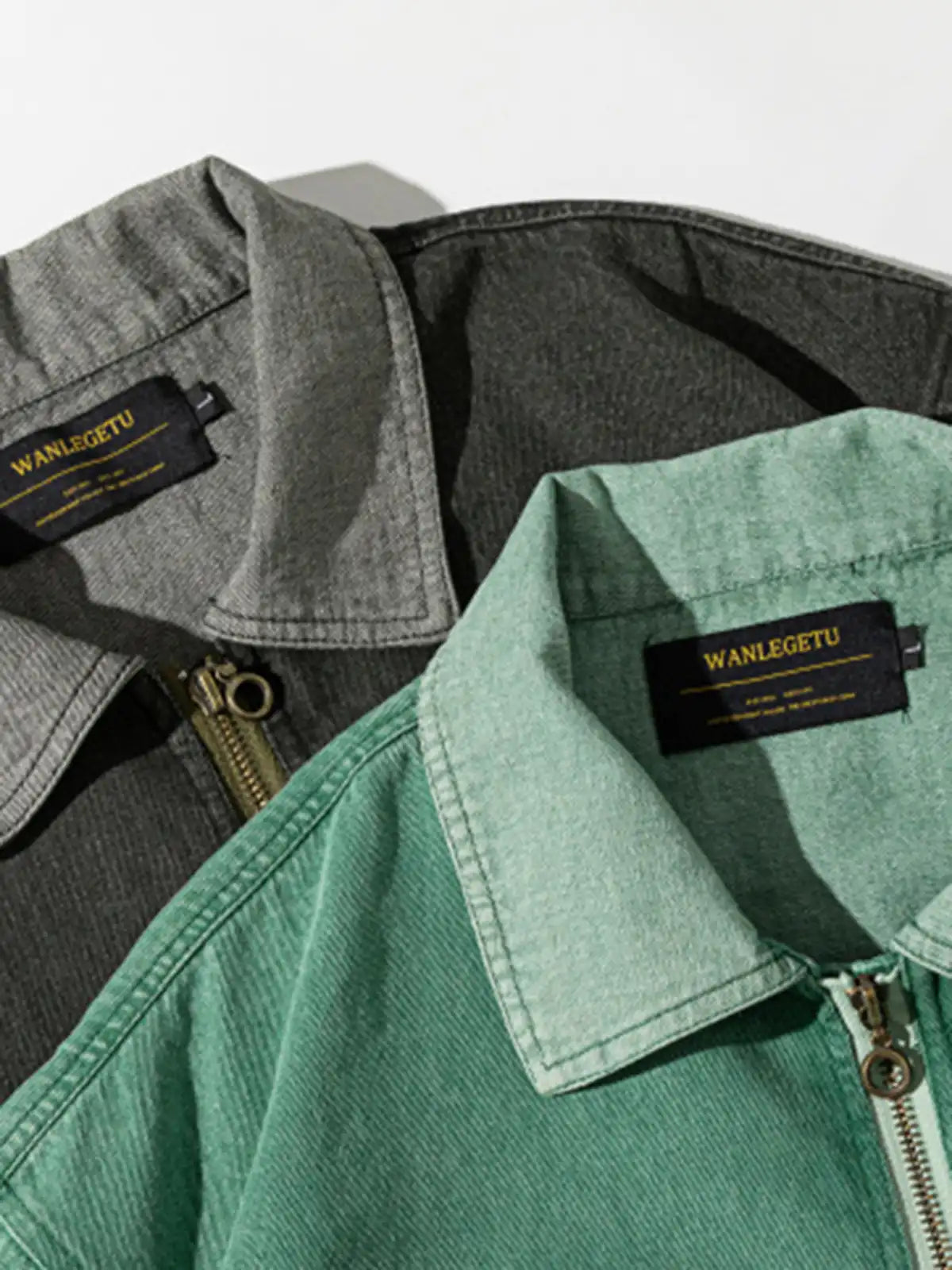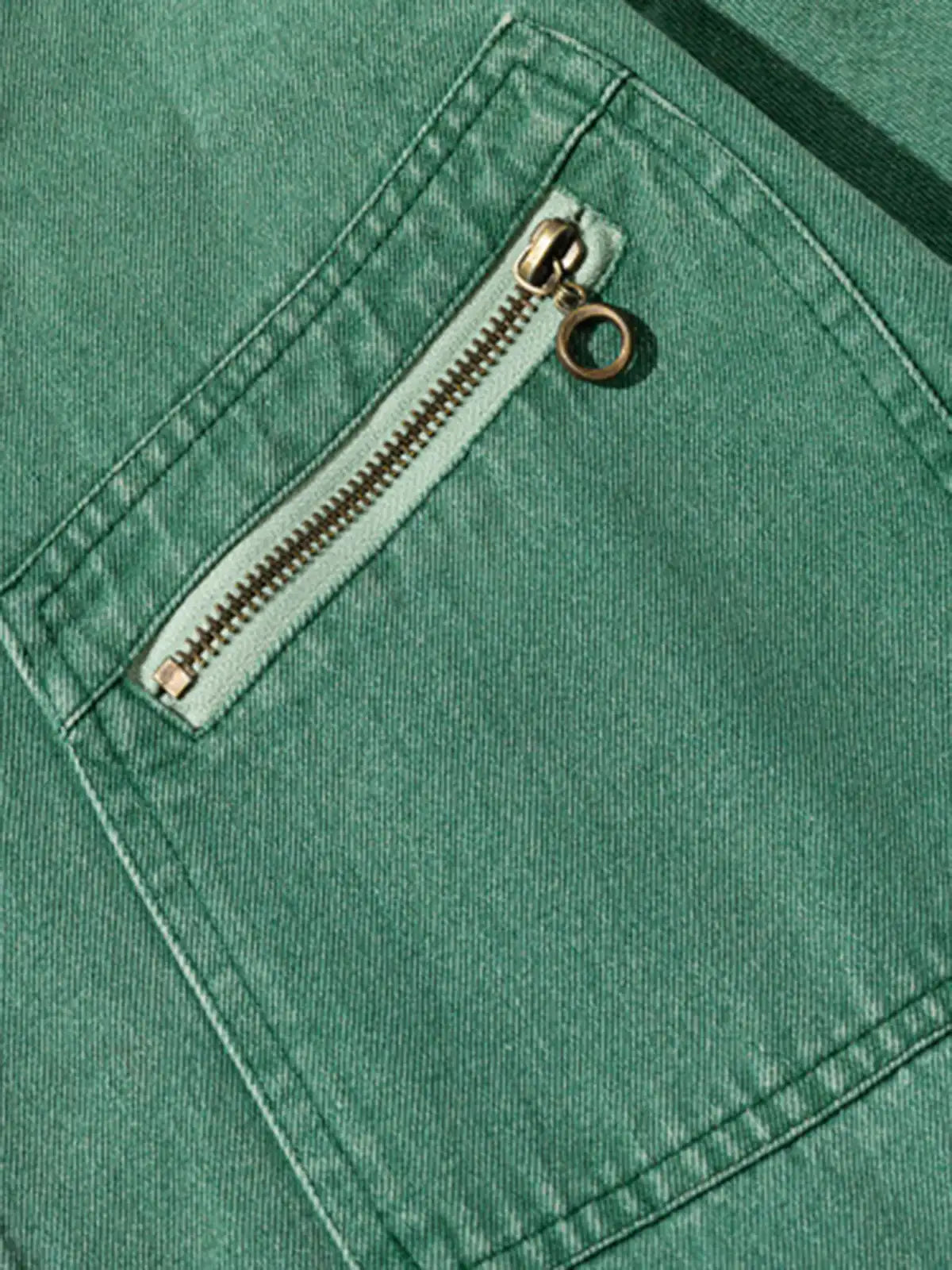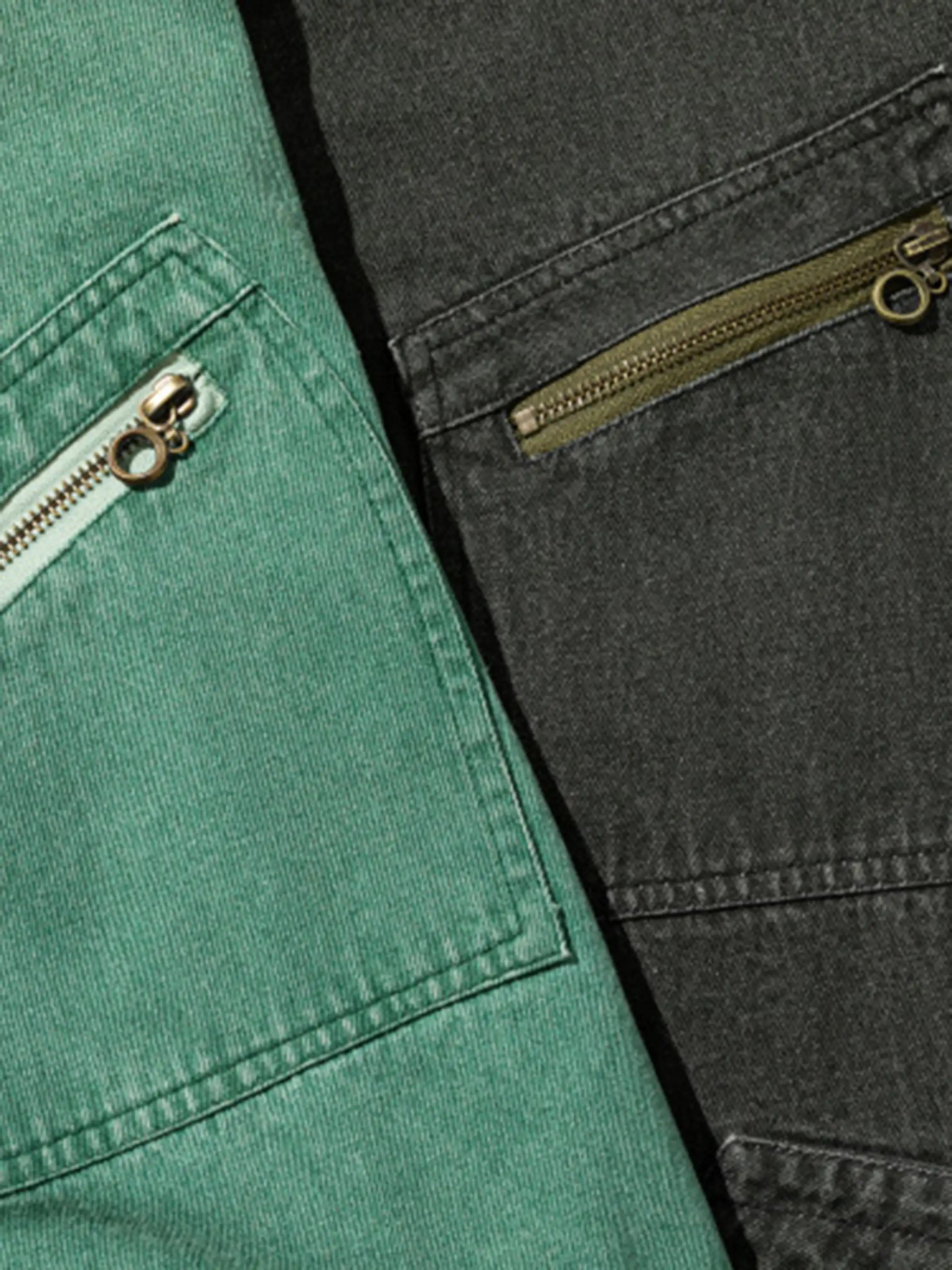 配色の襟がポイントとなり、胸ポケットやフロントジップなど機能性を重視したディテールがワークウェア感を高めています。90%コットンと10%ポリエステルの混紡素材を使用し、適度な厚みと耐久性を備えつつも、程よい軽さで春秋シーズンに最適。褪せ感のあるカラーリングがヴィンテージライクな雰囲気を演出し、ラフなデニムからチノパンまで、幅広いスタイリングにマッチします。肩周りにゆとりのあるシルエットで着心地も良く、胸ポケットやフロントポケットが実用面でも便利なデザイン。