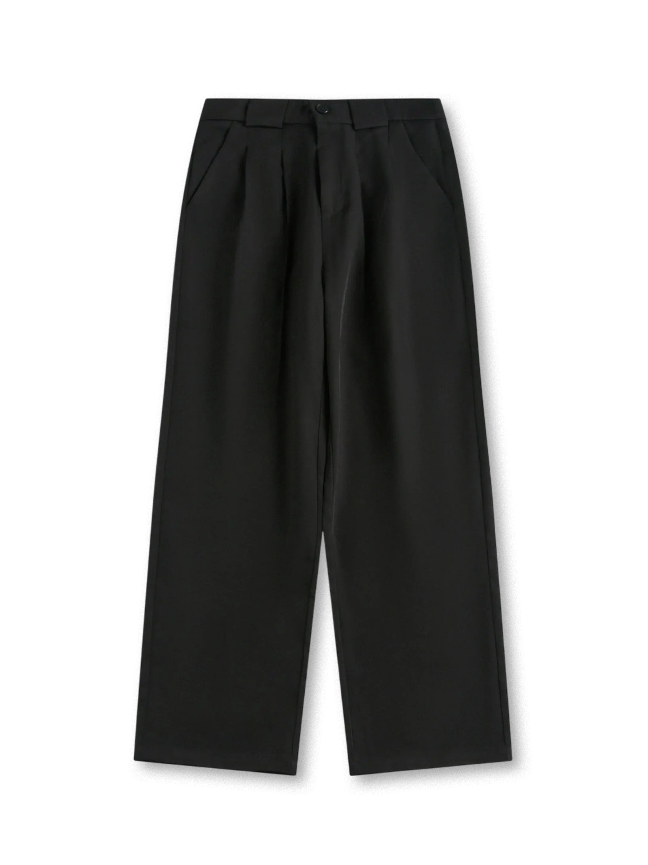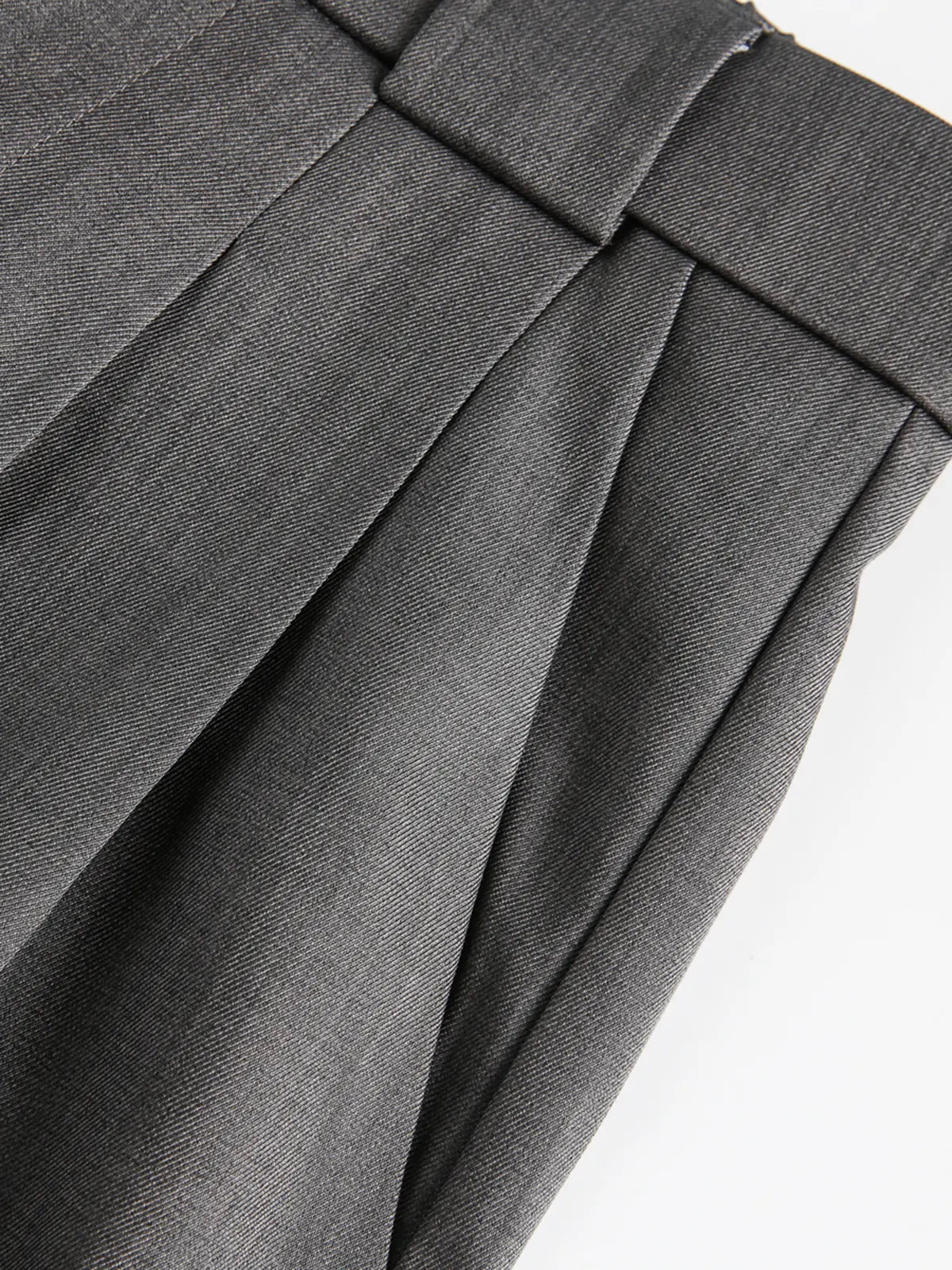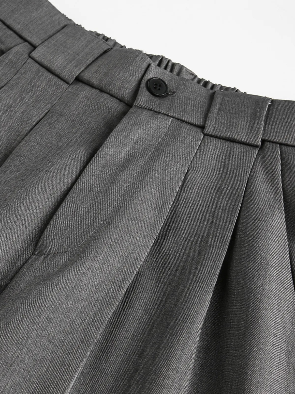 ダブルプリーツと流れるようなドレープが美しい、100%ポリエステル製のワイドストレートスラックス。