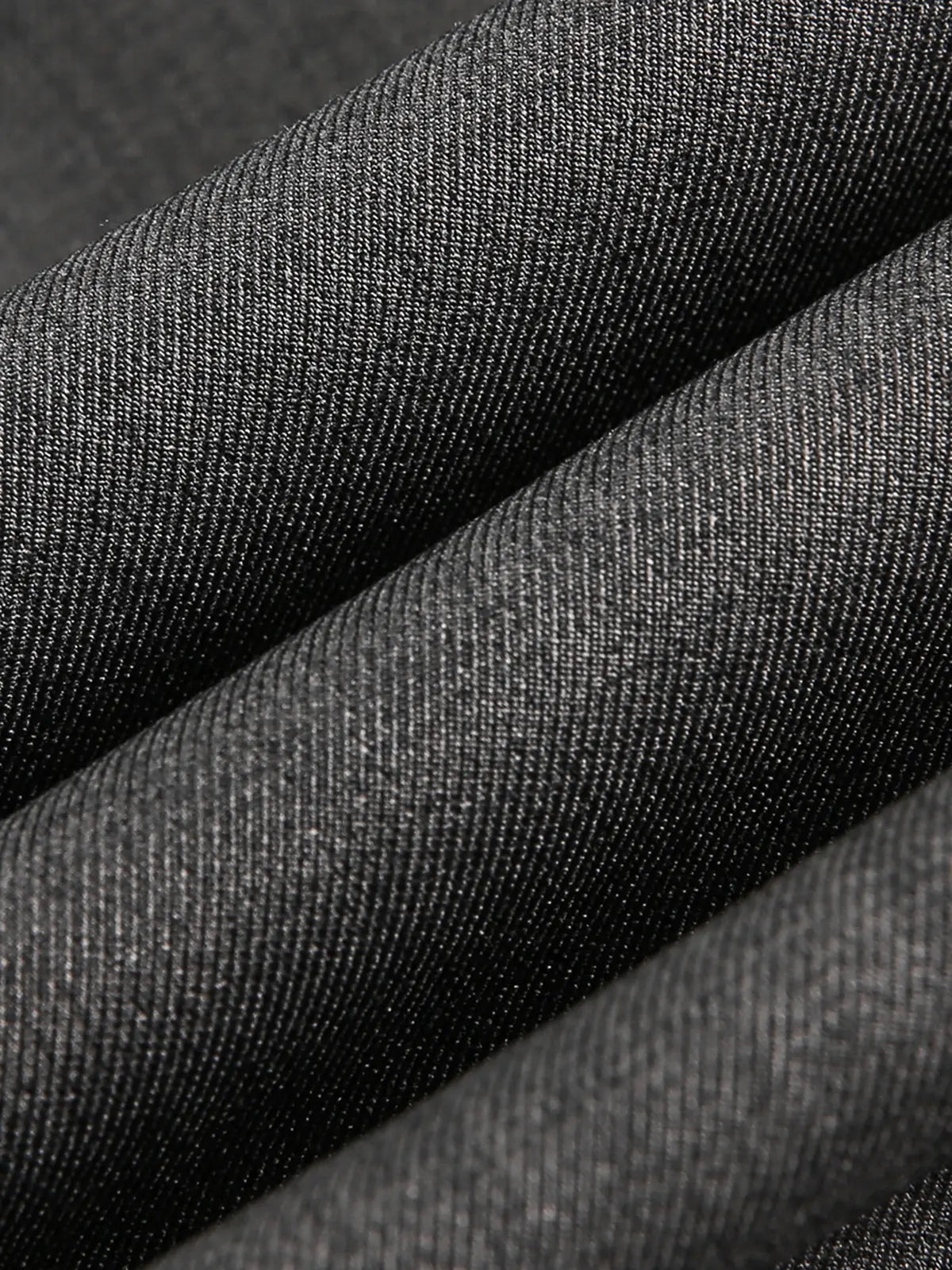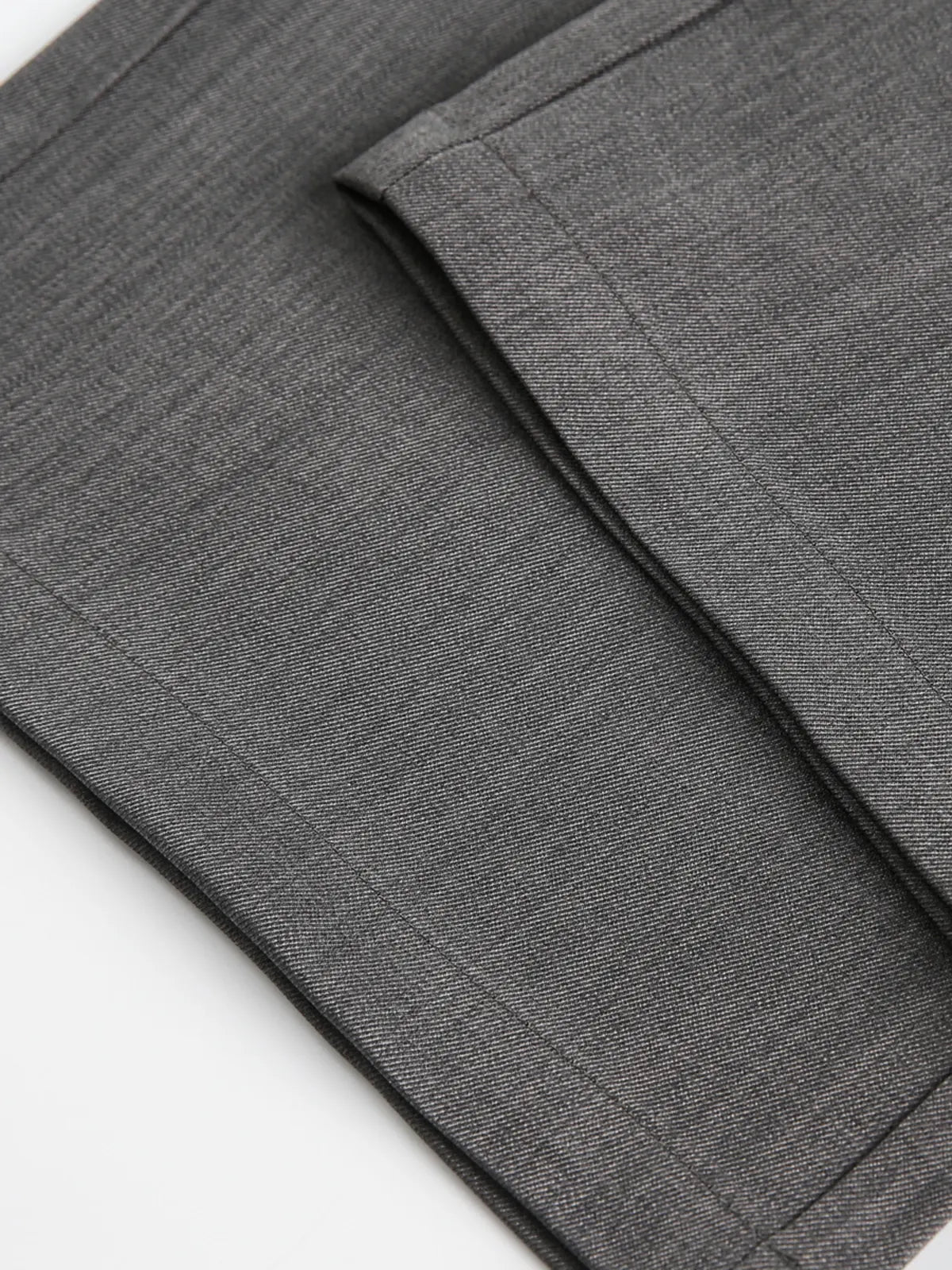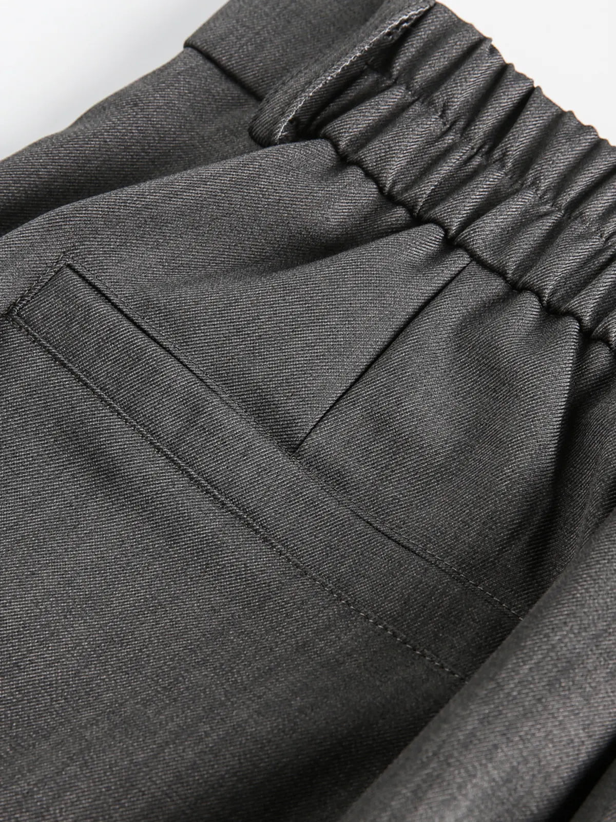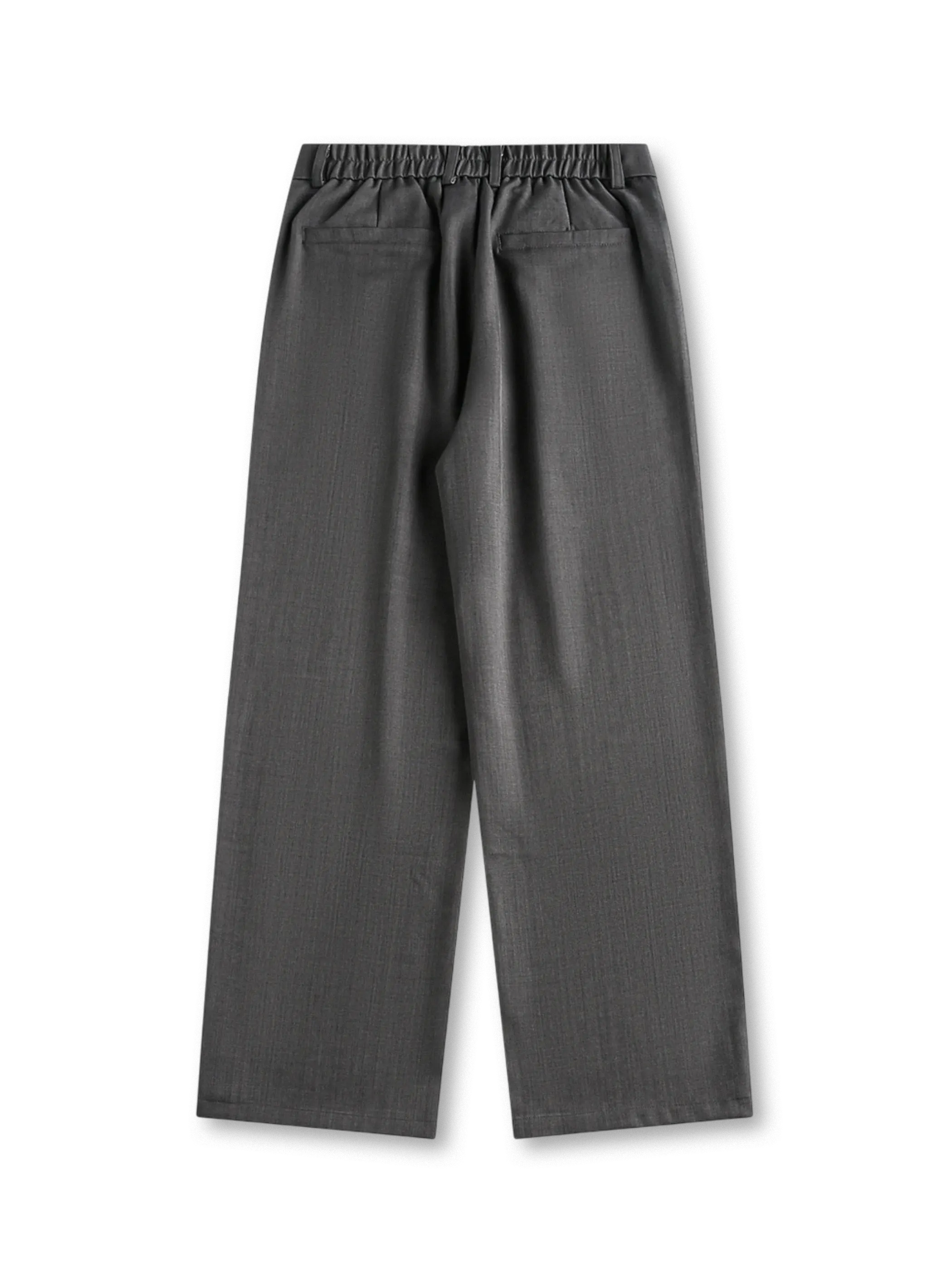 ダブルプリーツと流れるようなドレープが美しい、100%ポリエステル製のワイドストレートスラックス。