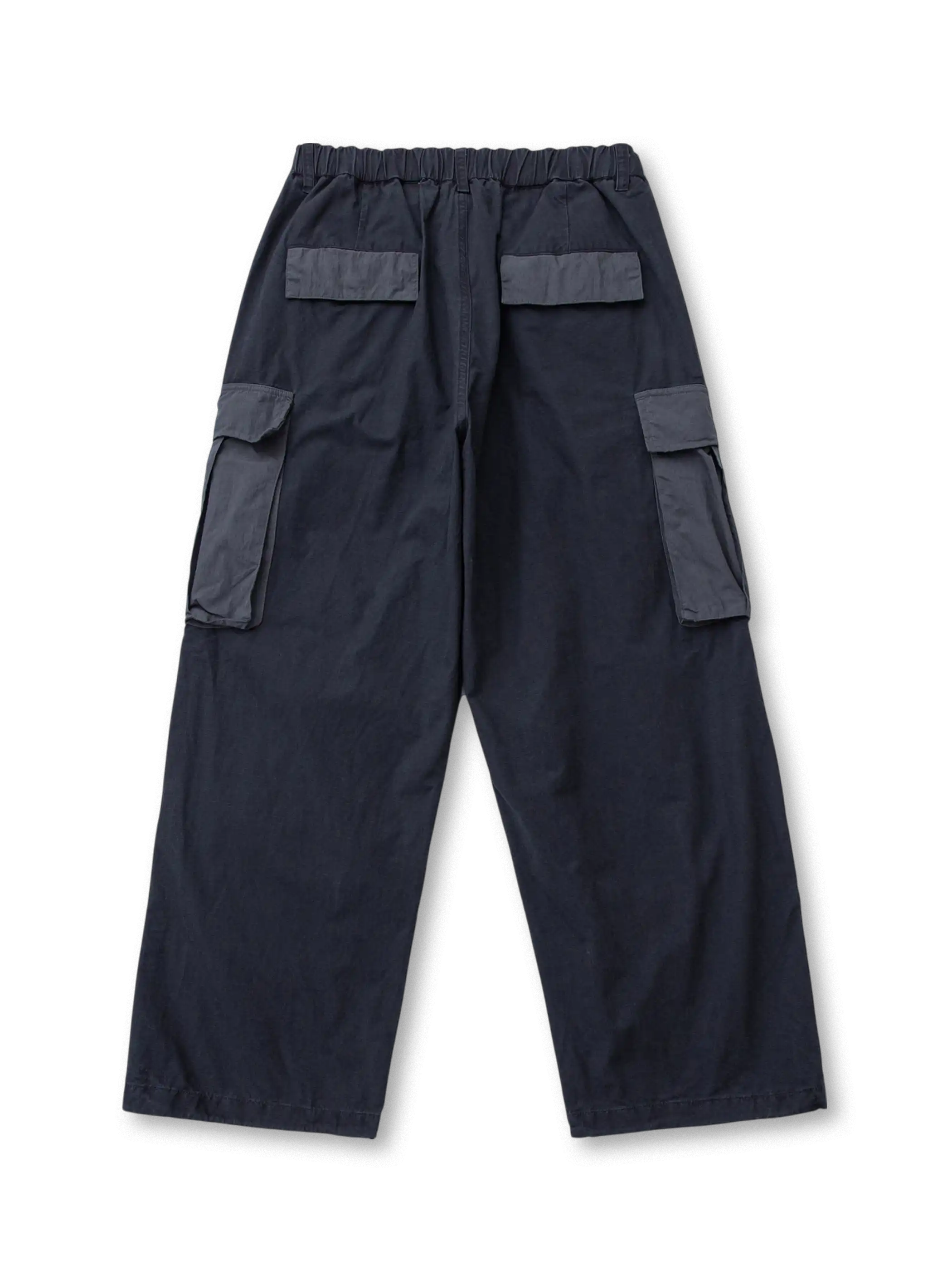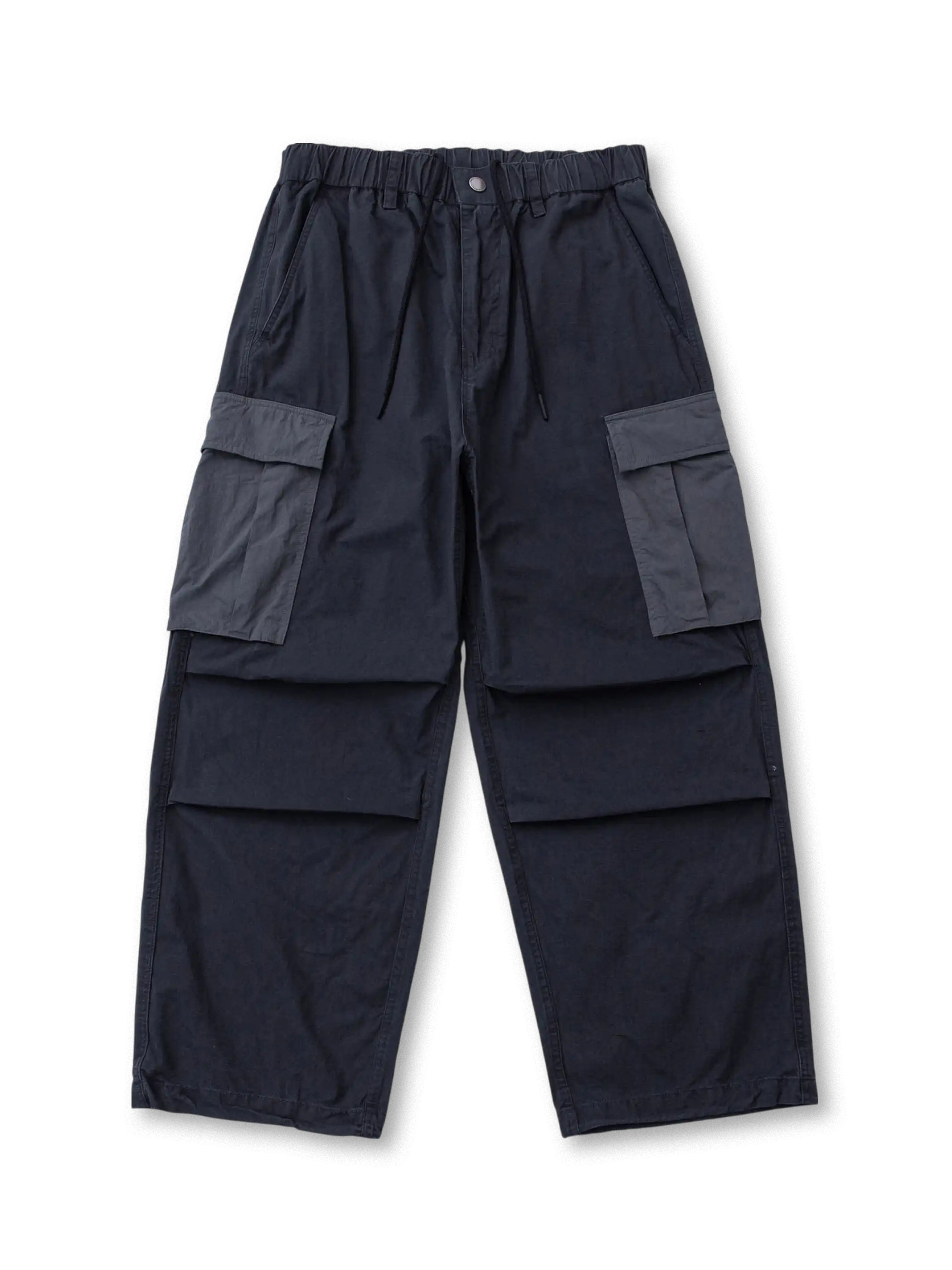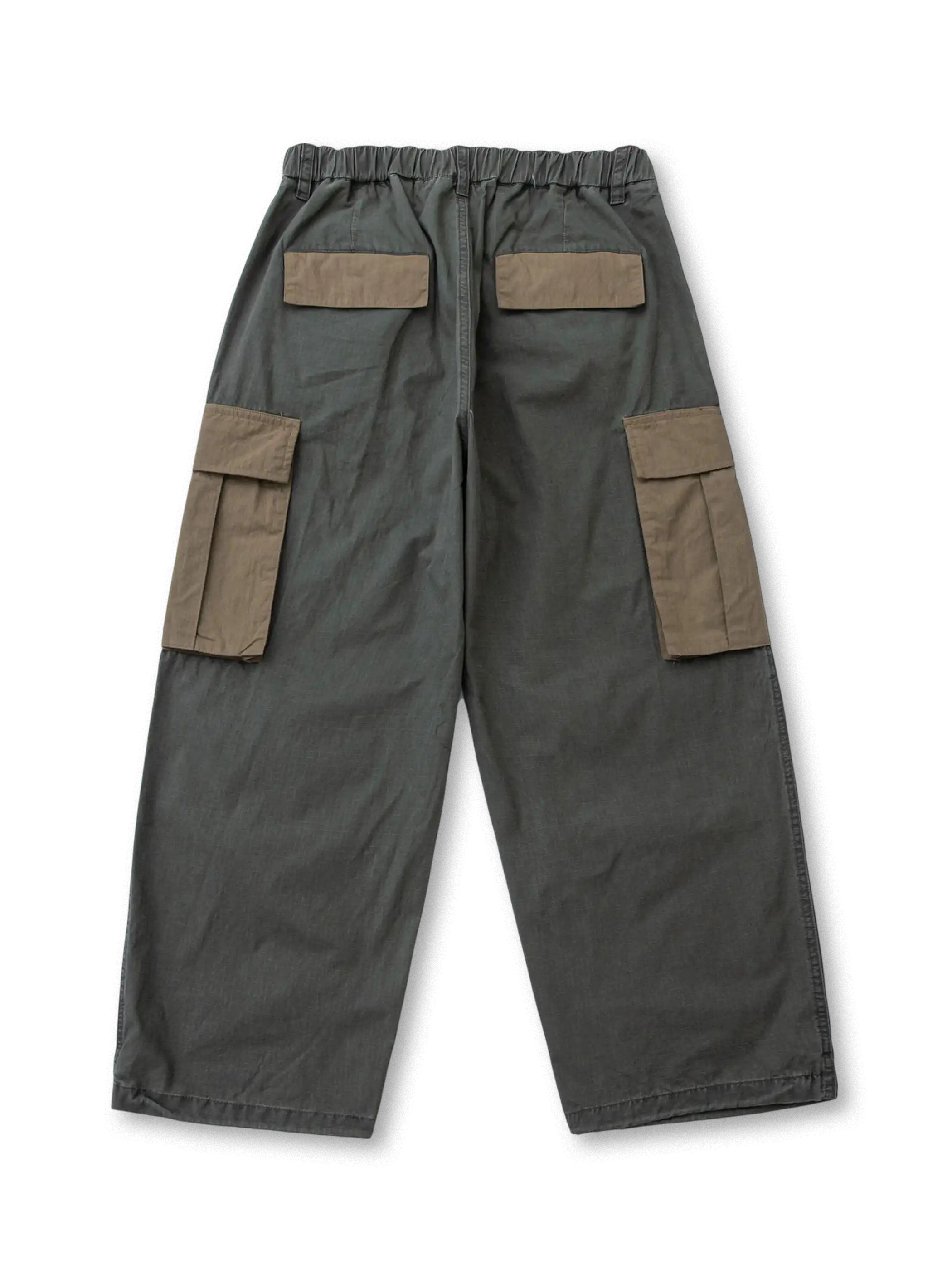 ワークウェアの伝統を継承するOG仕様の直筒シルエットに、左右非対称のカーキ&オリーブバイカラー大口ポケットを配置。ウエストはゴム&ドローコードでフィット感を自在に調整でき、両脚のダブルプリーツが動きやすさをサポート。裾にはドローコードとスナップボタンを備え、ブーツインからフレアまでスタイルを変化させるアジャスタブル仕様です。デニムジャケットやレザーシューズと合わせれば、ミリタリーテイストを今風に昇華したストリートユースに最適な一着。