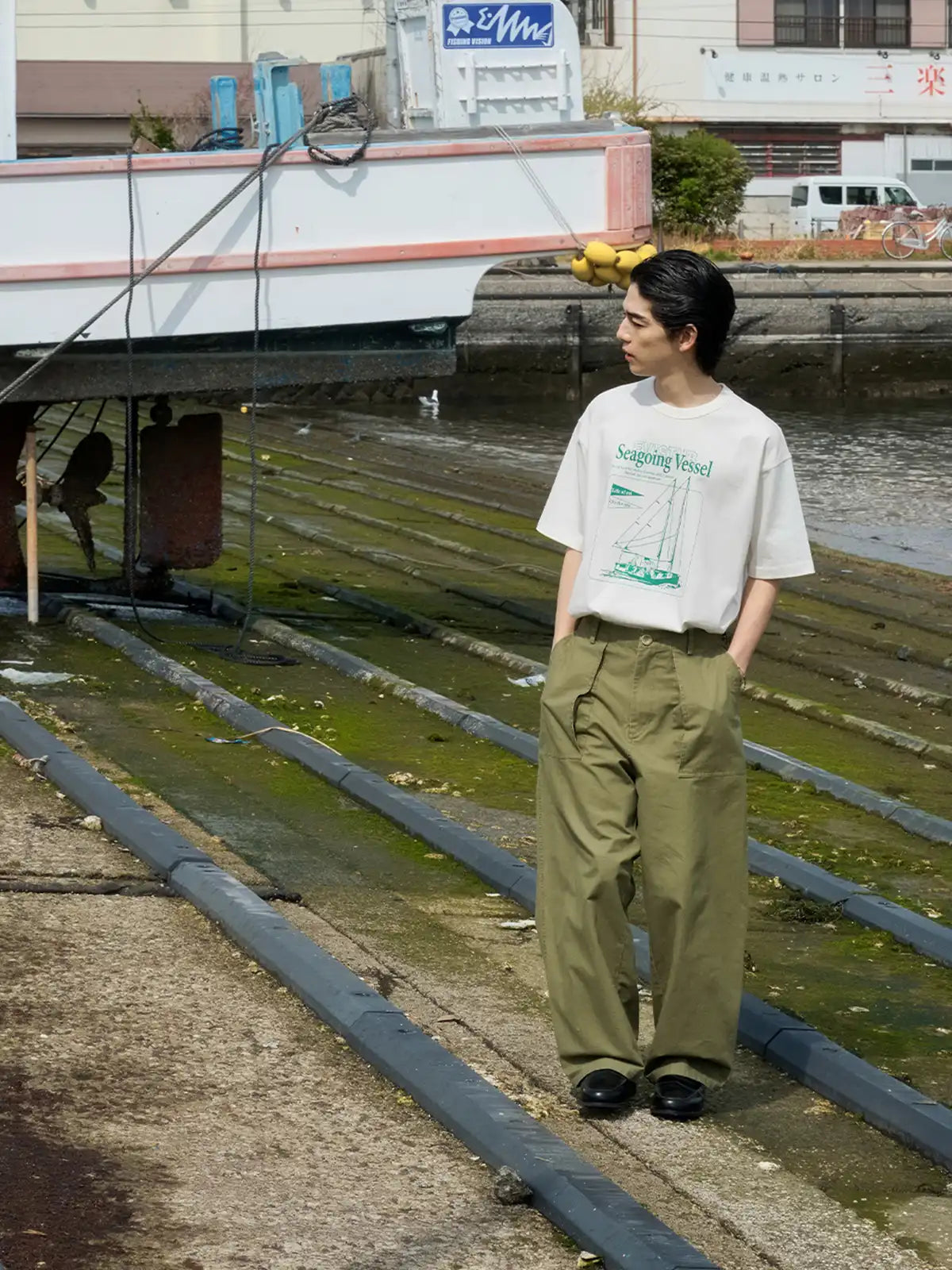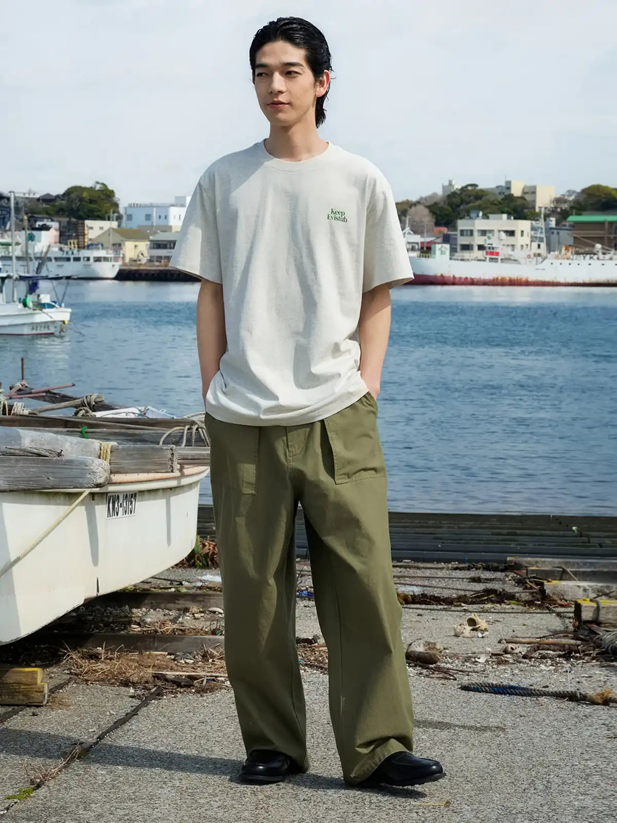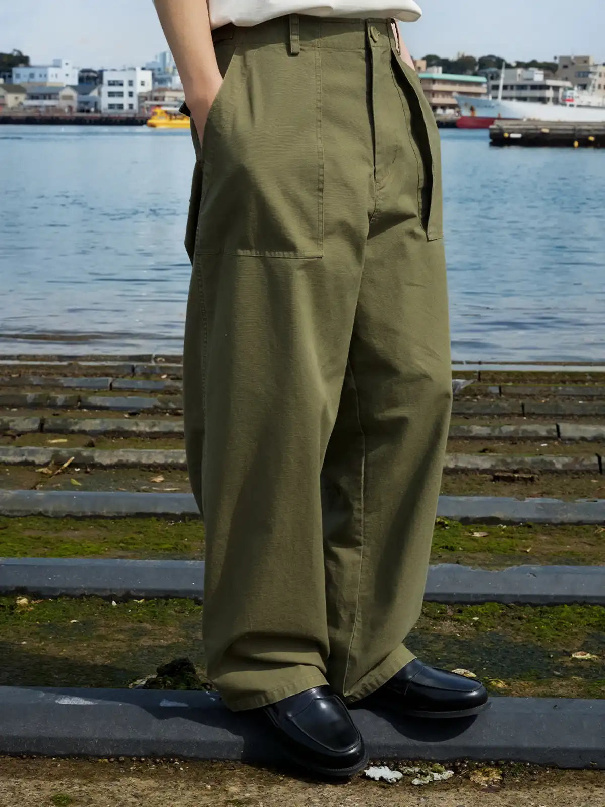 ピマコットン100%の竹節織り生地を用い、クラシックなOG-107シルエットを現代的にアップデートしたワイドストレートのワークパンツ。