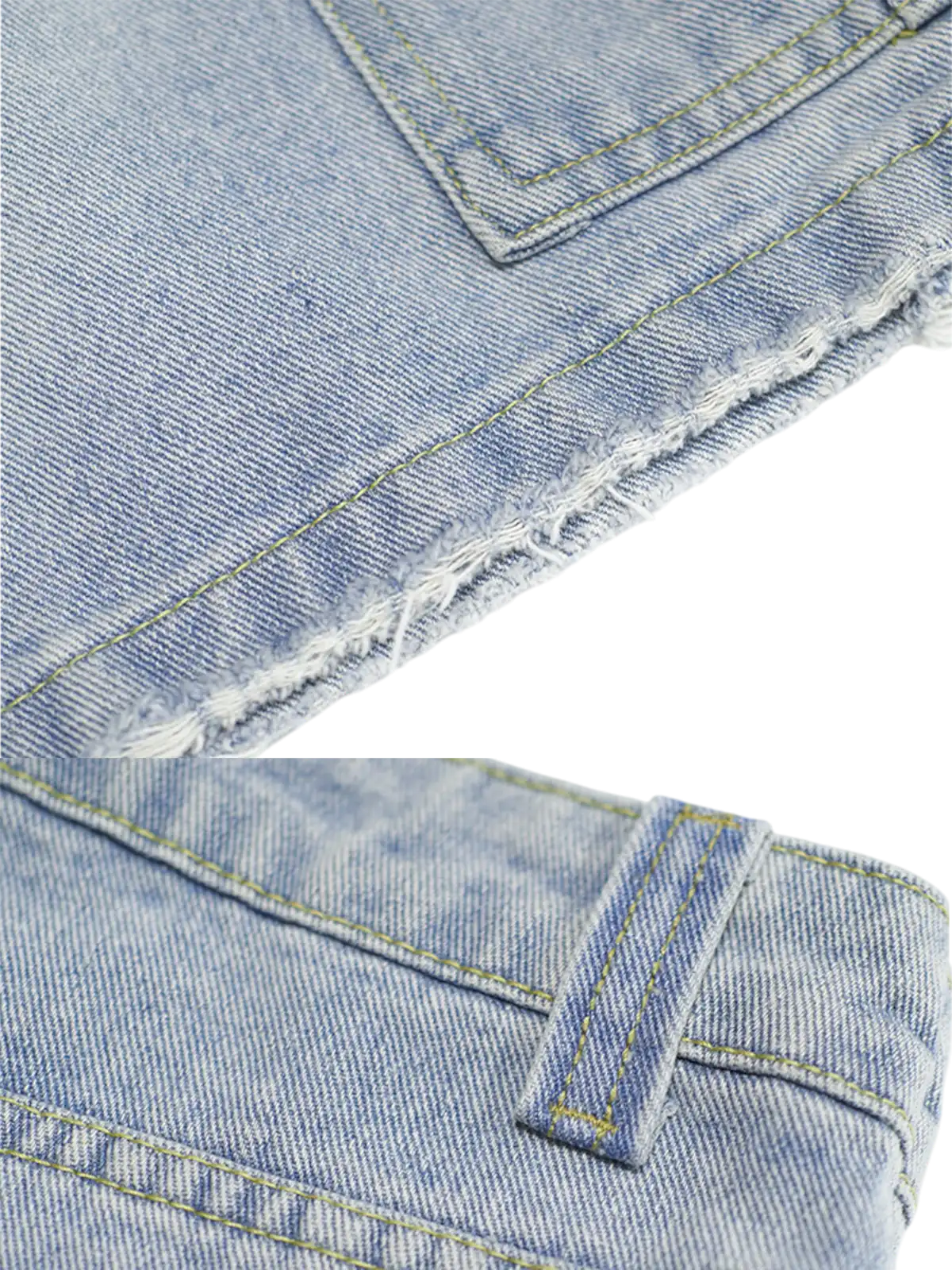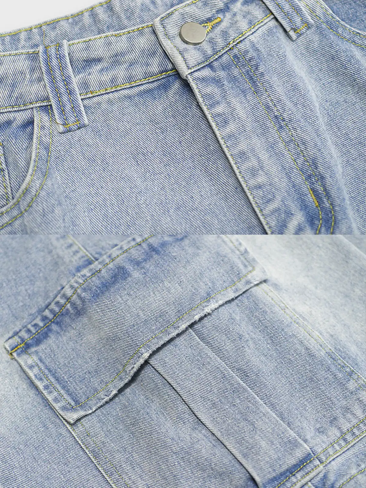 上質な100%コットンデニムを使用し、ビンテージ感あるウォッシュ加工とほんのり白くフェードしたヒゲ跡がカジュアルな雰囲気を演出。ベルトループ付きウエストとフロントボタン/ジップフライで安心のフィット感を確保し、両サイドの大型カーゴポケットが実用性を高めます。裾のナチュラルなダメージディテールがアクセントとなり、ワイドシルエットが脚の比率を美しく見せます。