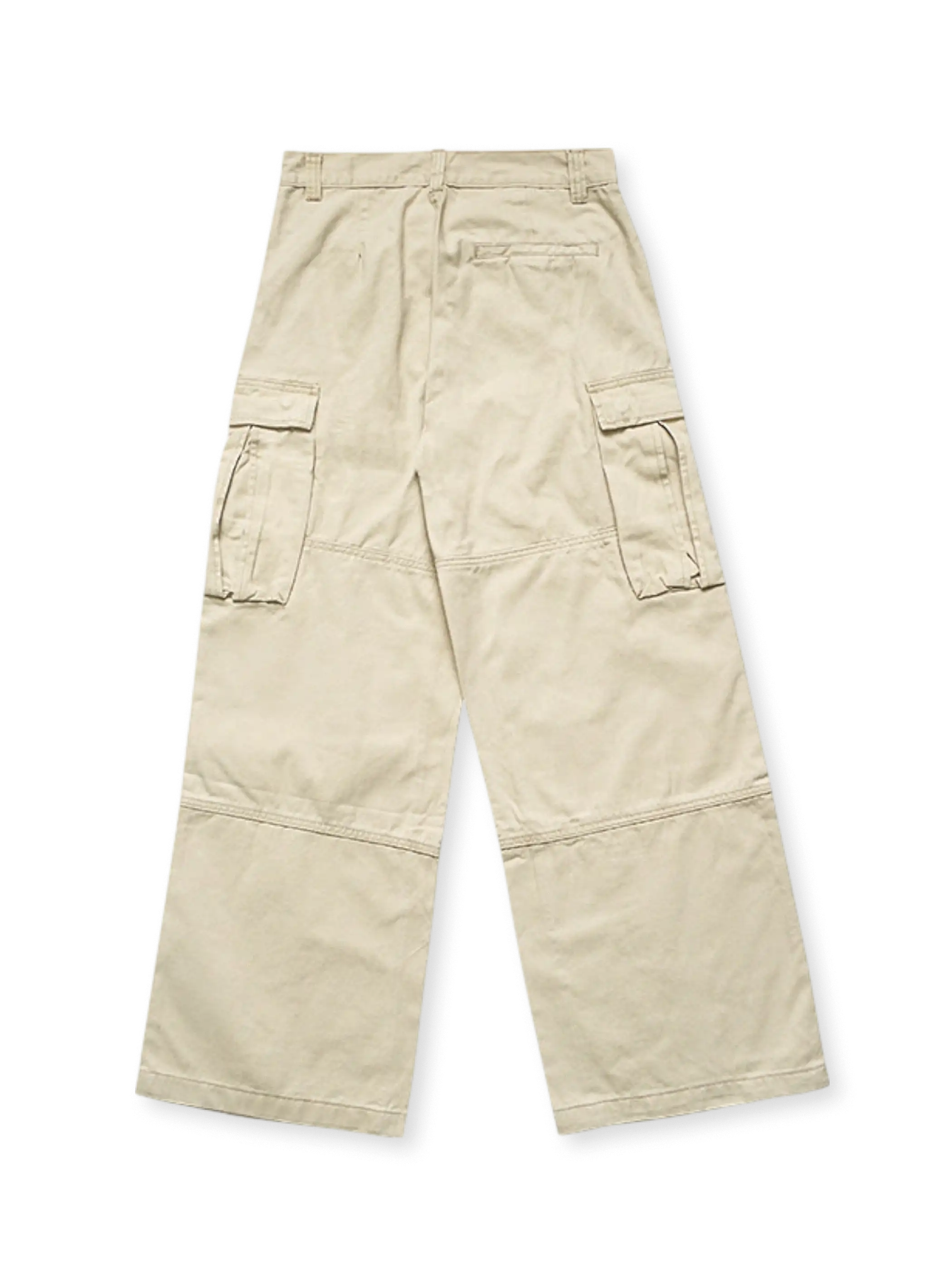 高番手コットンツイルと大容量ポケットを備えた、直筒シルエットのミリタリー風ワイドパンツ。