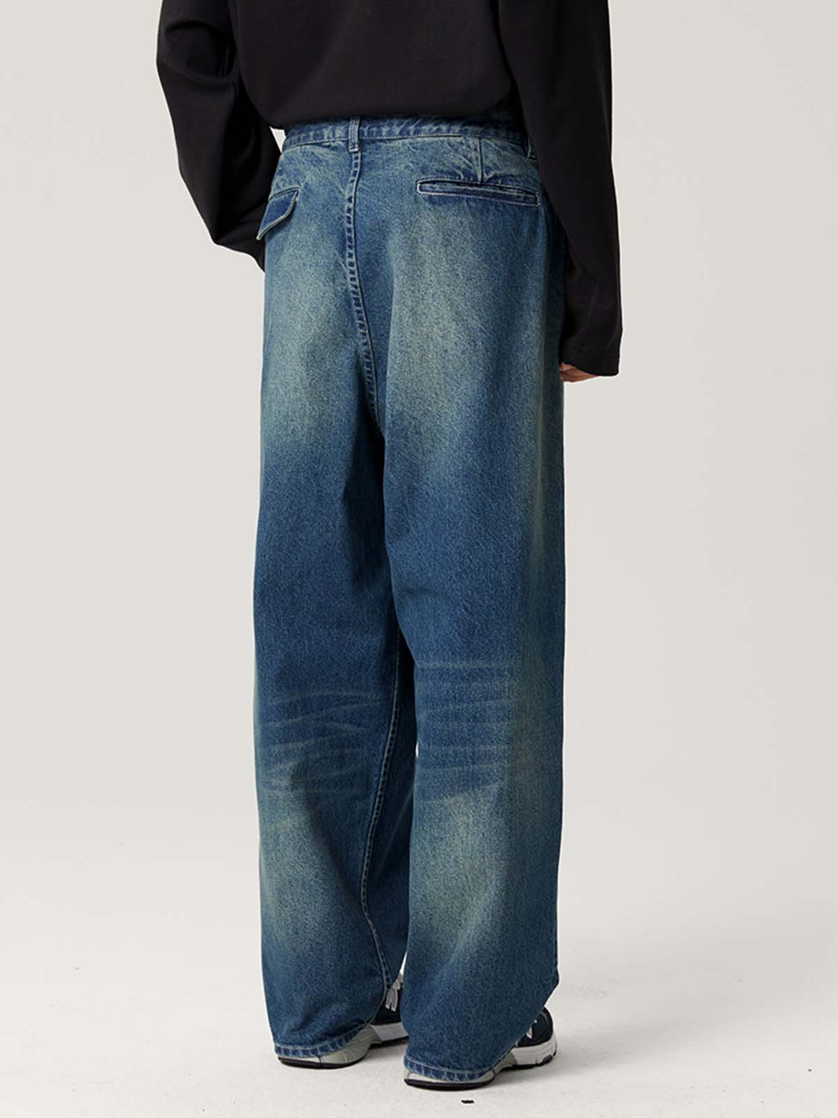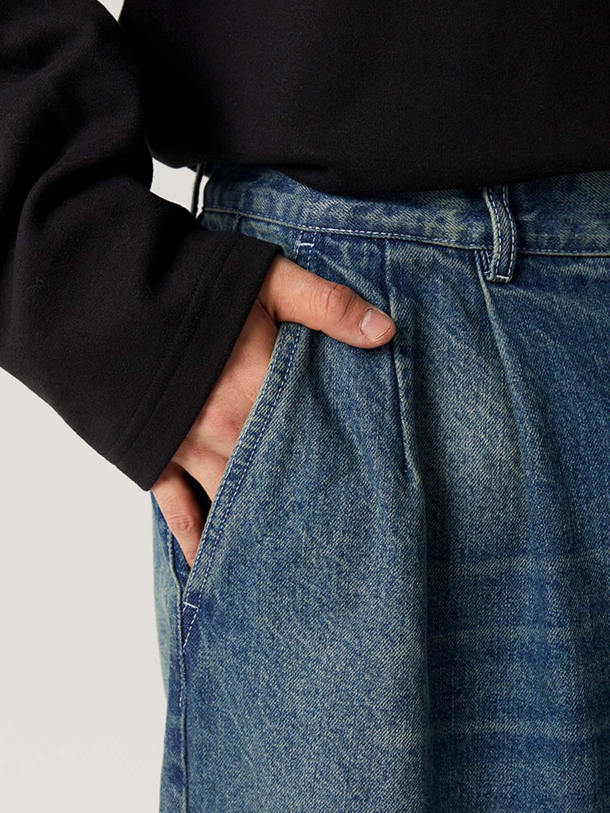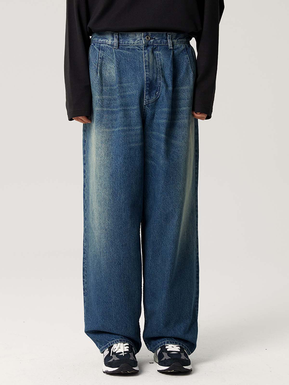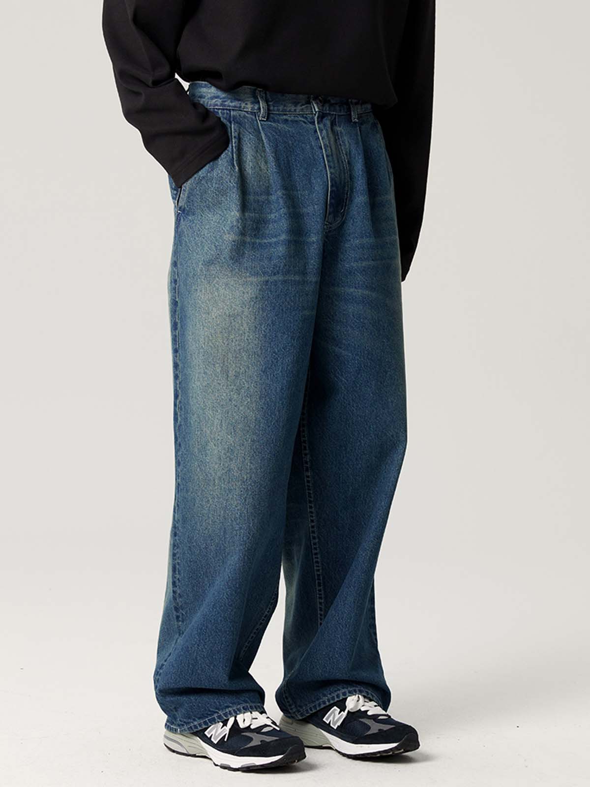 ゆったりとしたダブルプリーツデザイン、ヴィンテージウォッシュ加工が施されたデニムパンツ。快適さとレトロなスタイルを兼ね備え、カジュアルコーディネートにぴったり。