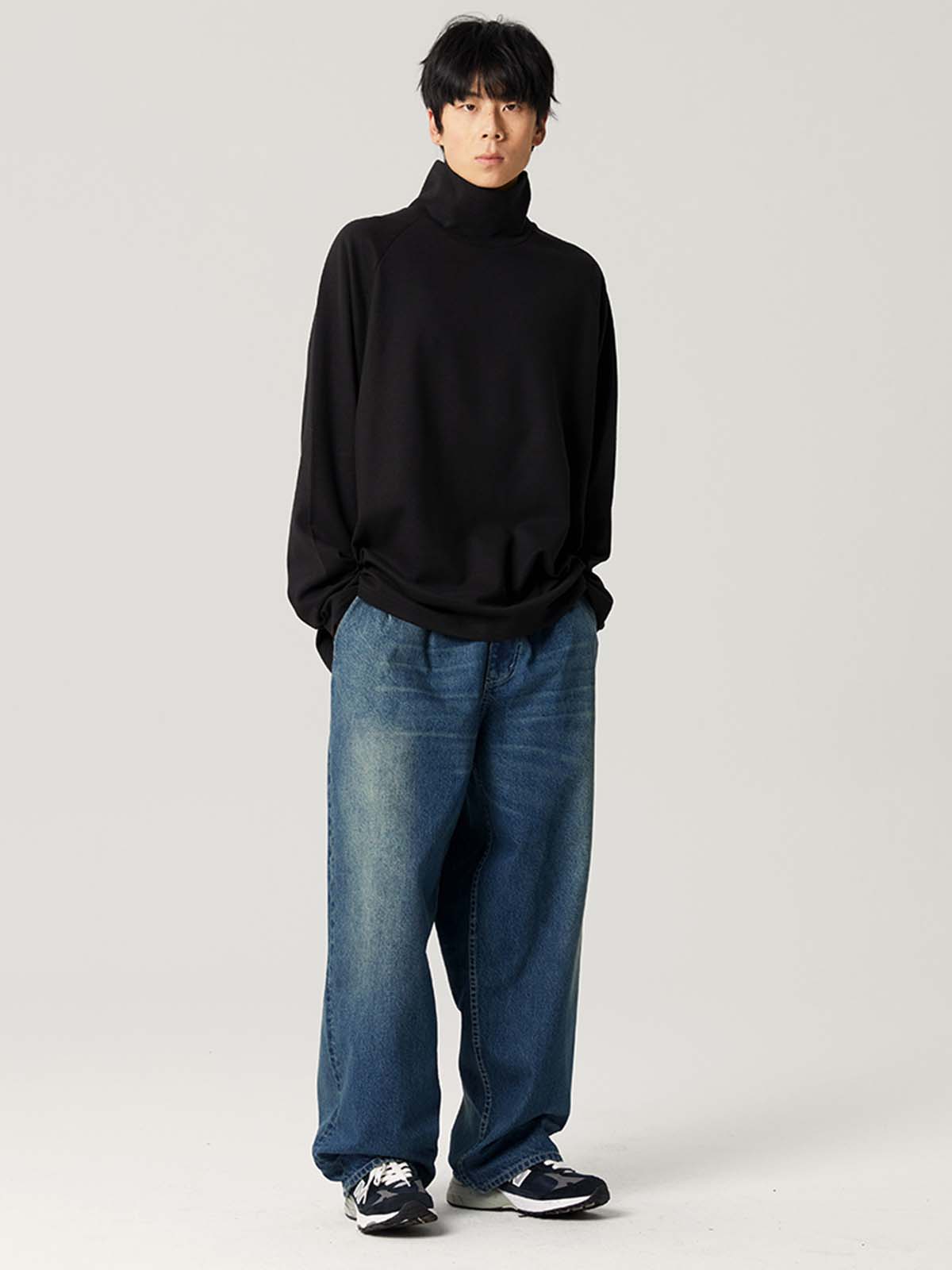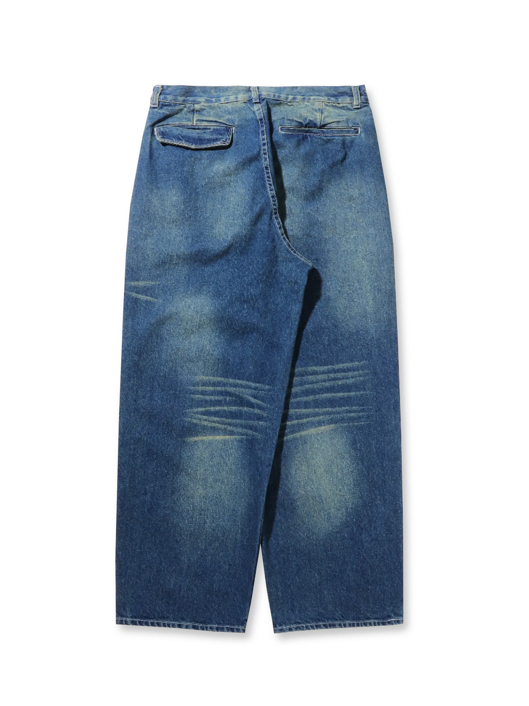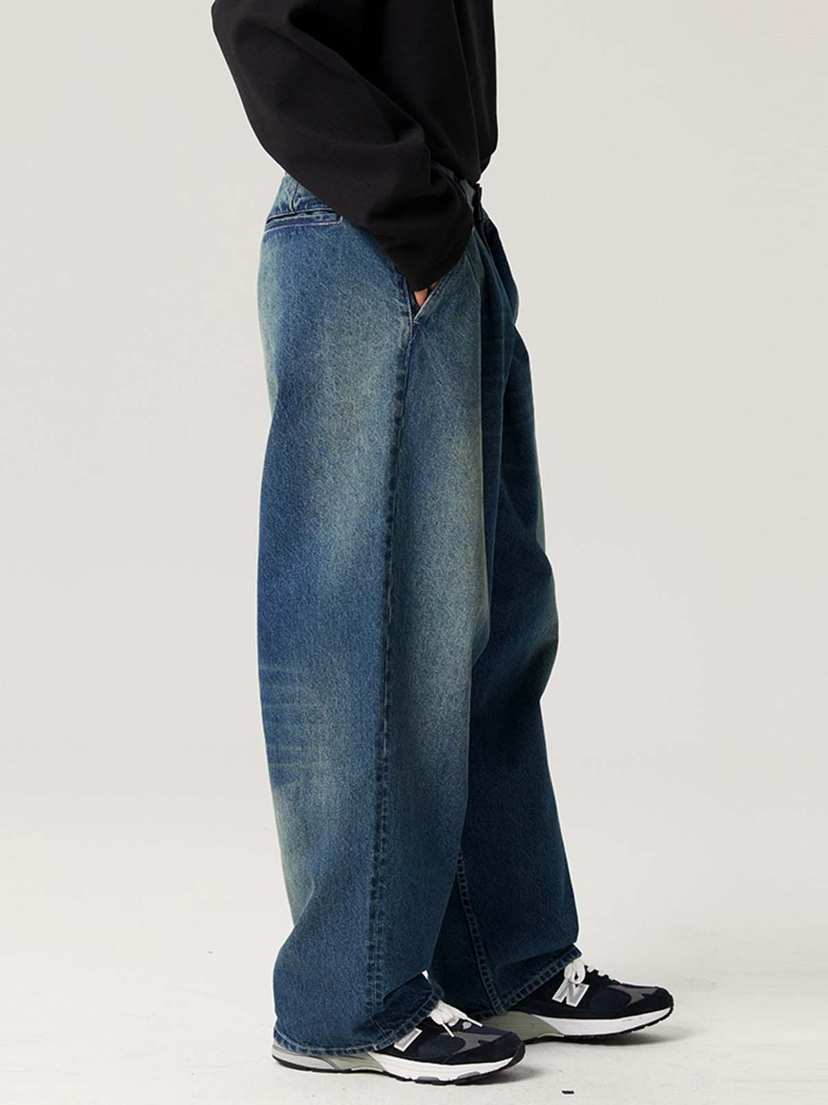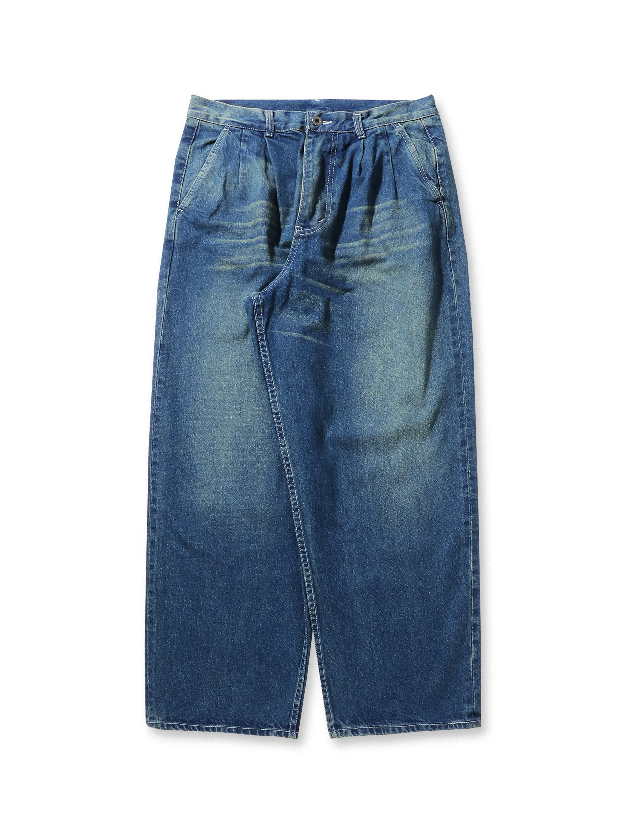 ゆったりとしたダブルプリーツデザイン、ヴィンテージウォッシュ加工が施されたデニムパンツ。快適さとレトロなスタイルを兼ね備え、カジュアルコーディネートにぴったり。