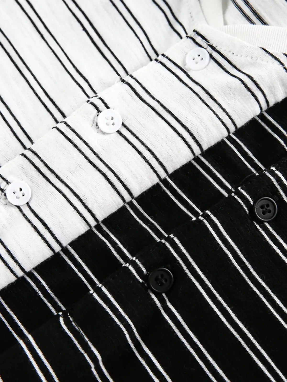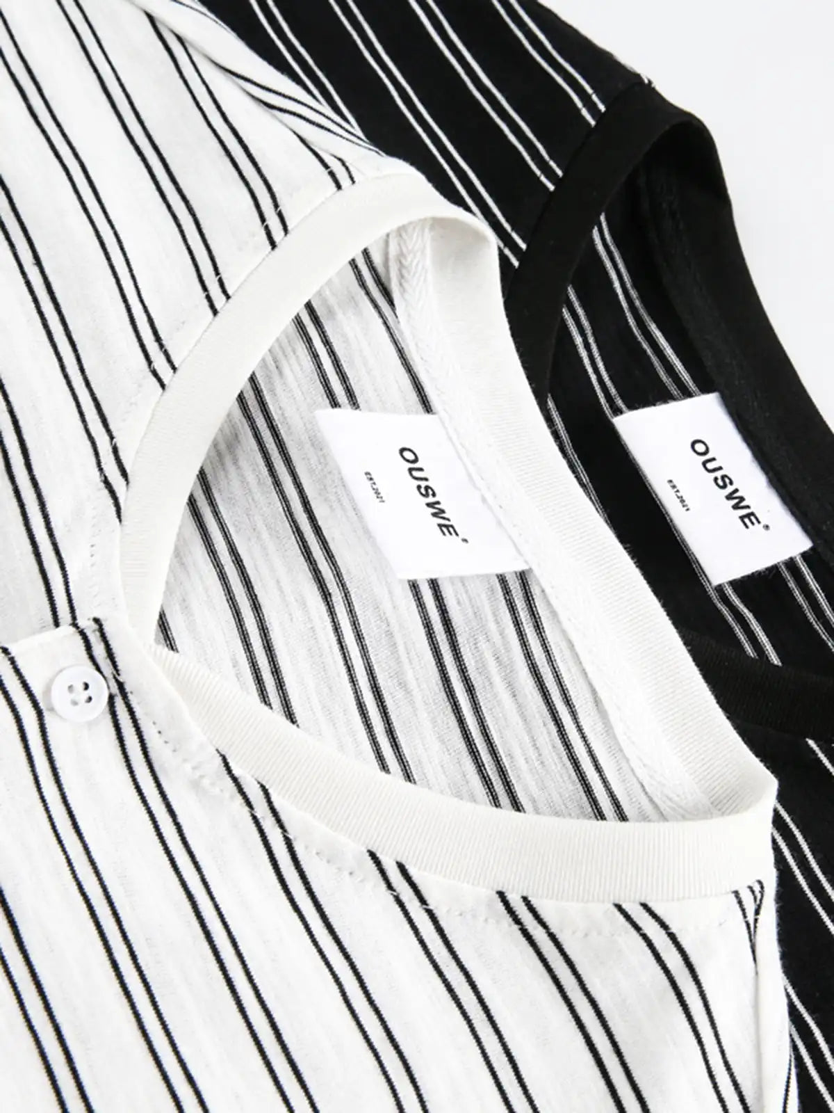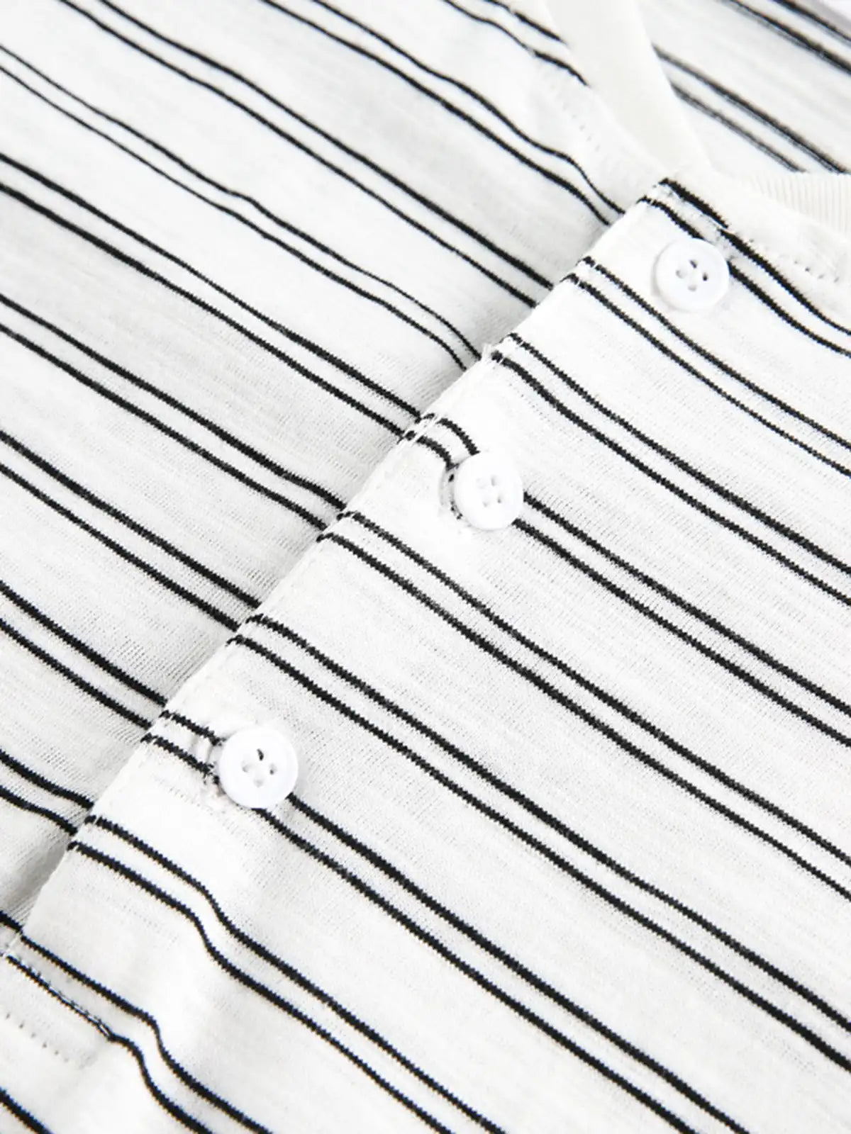 ボタン留めのヘンリーネックがほどよいアクセントとなり、ストライプ柄がヴィンテージ感を際立たせます。全体的にゆったりとしたボクシーシルエットで、ユニセックスに着用可能。100%コットン素材を使用し、通気性と快適な着心地を実現。ホワイトとブラックを基調とした配色は様々なコーディネートに合わせやすく、カジュアルな休日やリラックスシーンからデイリーまで幅広く活躍します。