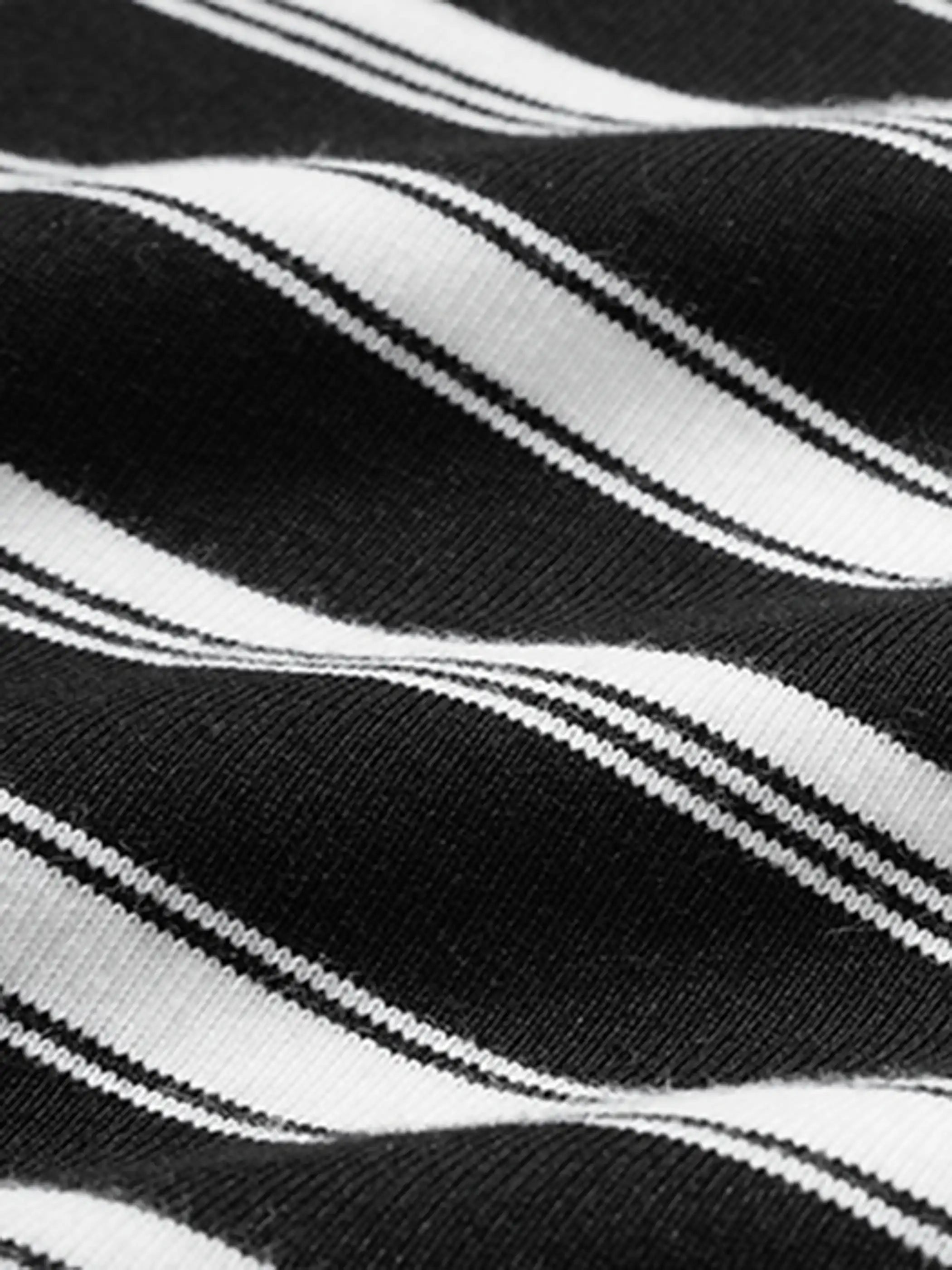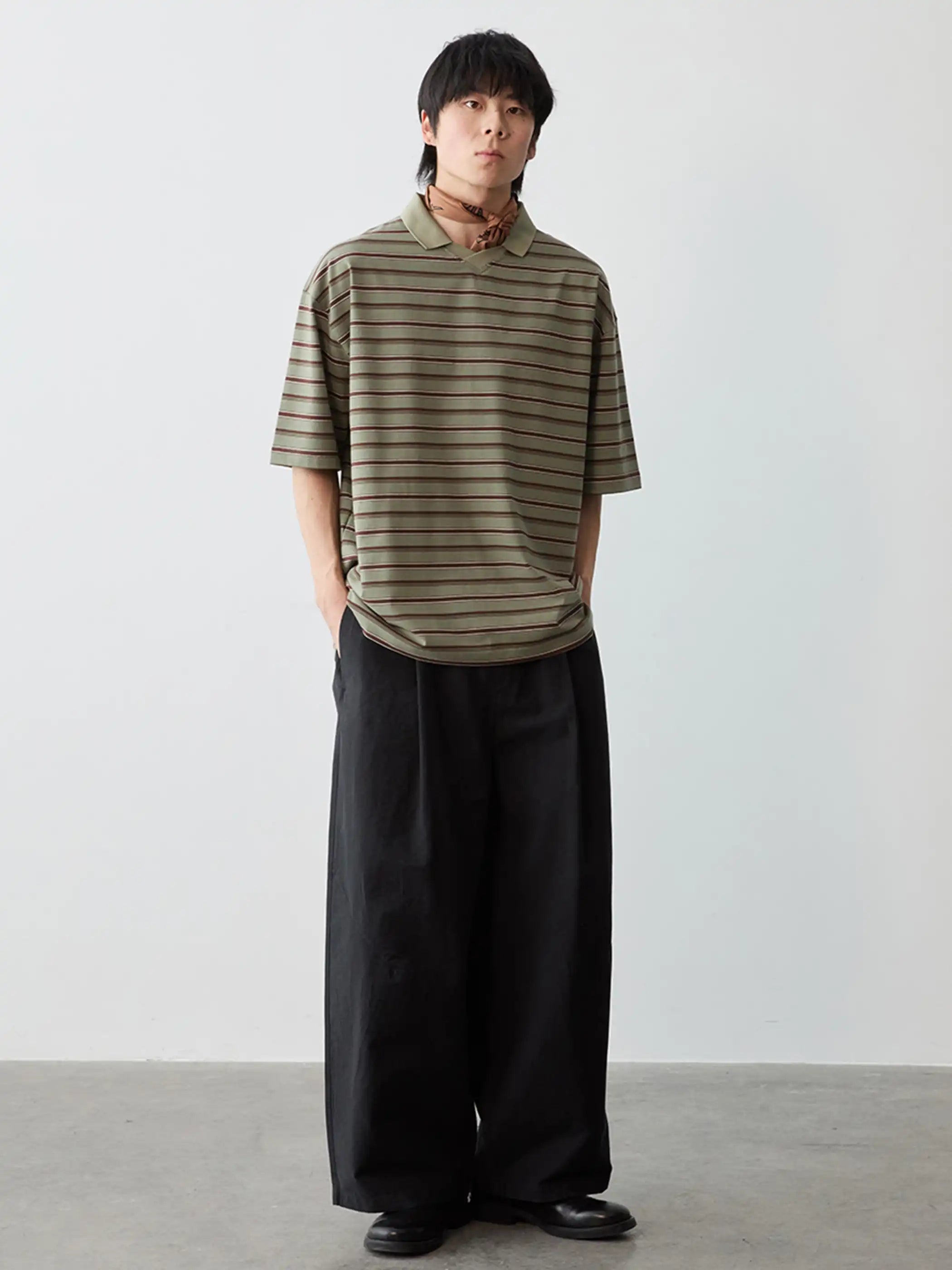 クラシックなストライプ柄をベースにしたデザインで、襟元はV字形のフラットカラーを採用し、すっきりとした印象を演出。コットン50%とポリエステル50%の混紡生地は通気性・吸汗速乾性に優れ、真夏でもさらりとした肌触りが持続します。サイドのスリットが動きやすさとデザイン性を高め、ブランドのオリジナルネームタグがアクセントに。ワイドパンツやショーツなどと合わせれば、ラフな中にも洗練された夏のコーデを楽しめます。