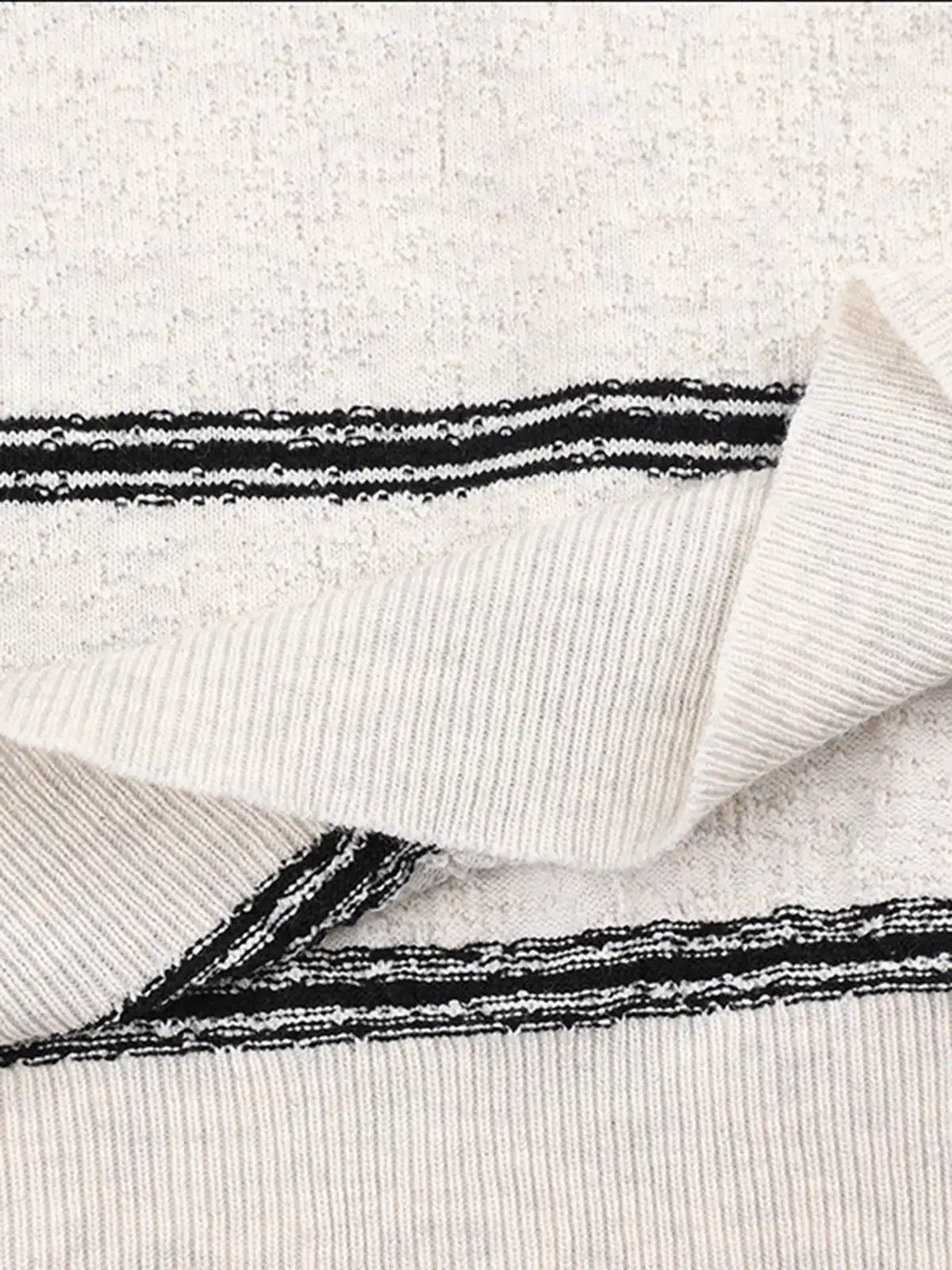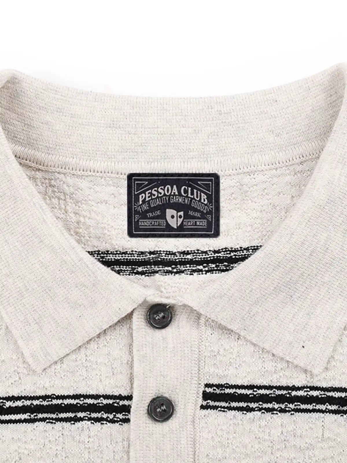 レーヨン×ポリエステル混紡の「アイスシルク」ファブリックを採用し、ドライタッチで驚異的な通気性を実現。独特のシワ加工が表情豊かなストライプを生み出し、3ボタンのクラシックポロ衿が全体を引き締めます。白パンツやスラックスと合わせることで、洗練された清涼感あふれるスタイルが完成します。