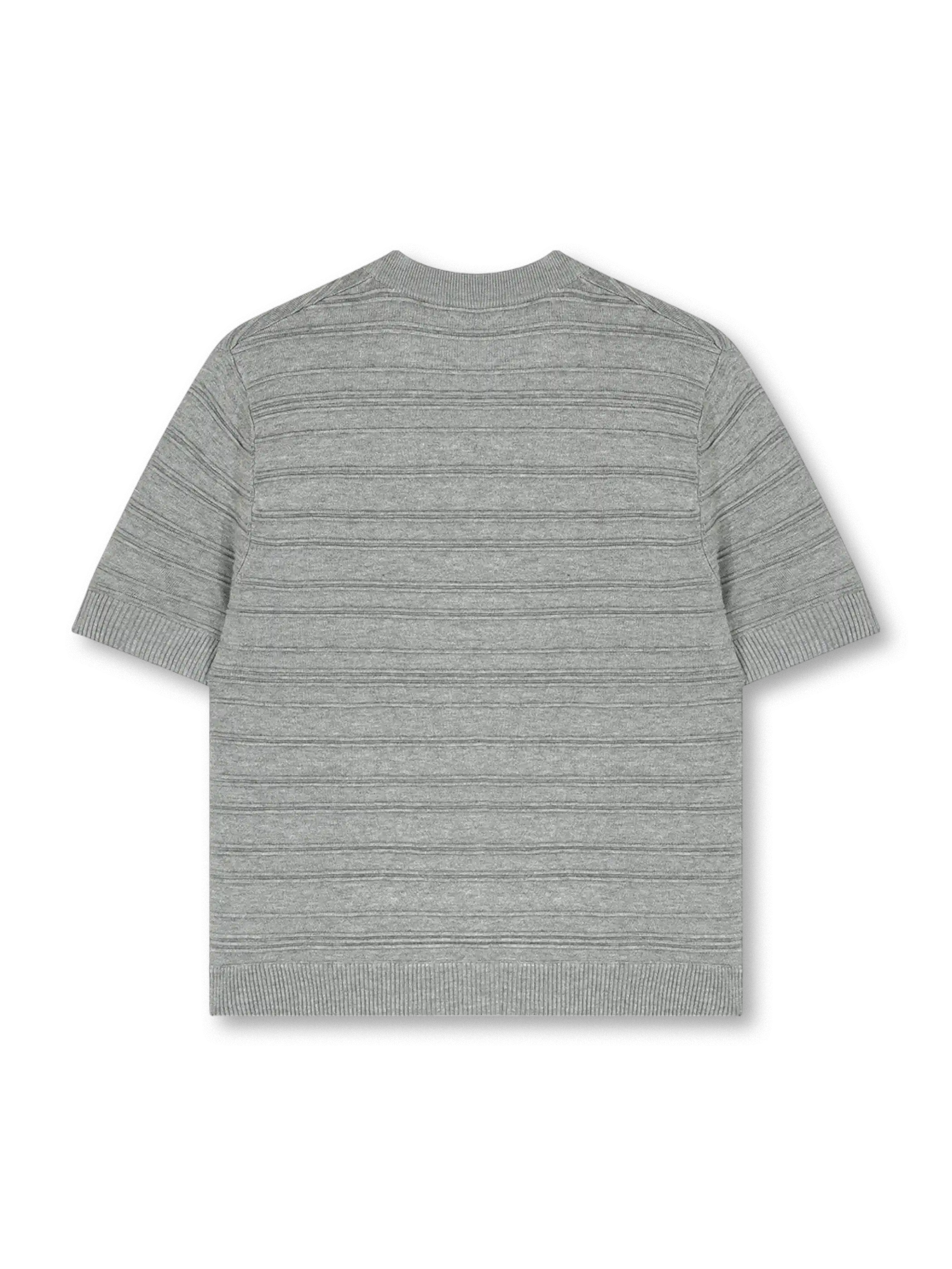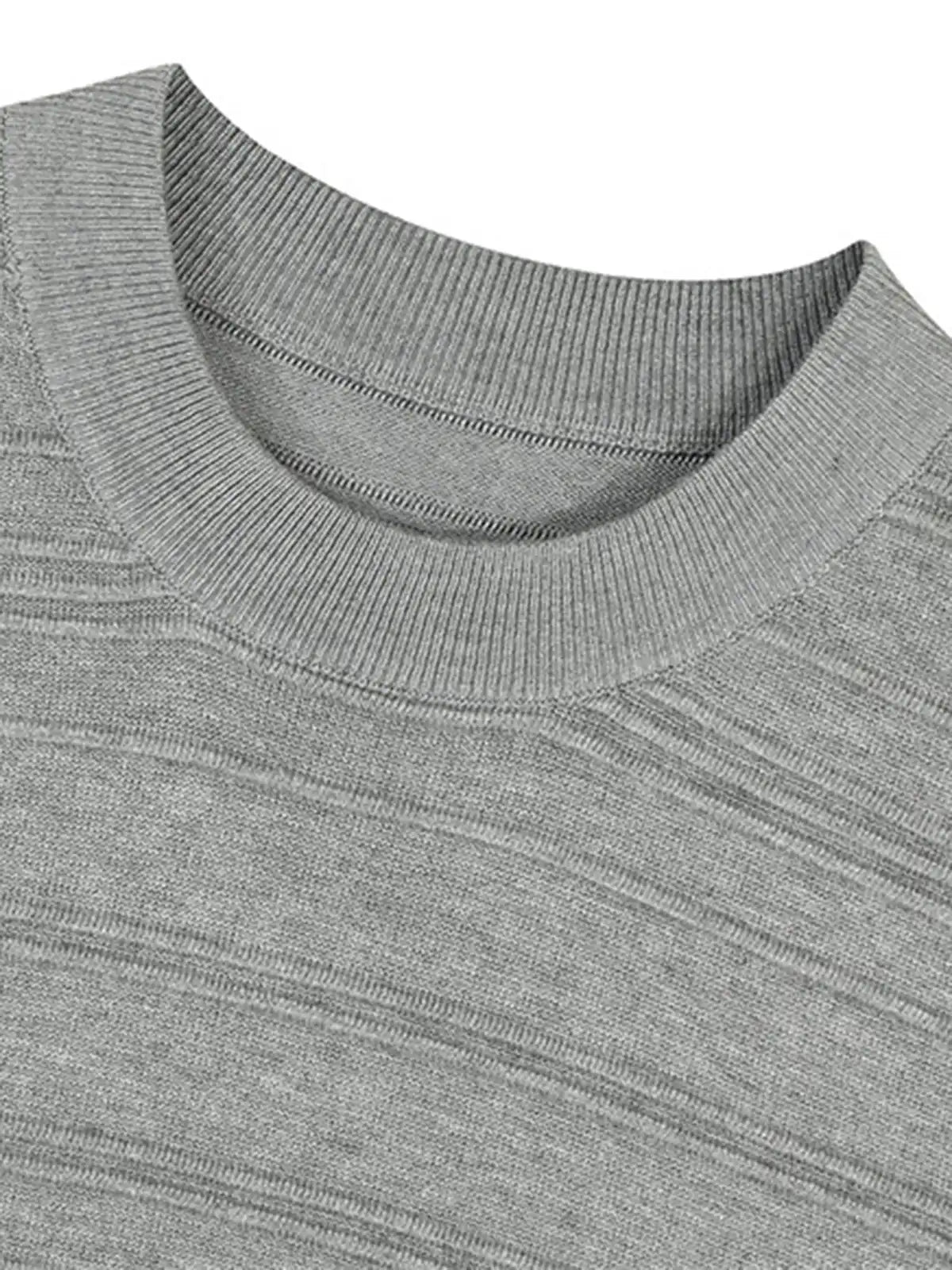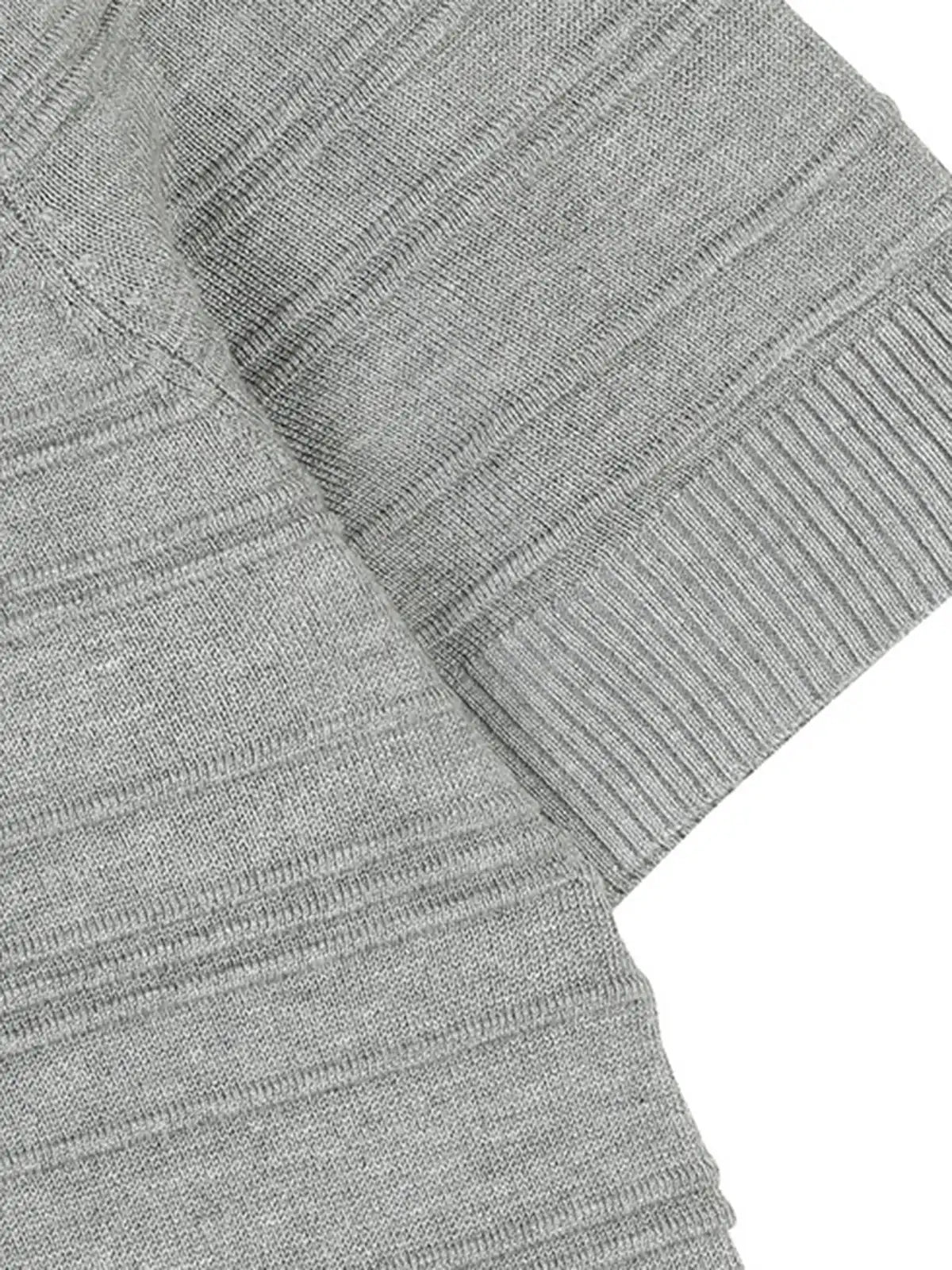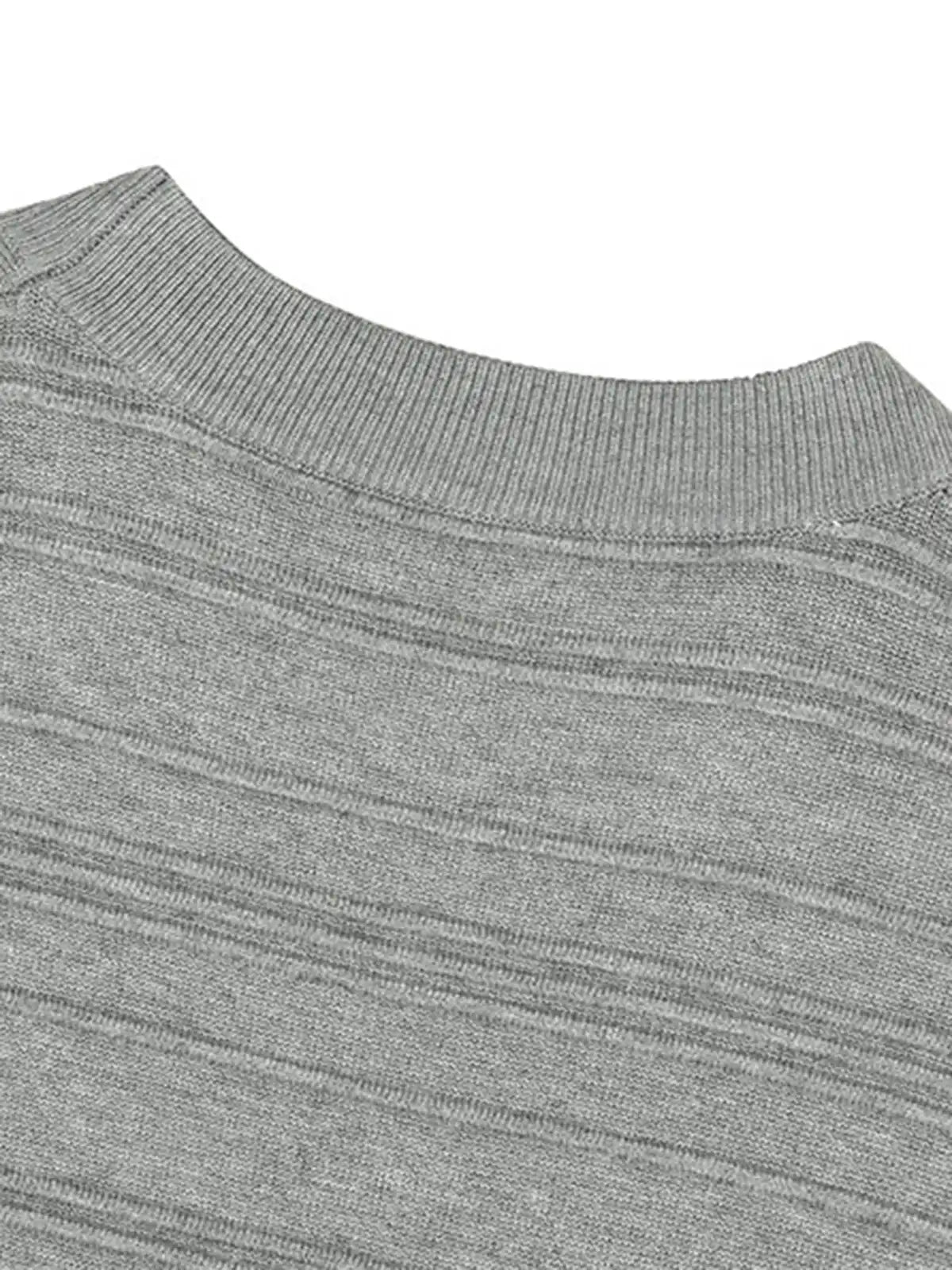 軽やかな薄手ニットにさりげない横ストライプの凹凸を効かせた、男女兼用のモダンベーシック。