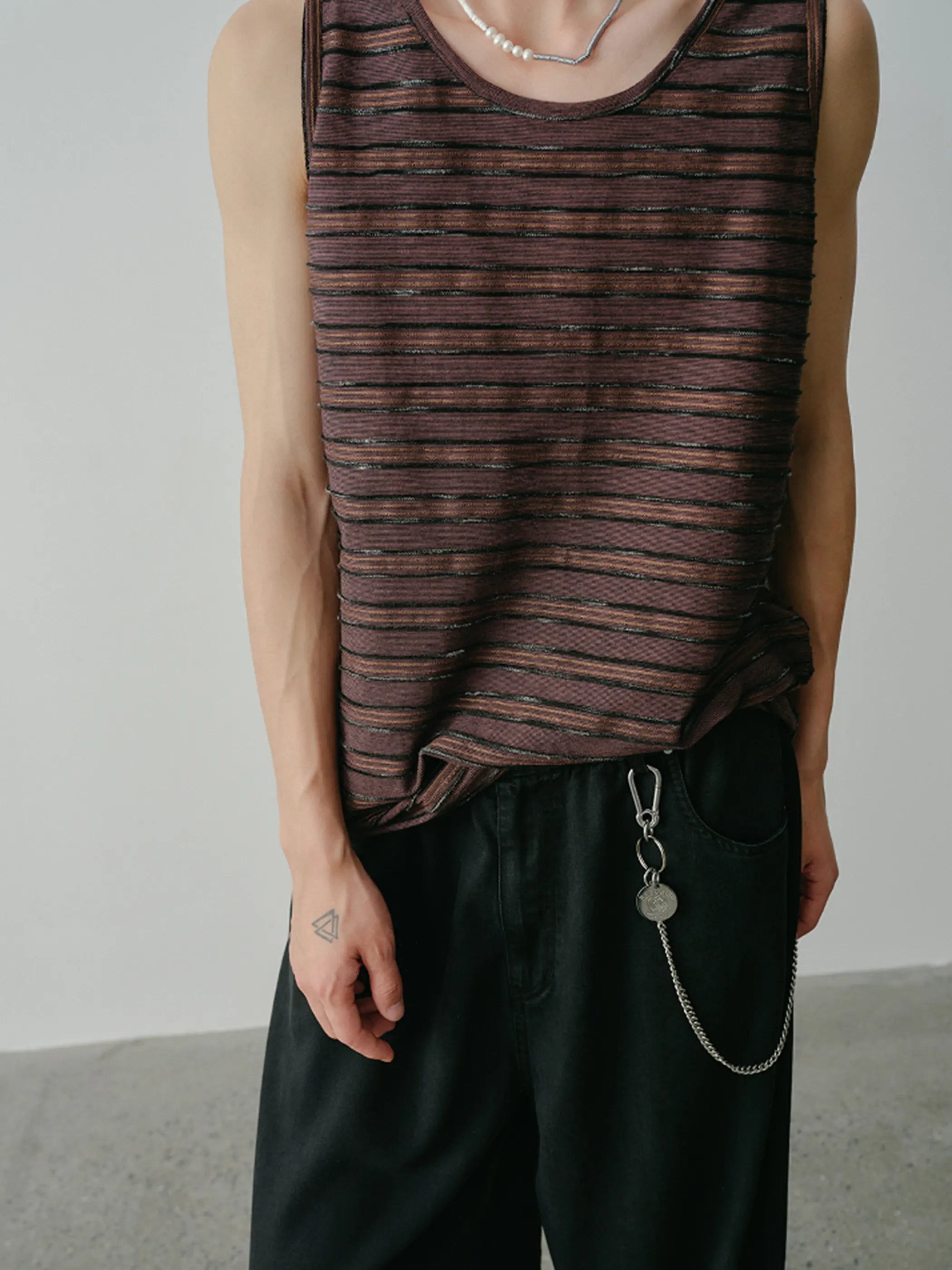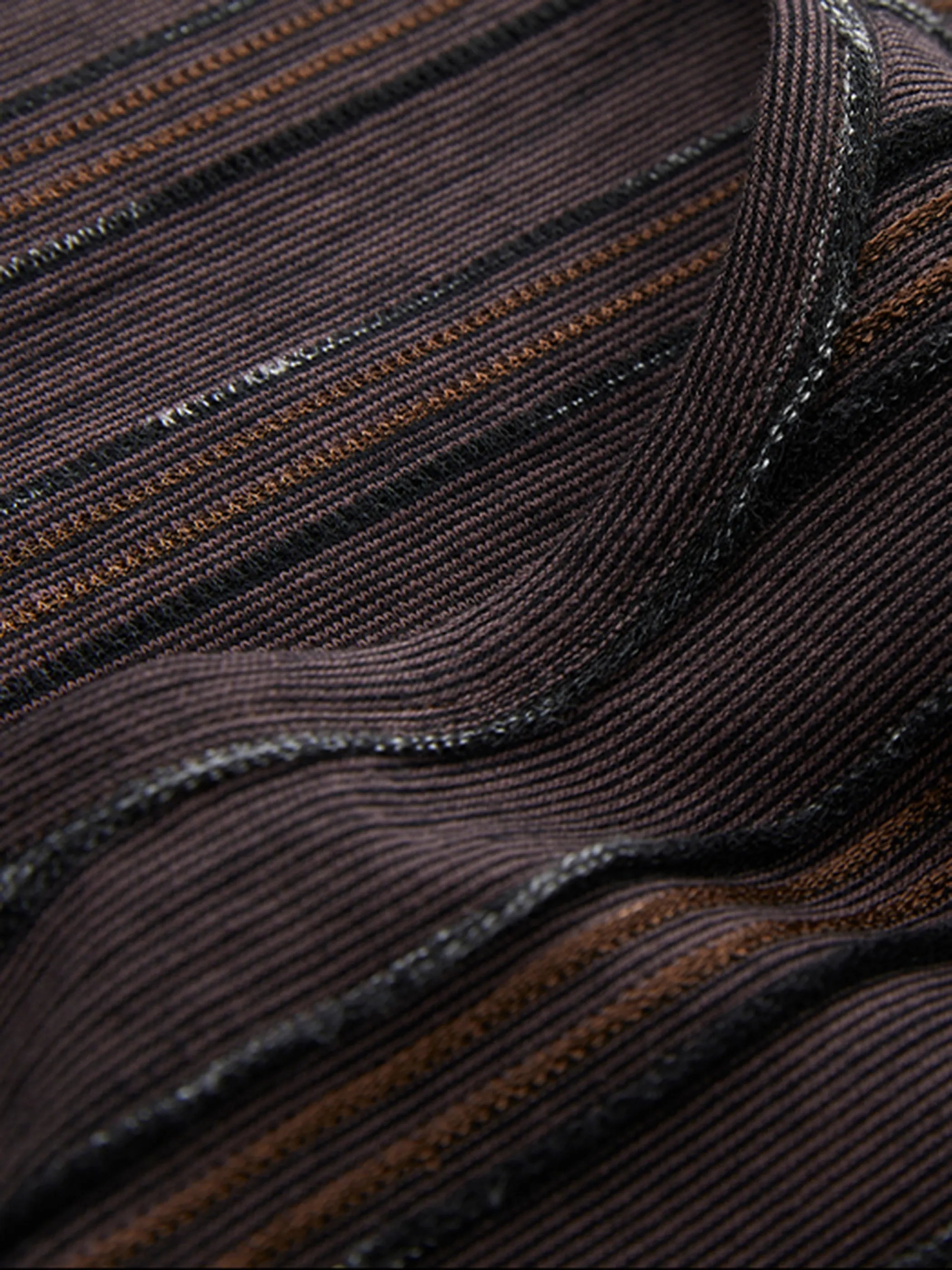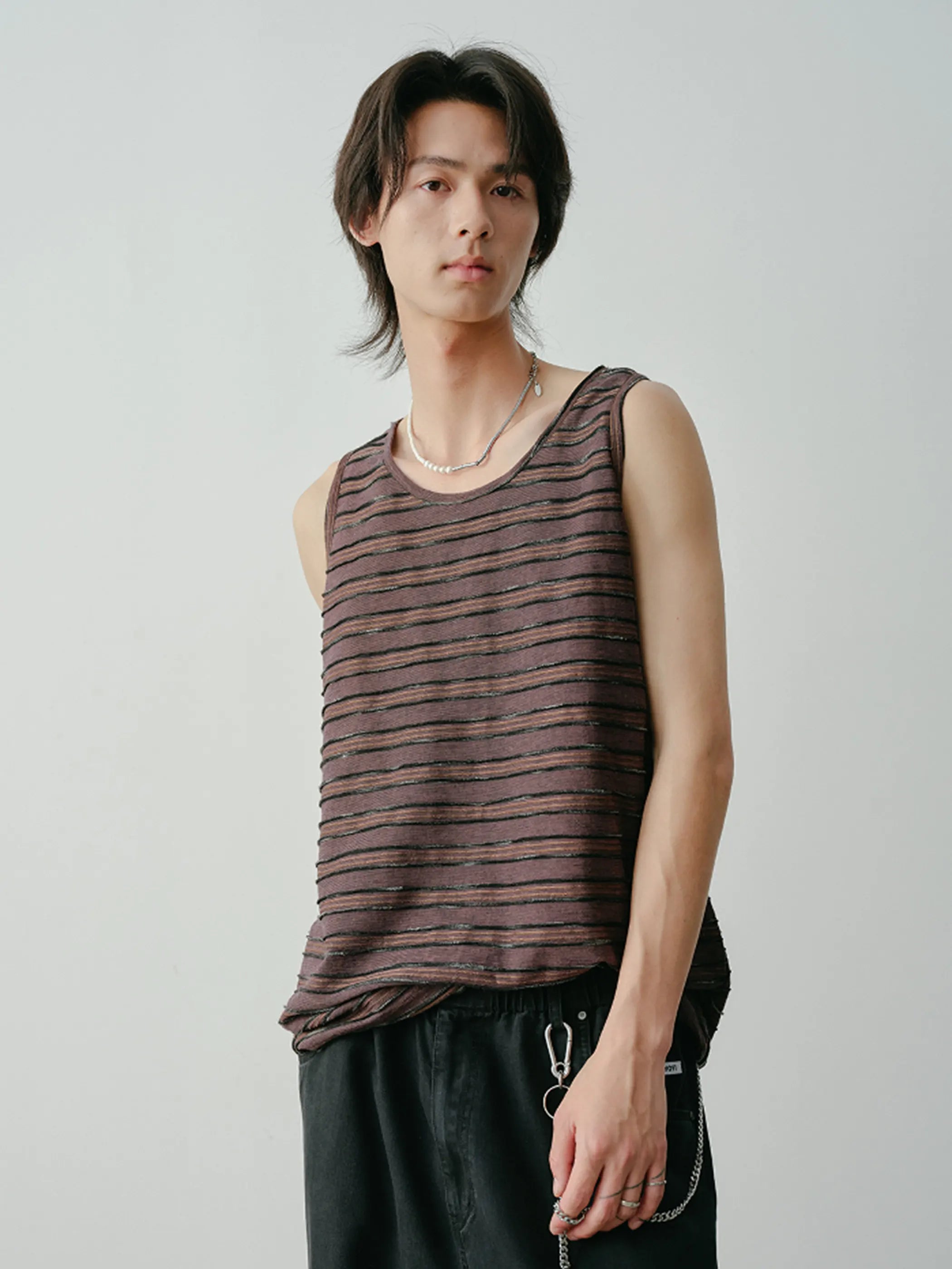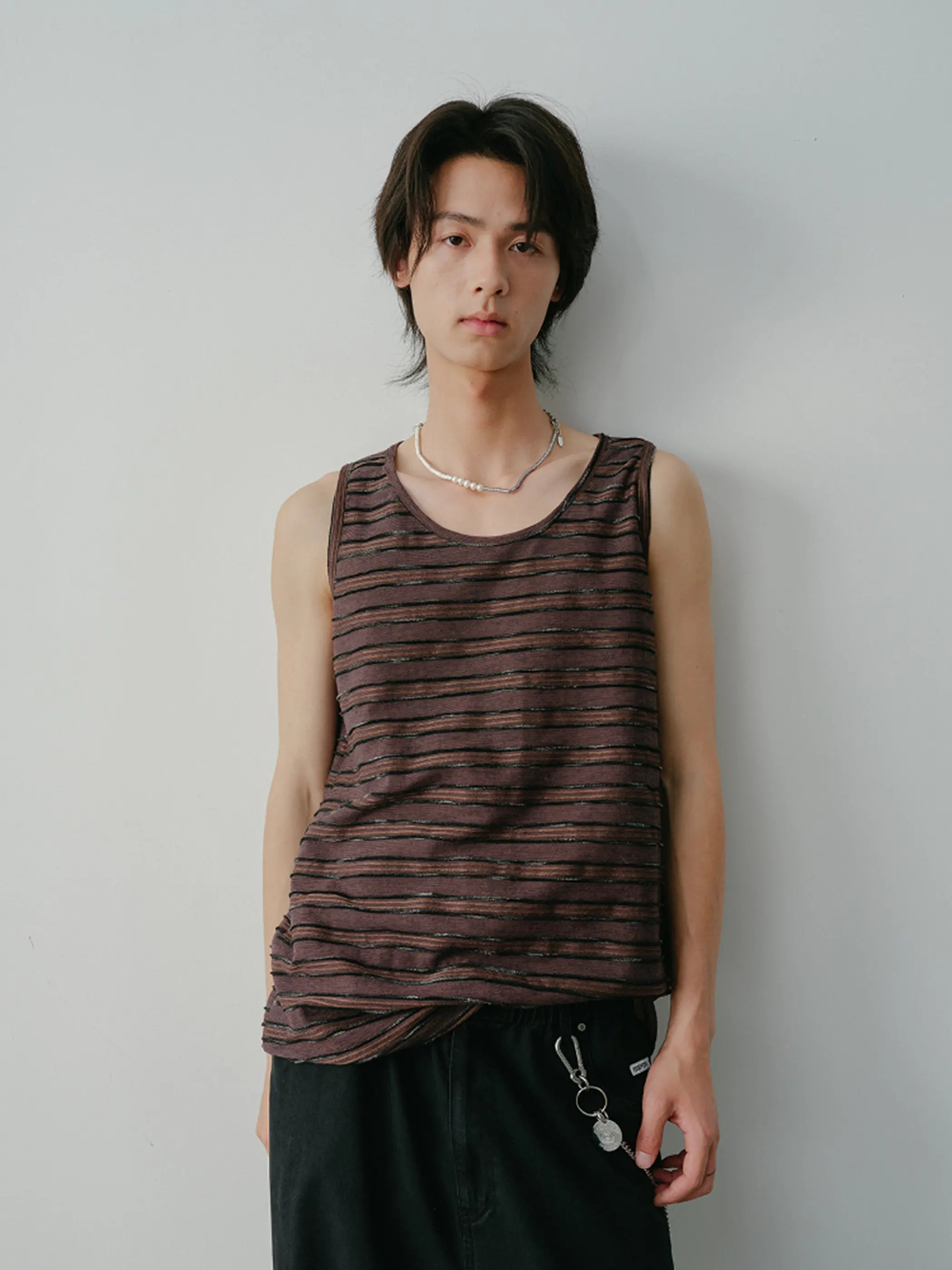 肌触りの良い65.6%コットンにTR混紡の程よいハリとポリエステルの耐久性を加えた170gのジャカード素材は、通気性と形保持性を両立し、着脱しやすいクルーネック&ノースリーブで真夏のインナーにも単品にも最適。深ブラウンをベースに多色ストライプを織り込むことで、シンプルながらも奥行きのある表情を生み出し、ショーツからスラックスまであらゆるボトムと調和する大人のカジュアルスタイルを実現する。