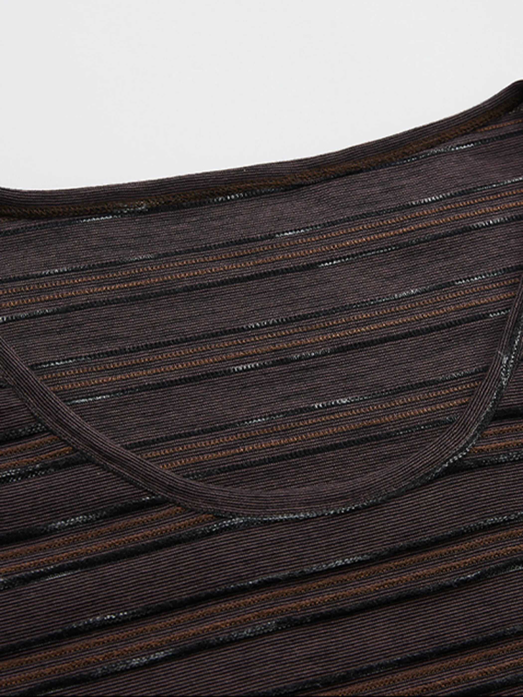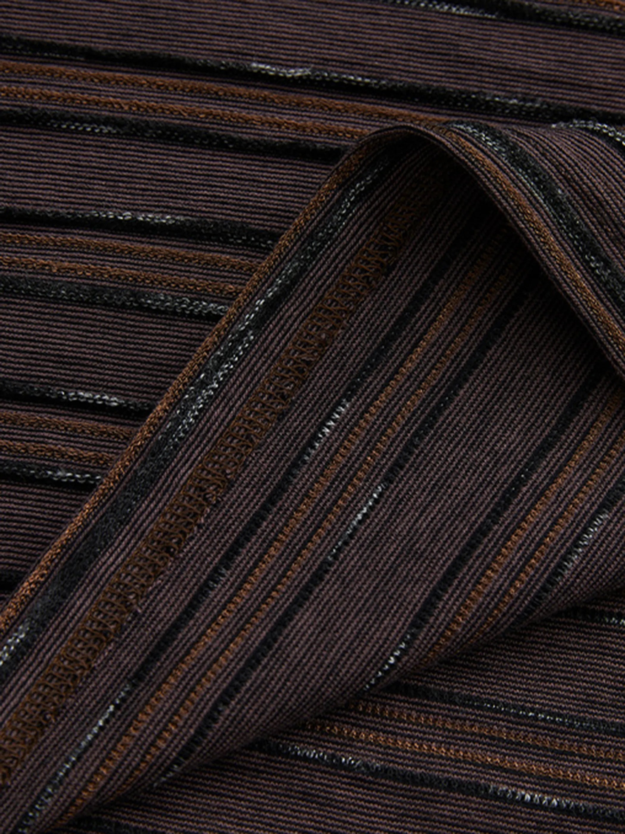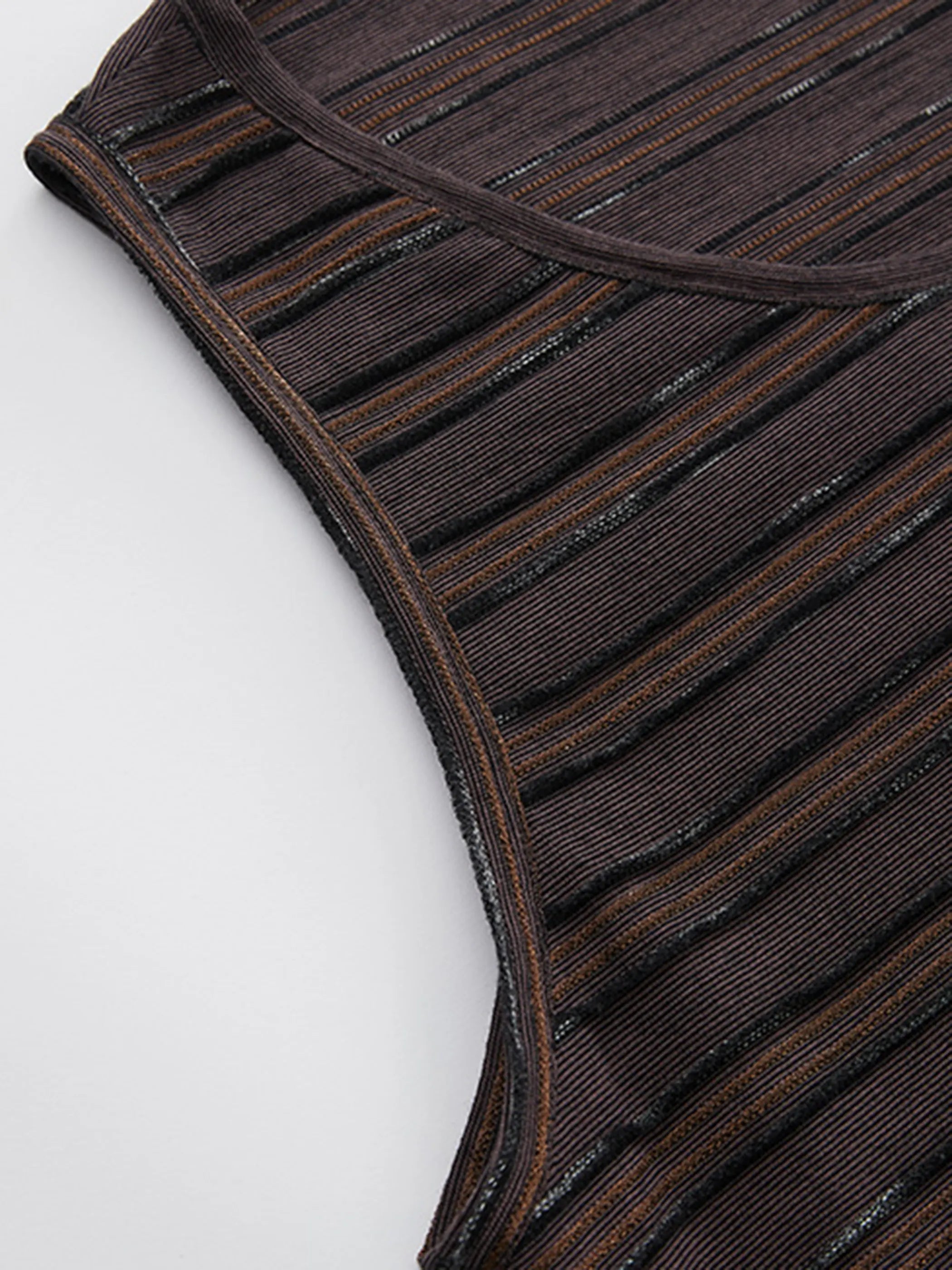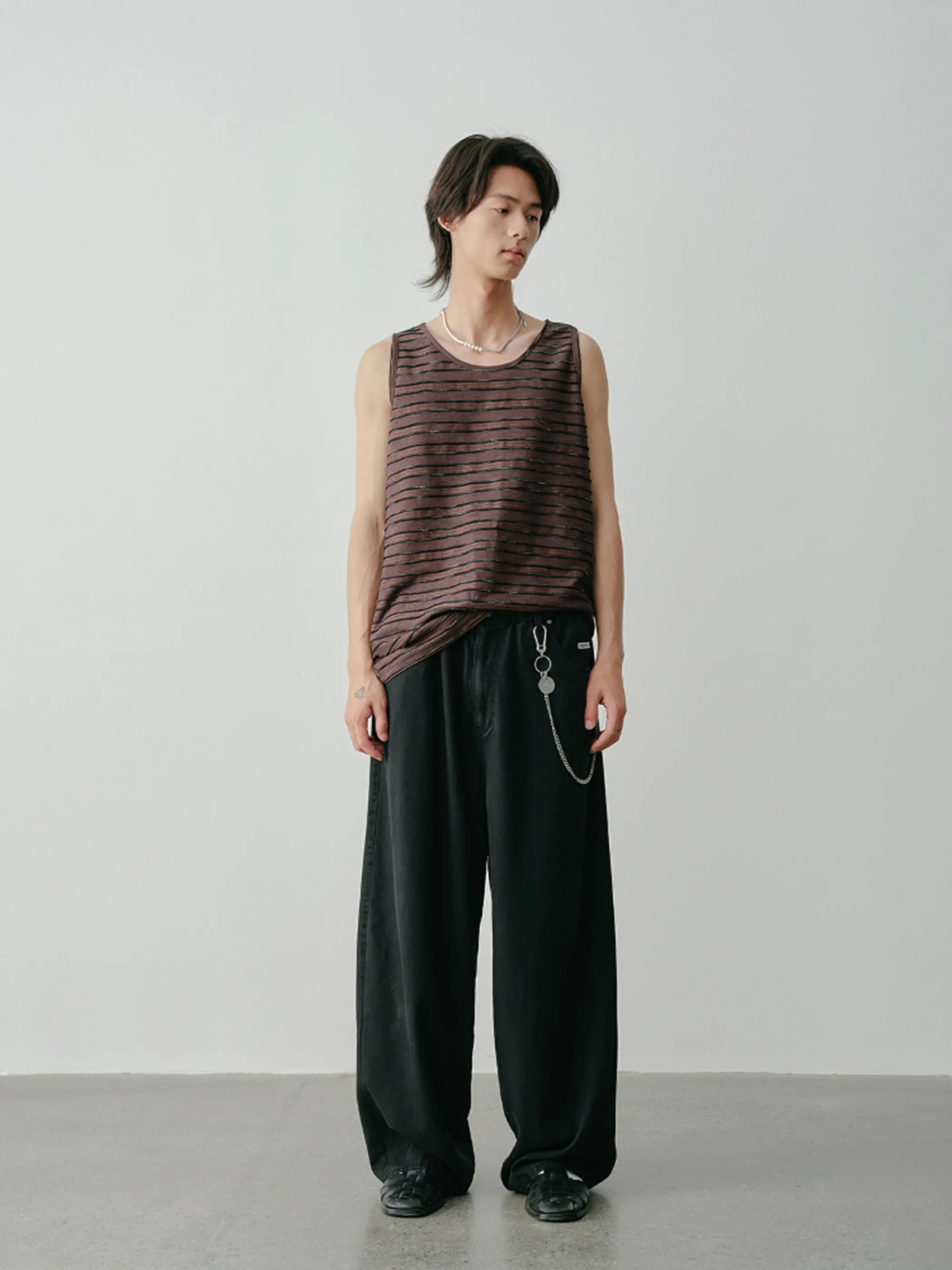 肌触りの良い65.6%コットンにTR混紡の程よいハリとポリエステルの耐久性を加えた170gのジャカード素材は、通気性と形保持性を両立し、着脱しやすいクルーネック&ノースリーブで真夏のインナーにも単品にも最適。深ブラウンをベースに多色ストライプを織り込むことで、シンプルながらも奥行きのある表情を生み出し、ショーツからスラックスまであらゆるボトムと調和する大人のカジュアルスタイルを実現する。