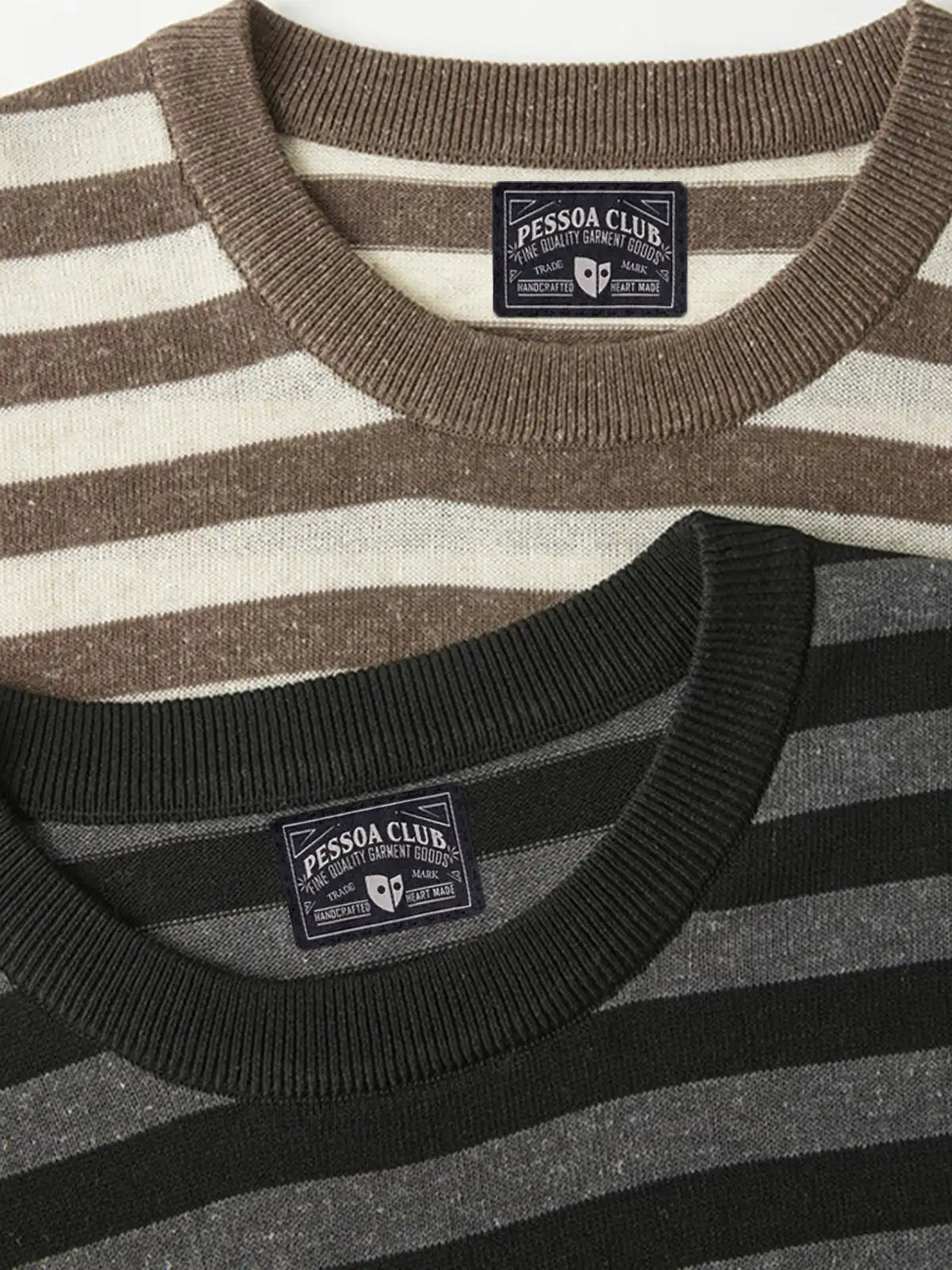 天然植物繊維を贅沢に配合した爽やかな肌触りと品のあるボーダーが魅力のクルーネックニットTシャツ。