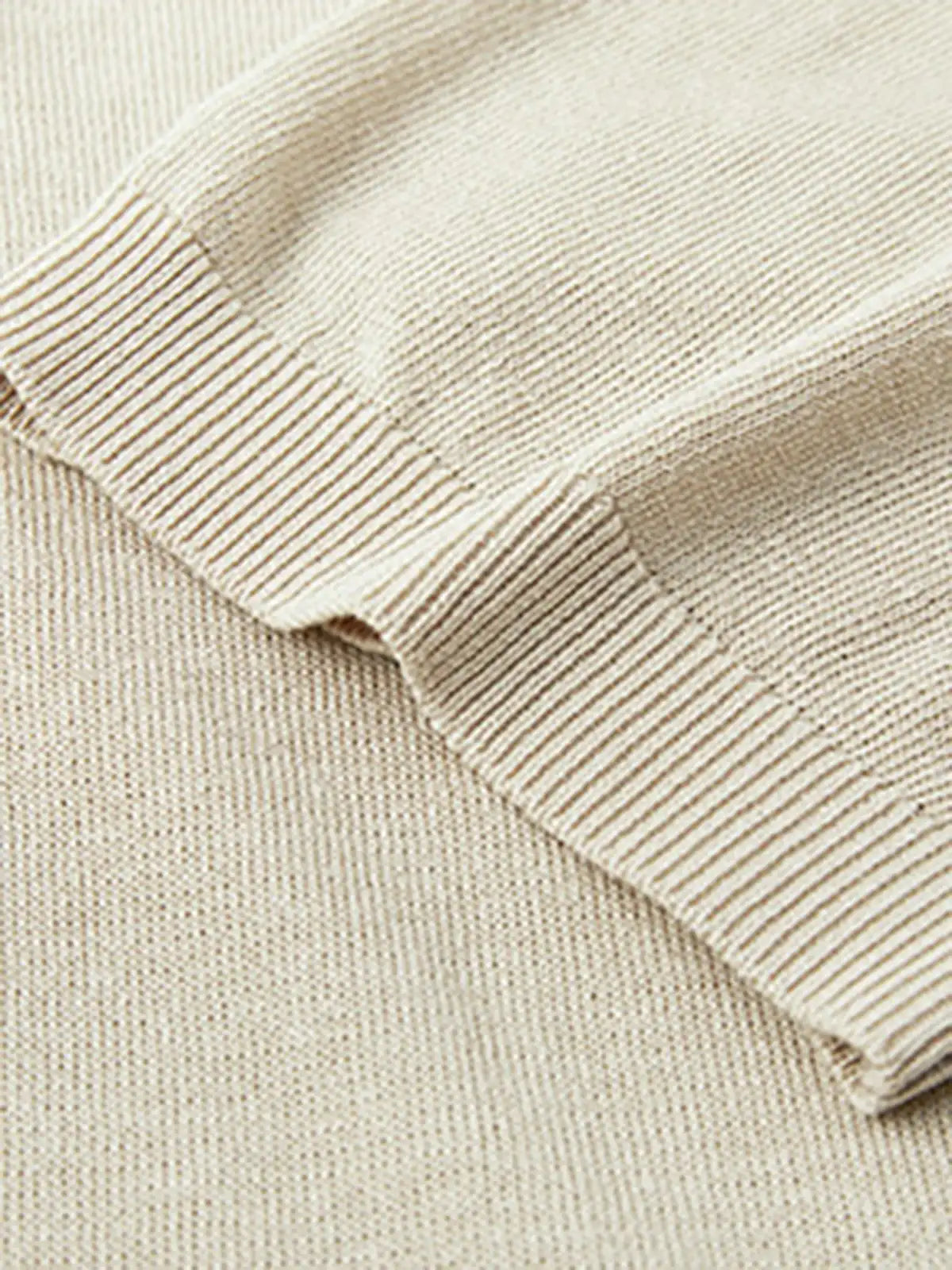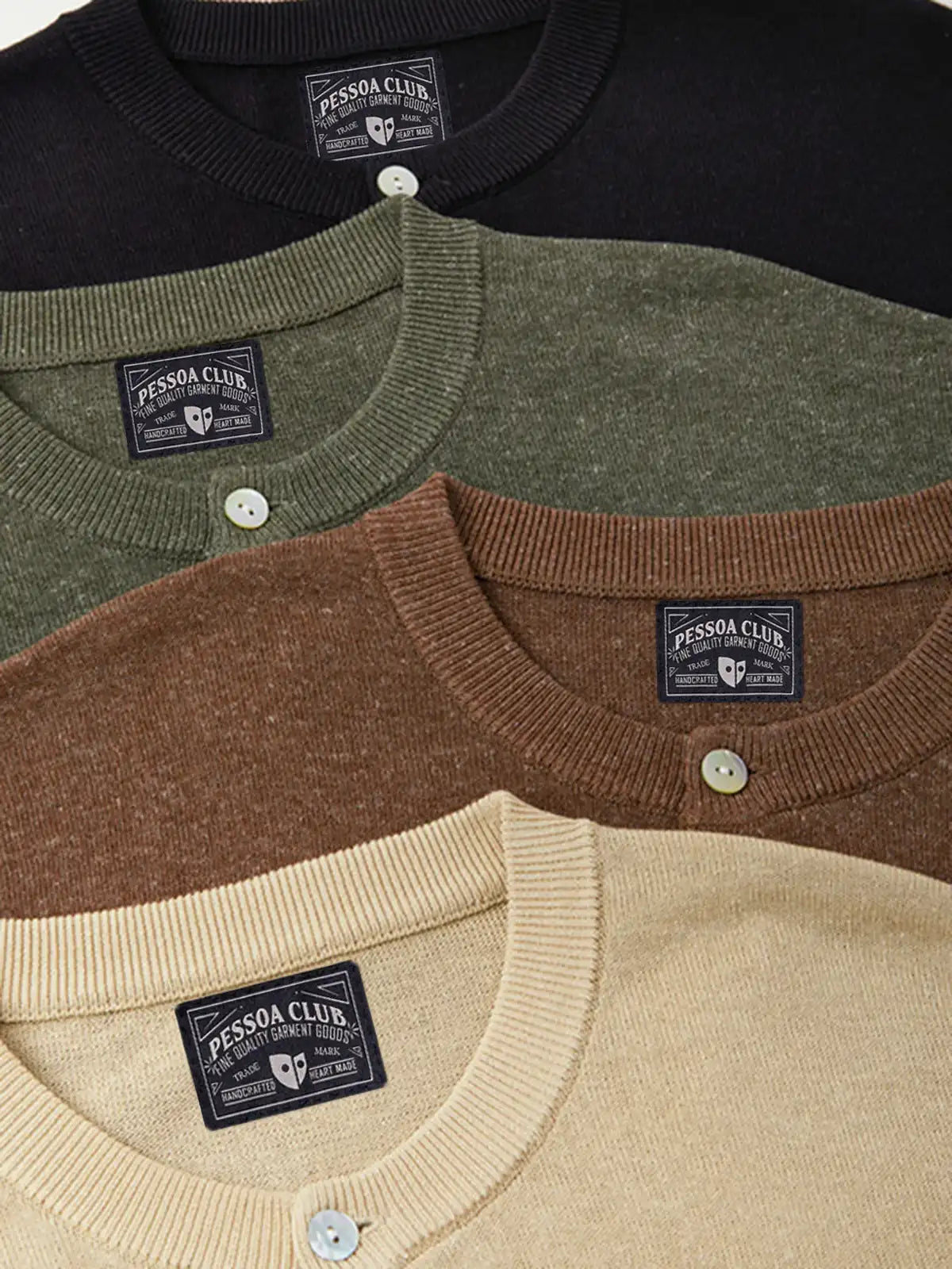 14ゲージの緻密なコンピューターニットで編み立てた生地は、46.7%アクリル/42.4%レーヨン/10.9%リネンの混紡により、レーヨンのしっとりとした吸湿性とリネンの通気性を両立。控えめなヘンリーネックのボタン開閉とリブ編みのネック&袖口が上品なアクセントを与え、シンプルなデザインながらビジネスカジュアルから週末のリラックススタイルまで幅広く活躍します。