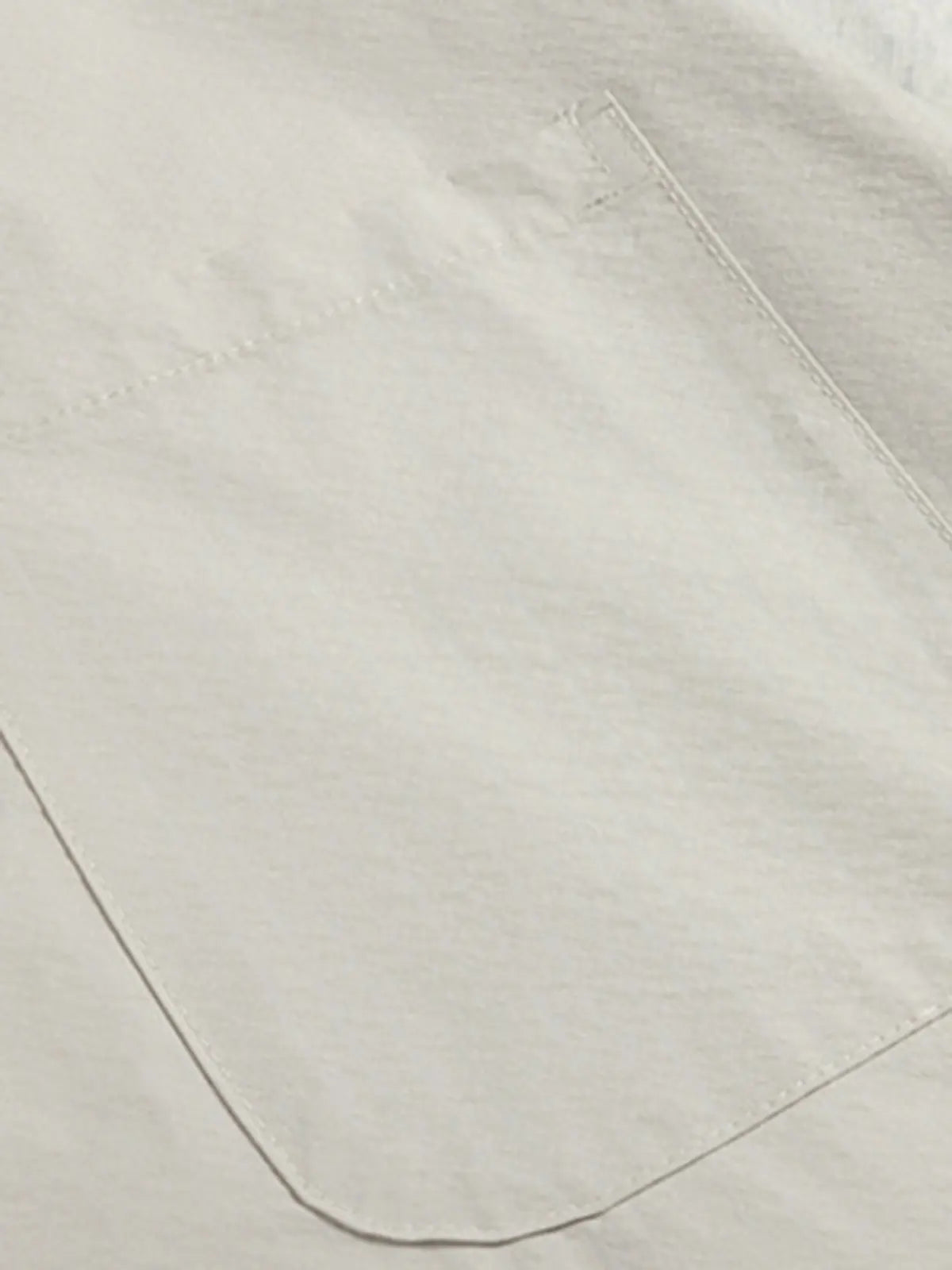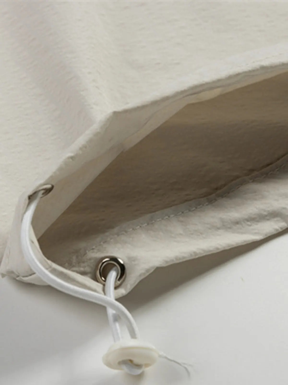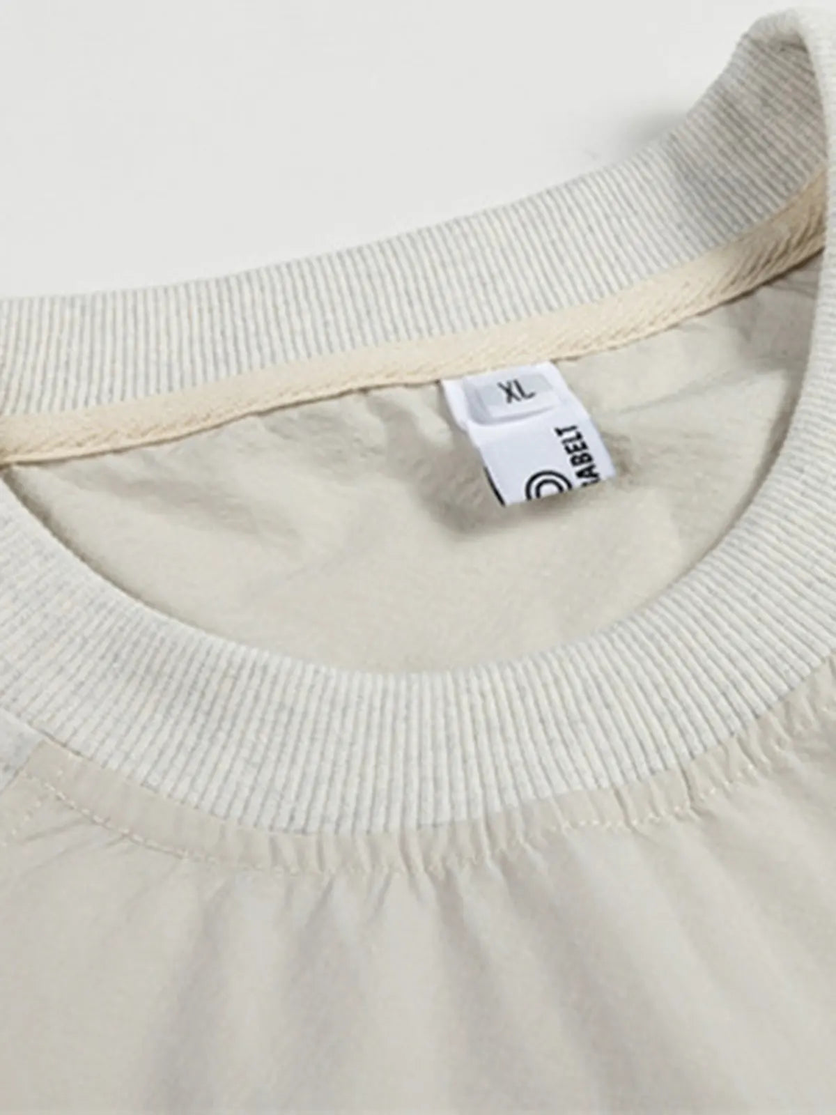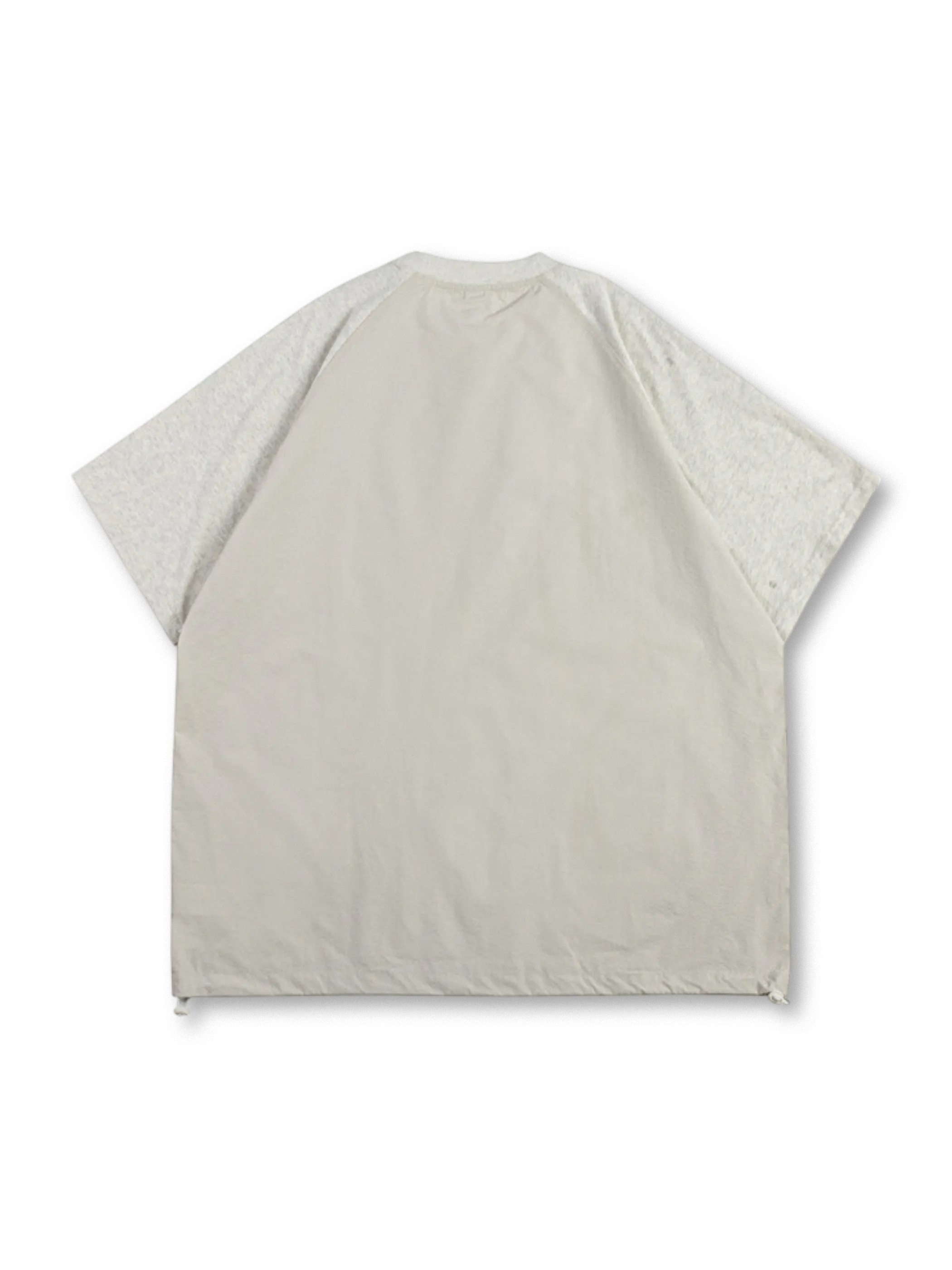 身頃は撥水性のあるポリエステル、袖と後ろ身頃は肌触り柔らかなコットン天竺を組み合わせた切り替えデザインが特徴。胸ポケットはスマホや小物の収納に便利で、裾のドローコードでシルエット調整も自在。ラグランスリーブとドロップショルダーによるボクシーなフィット感は、レイヤードにも単体着にも最適で、タウンからフィールドまで幅広いシーンで活躍します。