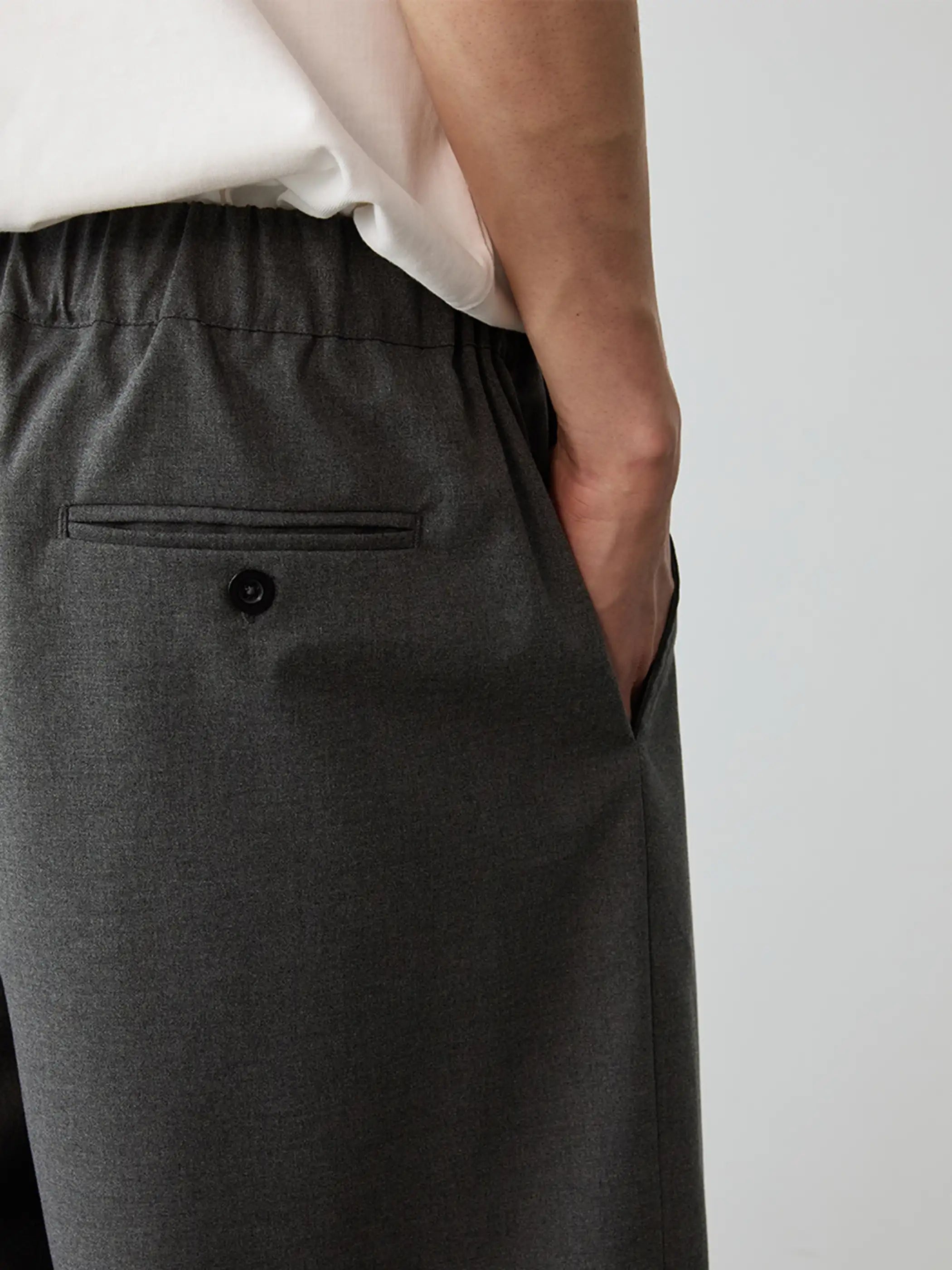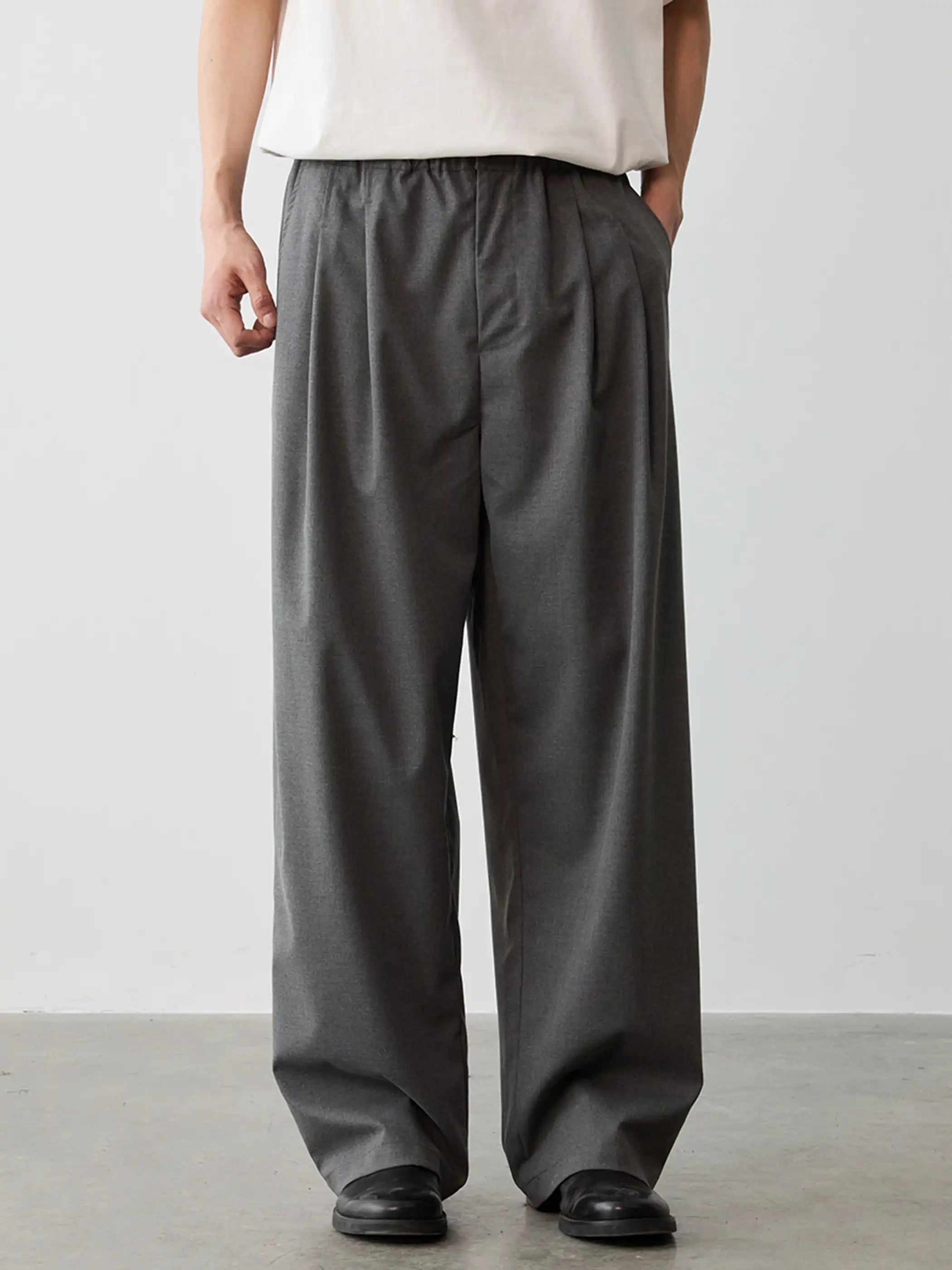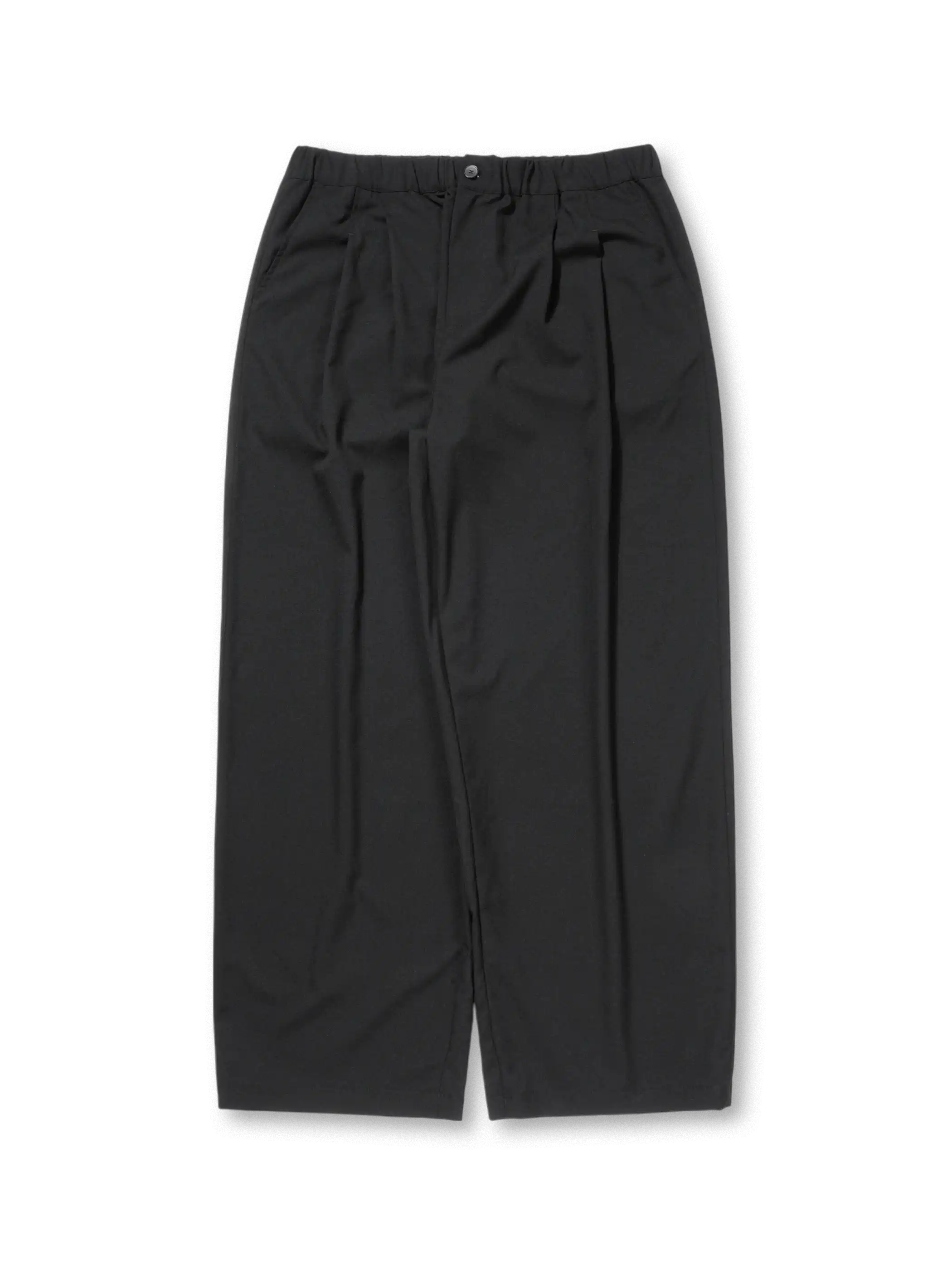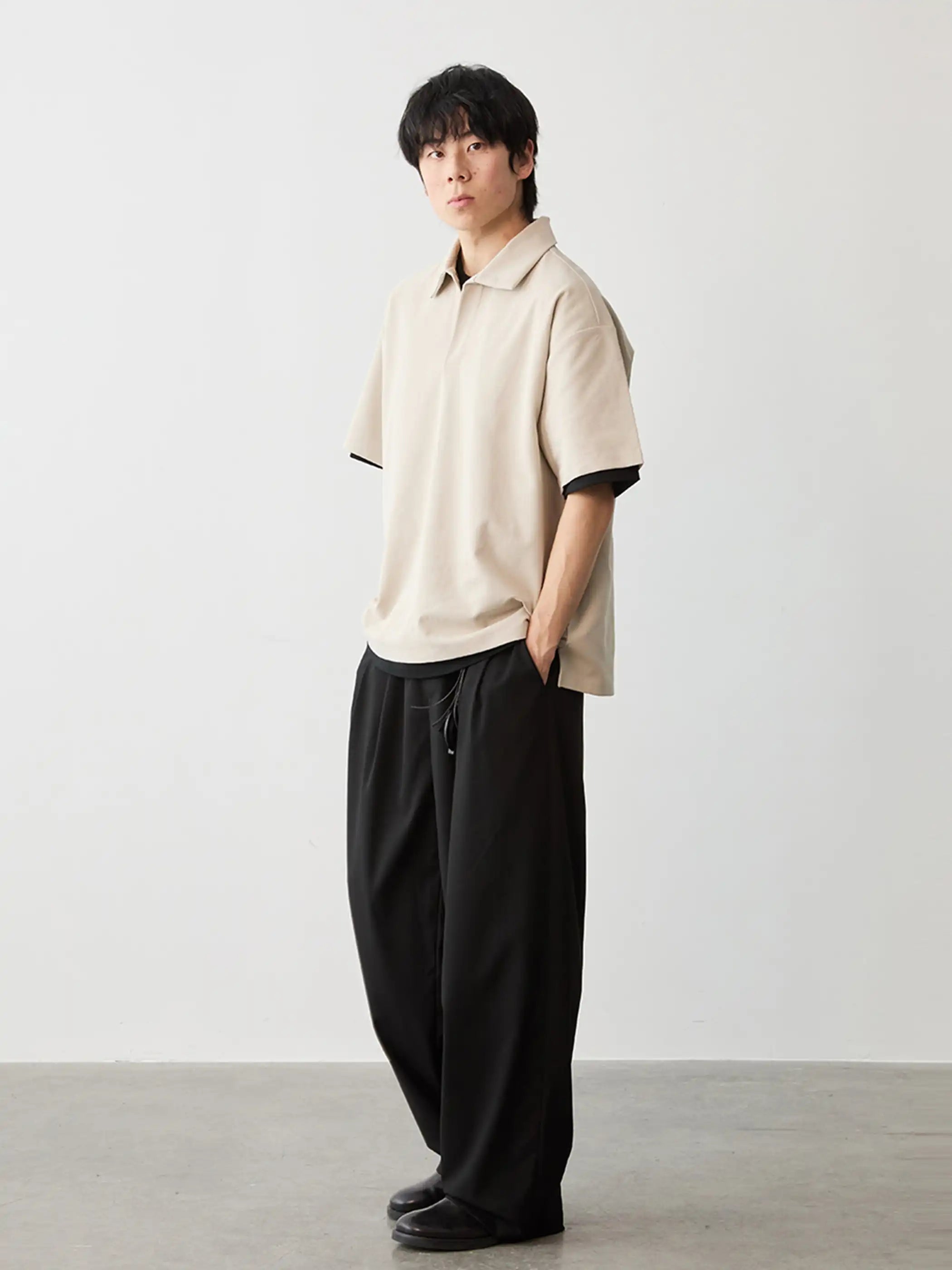 ウエストはゴムと内側のドローコードにより、スムーズな着脱と適度なフィット感を調整可能。フロントにダブルプリーツを入れ、斜めポケットを配置することで、デザイン性と利便性を両立しました。ポリエステル100%の生地は抗シワ性と落ち感に優れ、年間を通じて快適に着用できるのが特徴。脚幅にゆとりを持たせたワイドシルエットながら、縫製の丁寧さと前後のラインがすっきりとした印象をキープし、通勤スタイルからオフタイムまで幅広く活躍するアイテムです。